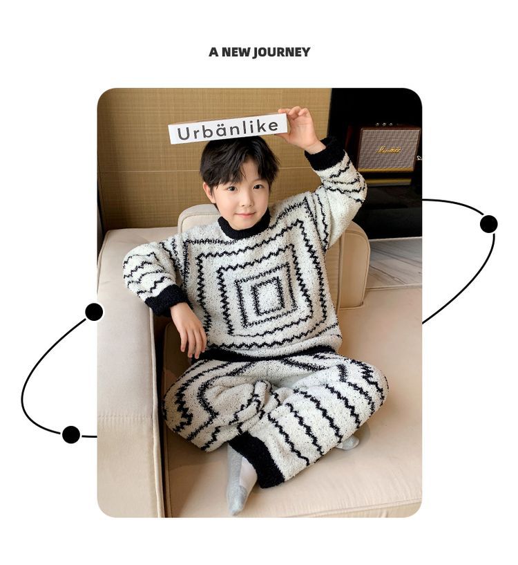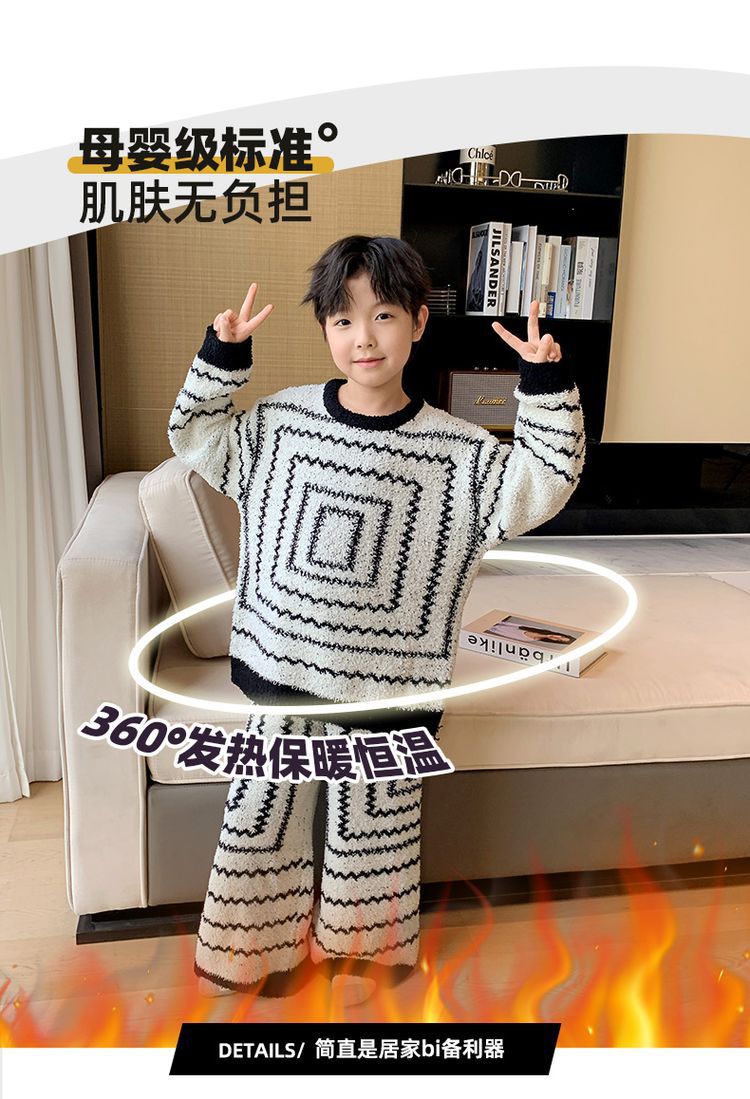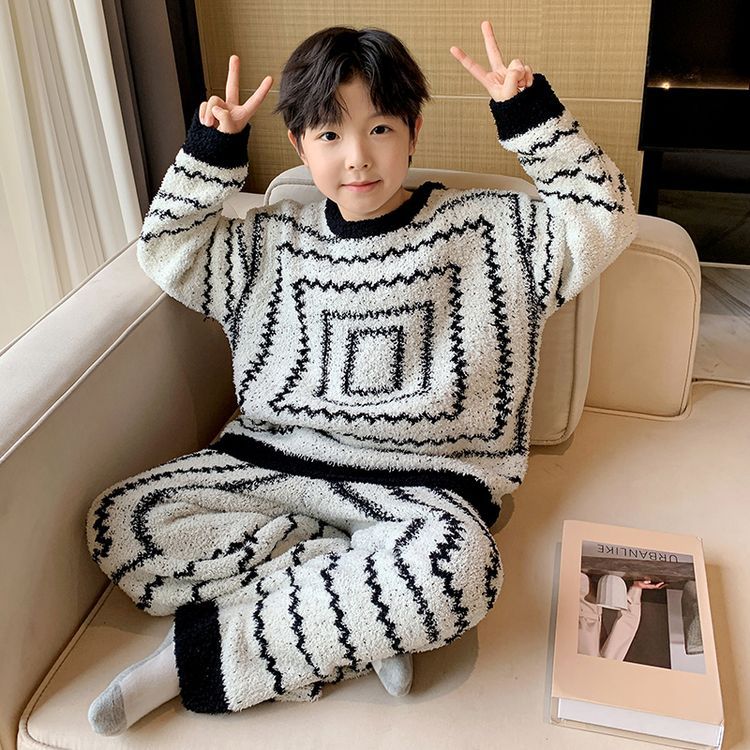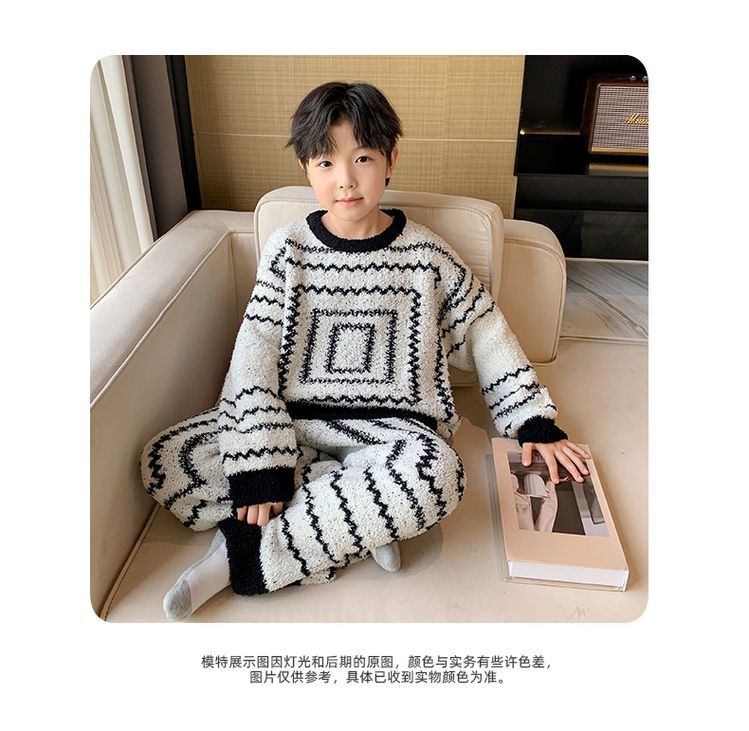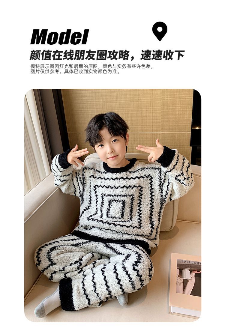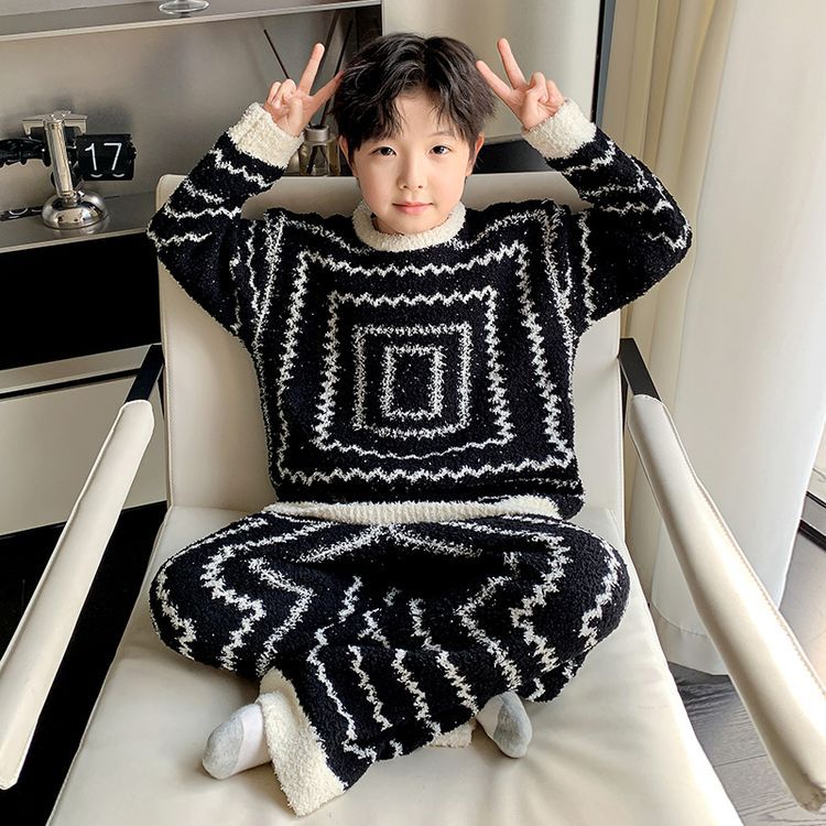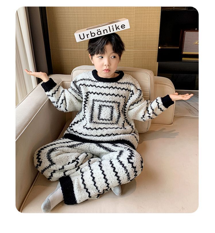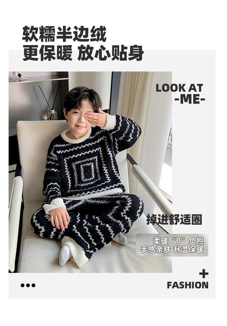 남학생 반쪽 벨벳 홈 의류 겨울 두꺼운 따뜻한 미들 및 큰 어린이 캐주얼 풀오버 소프트 왁스 파자마 2 피스 세트스토어 가기