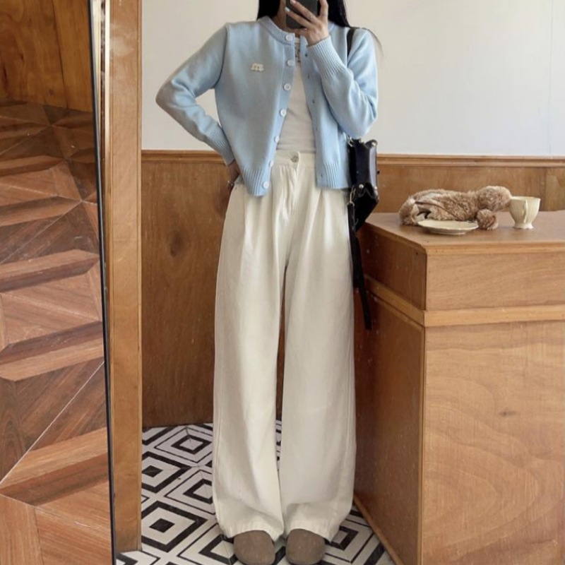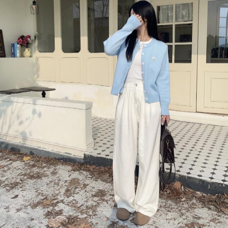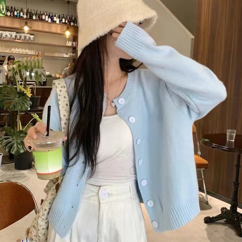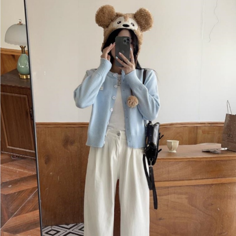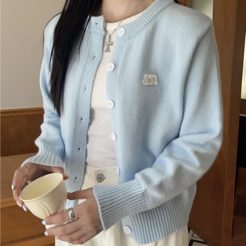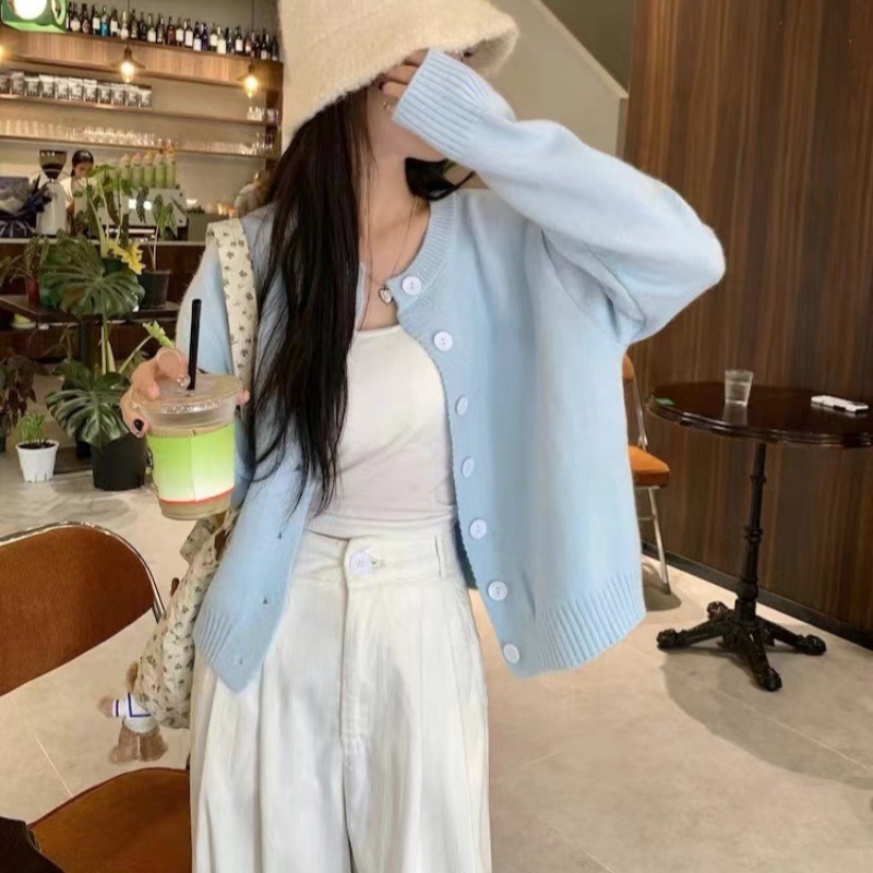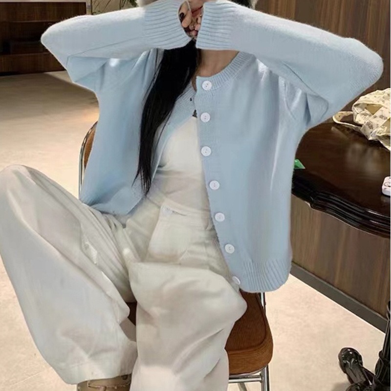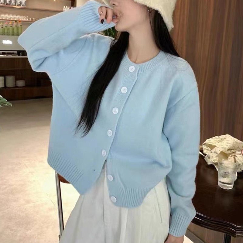 2024 봄과 가을 새로운 라이트 블루 긴 소매 니트 카디건 여성용 부드러운 스타일 밀크 부드러운 왁스 간단한 조커 짧은 머리스토어 가기