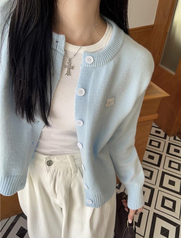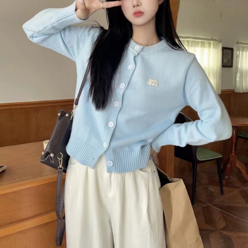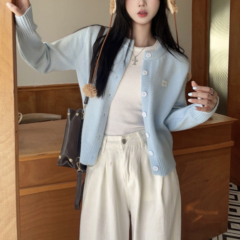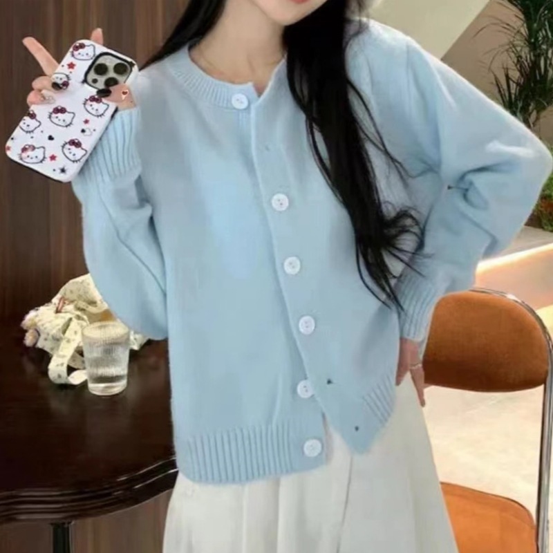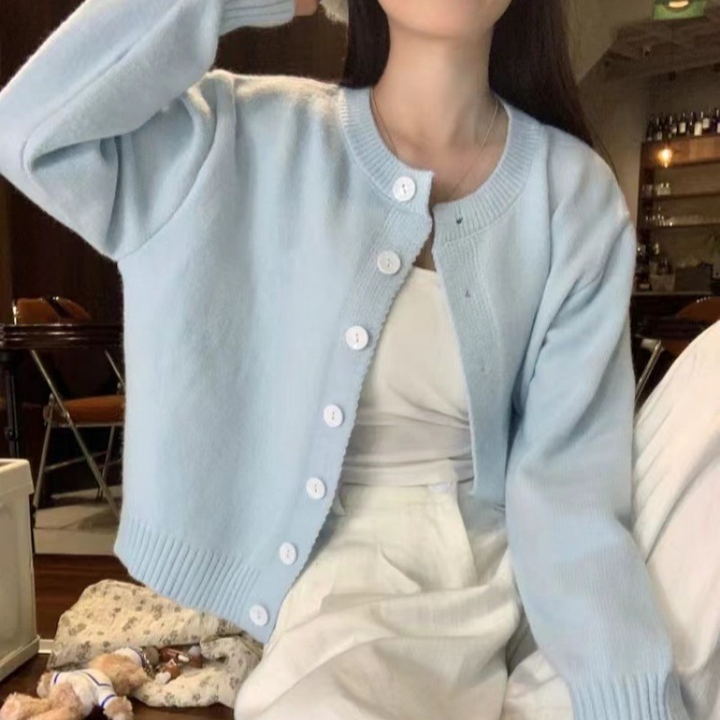 2024 봄과 가을 새로운 라이트 블루 긴 소매 니트 카디건 여성용 부드러운 스타일 밀크 부드러운 왁스 간단한 조커 짧은 머리