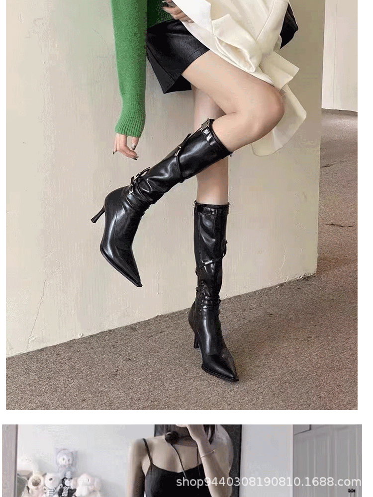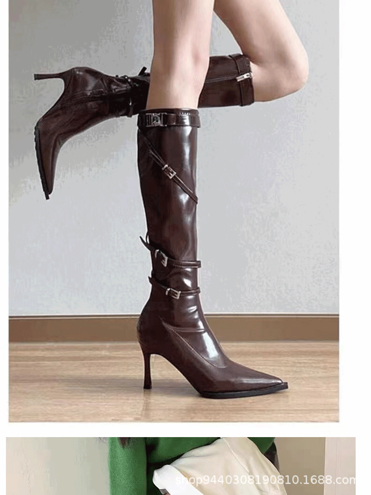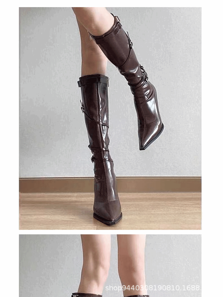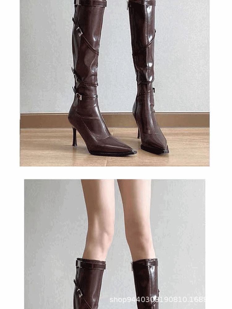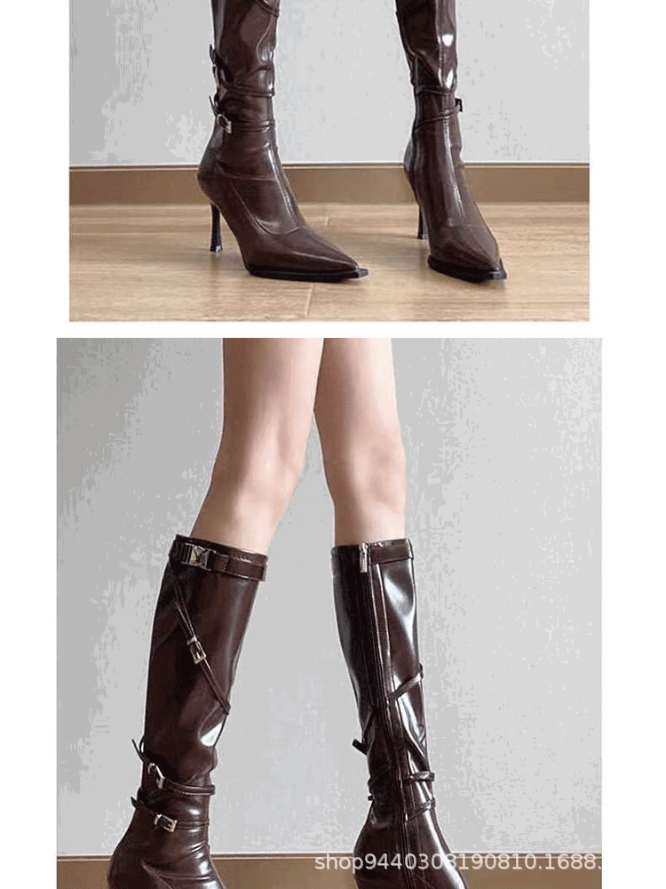뾰족한 하이힐 부츠 여성의 가을 2024 새로운 도착 벨트 버클 스트레치 얇은 부츠 작은 그림 얇은 높은 부츠스토어 가기
