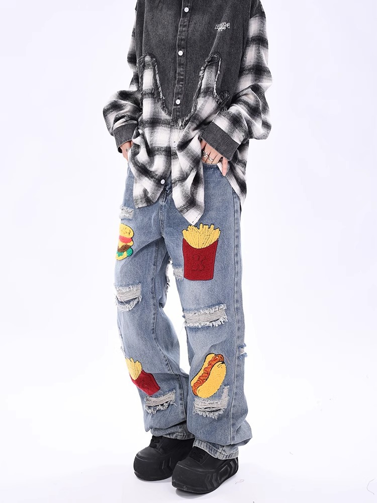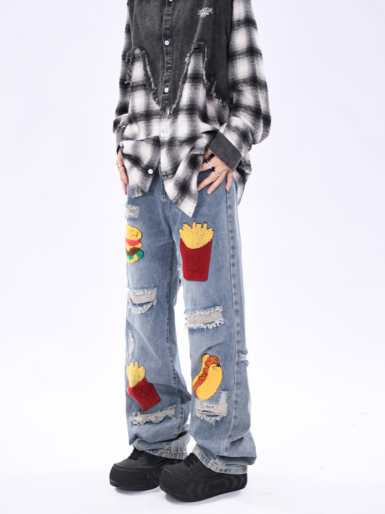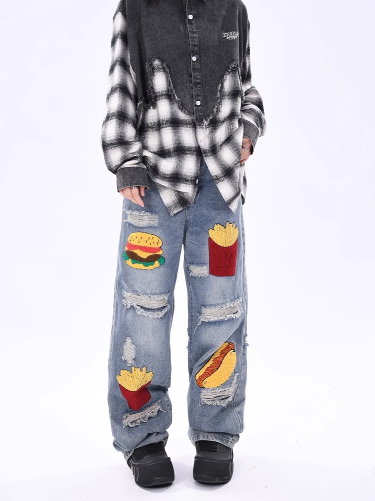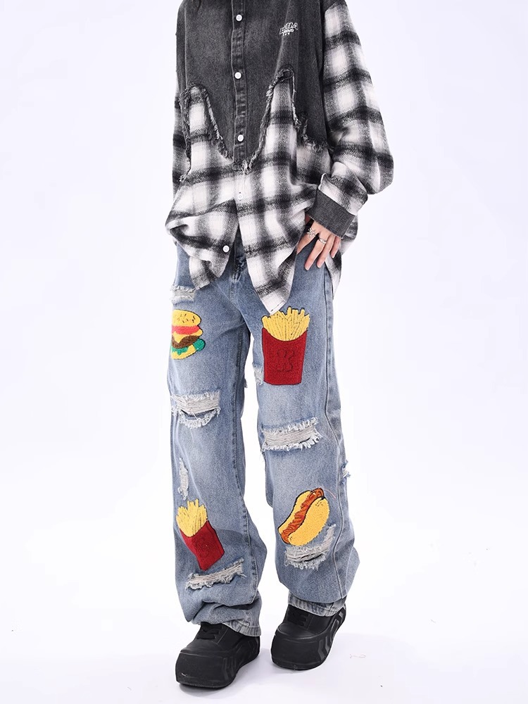 하이 스트리트 빈티지 버거 프라이, 자수 세척 된 청바지 남성 봄 새로운 느슨한 스트레이트 슬리밍 바지