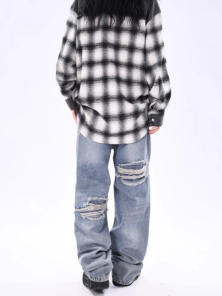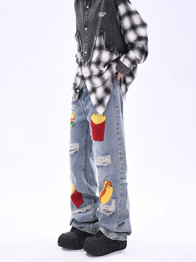 하이 스트리트 빈티지 버거 프라이, 자수 세척 된 청바지 남성 봄 새로운 느슨한 스트레이트 슬리밍 바지스토어 가기