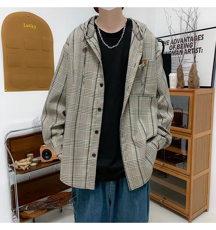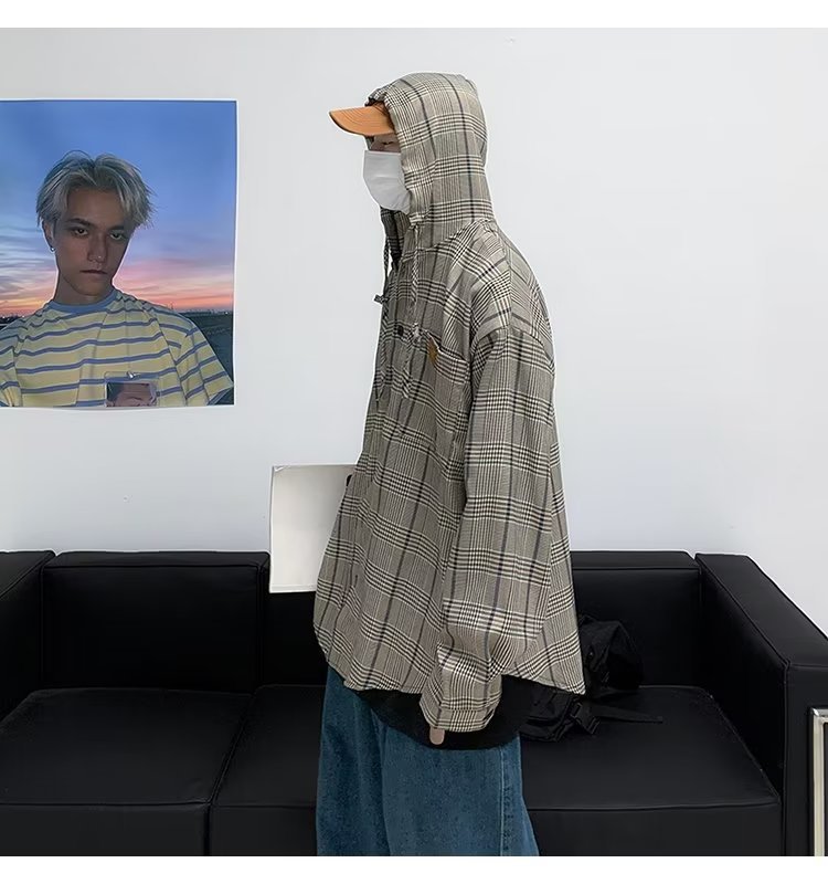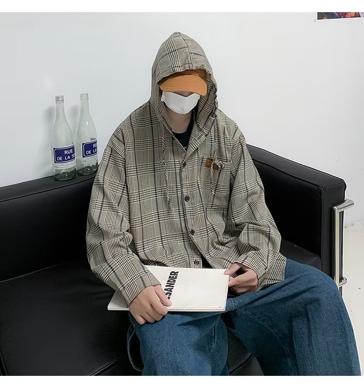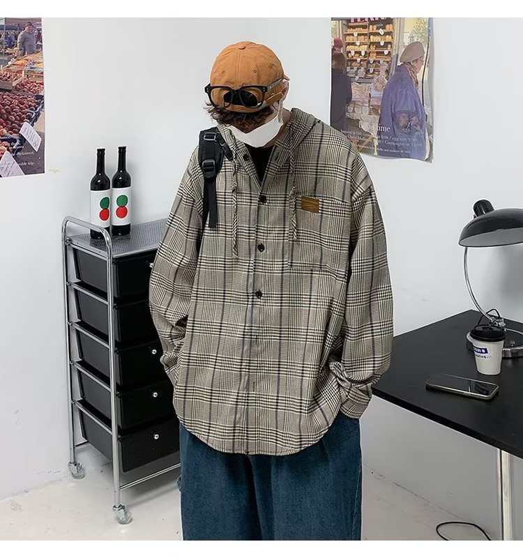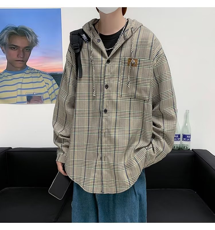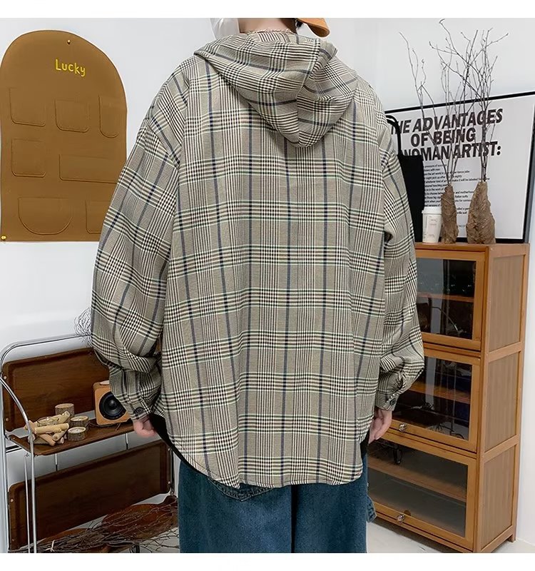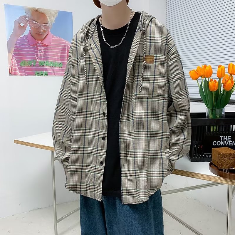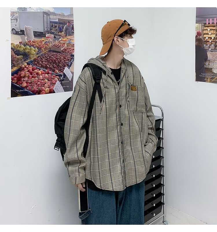 새로운 Ins 유행 레트로 체크 후드 셔츠 남자의 가을 느슨한 CEC 게으른 홍콩 스타일 긴 소매 셔츠 재킷