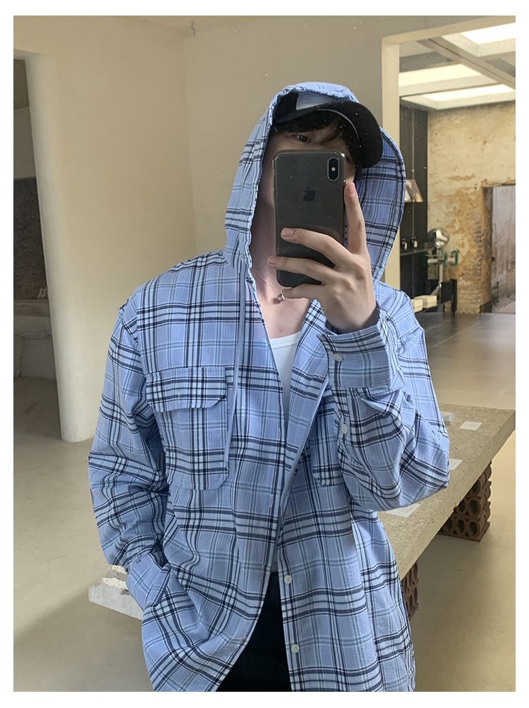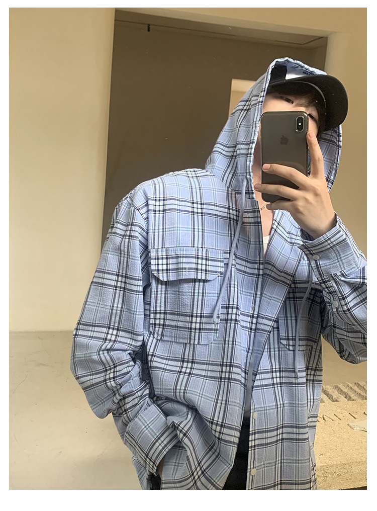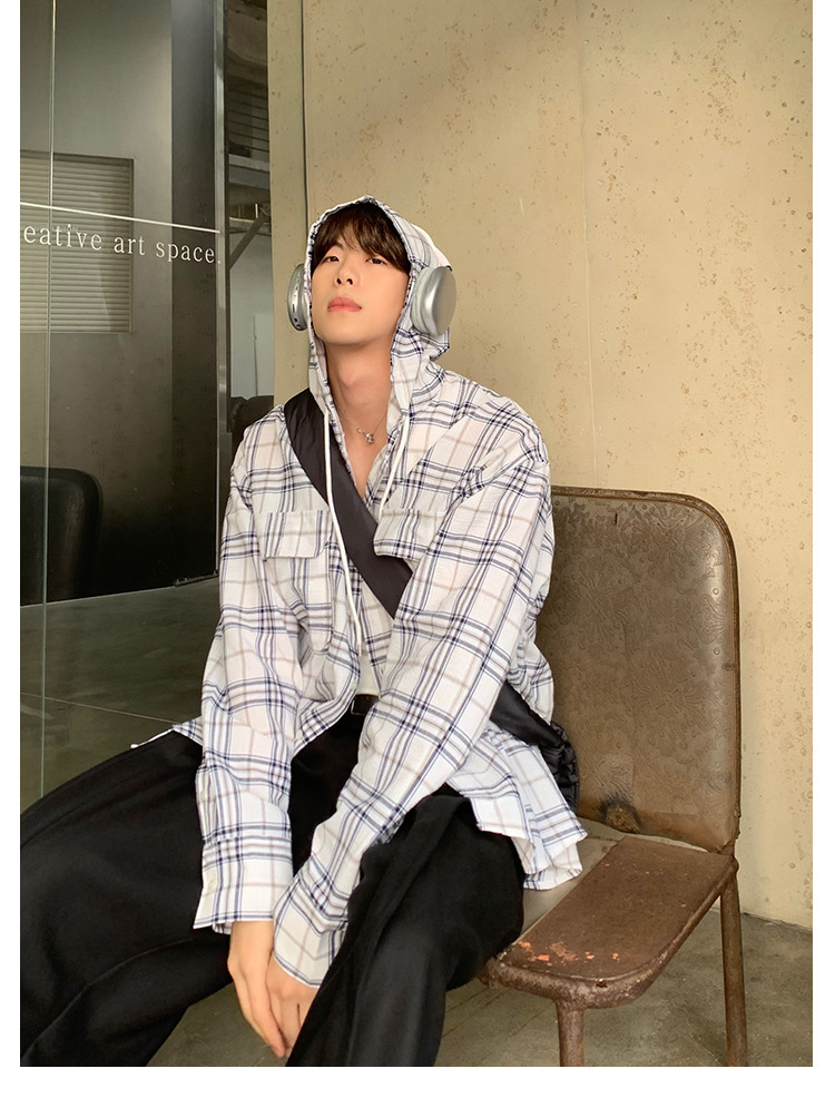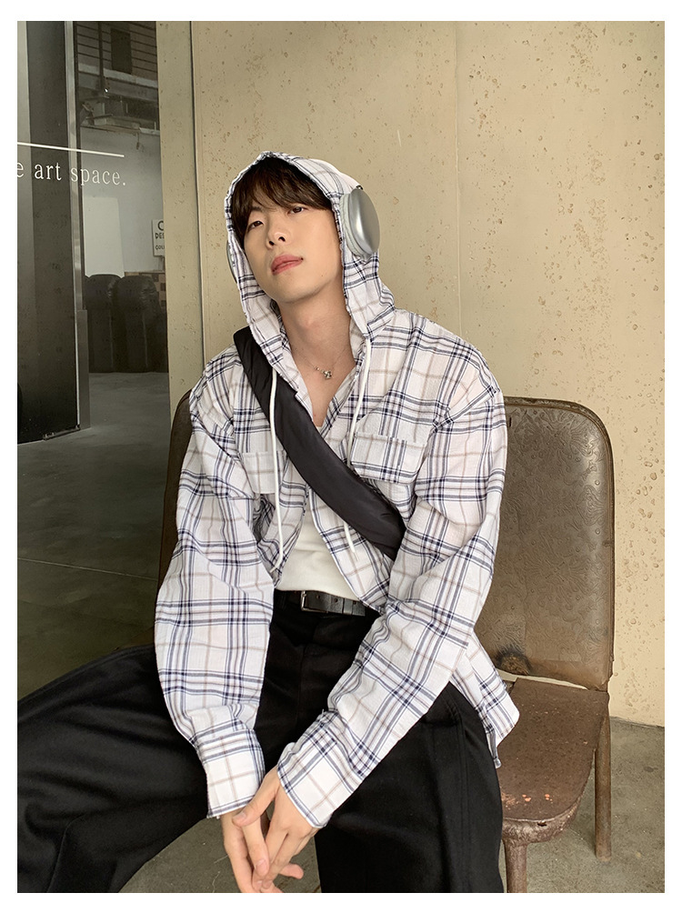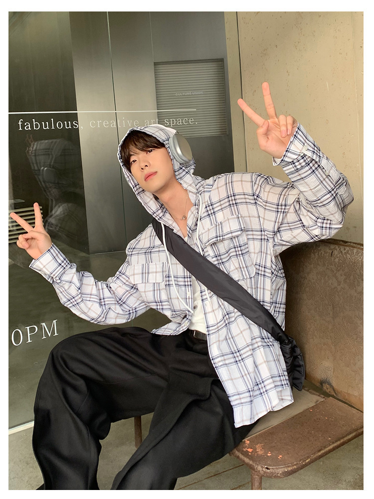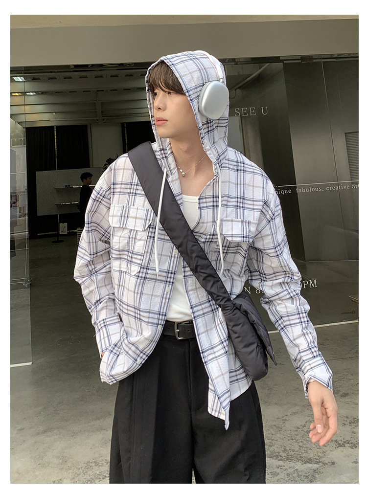 봄과 가을 2024 새로운 빈티지 후드 체크 셔츠 남자의 느슨한 올 매치 디자인 센스 캐주얼 후드 자켓