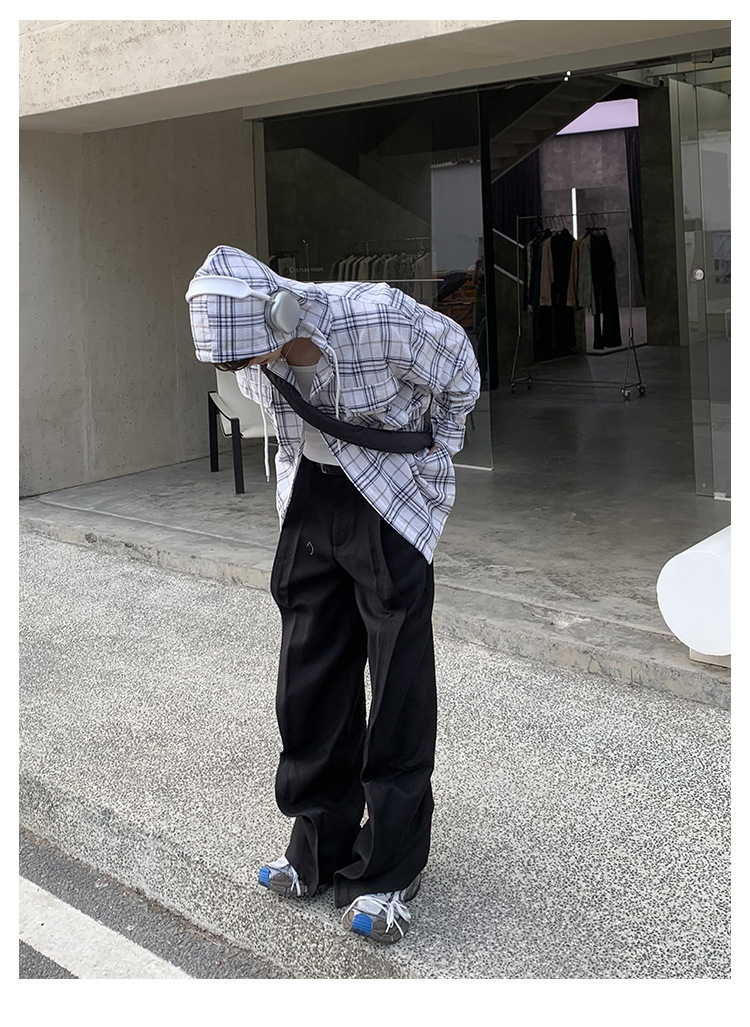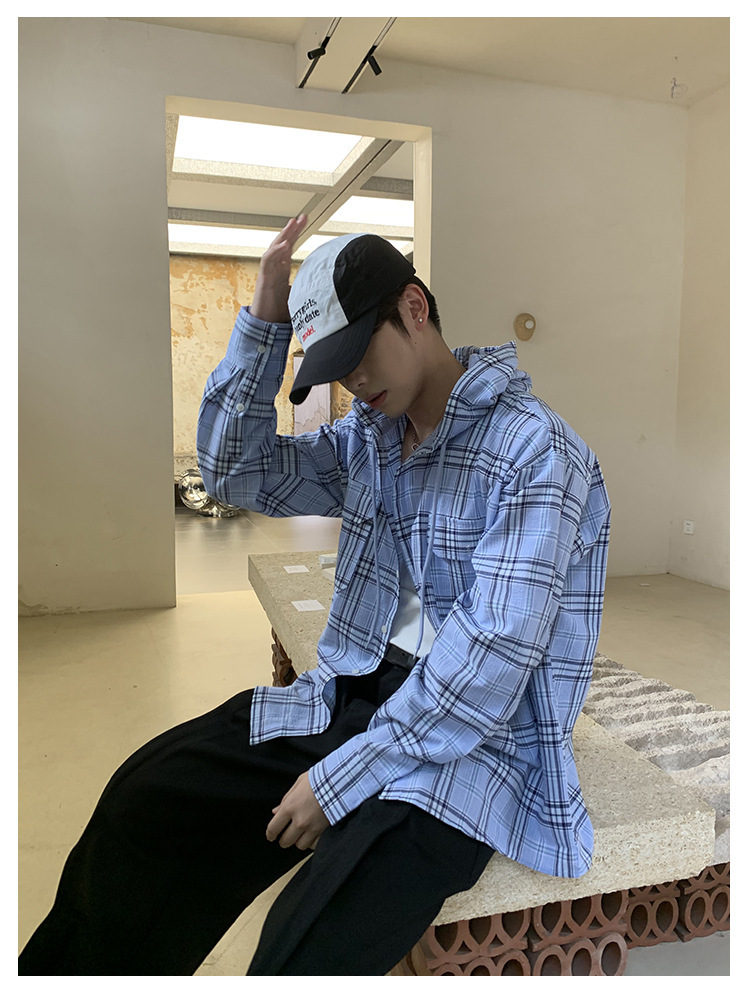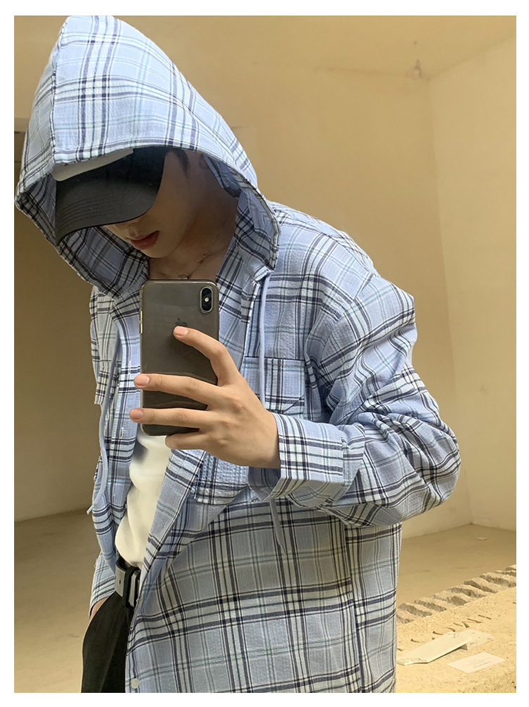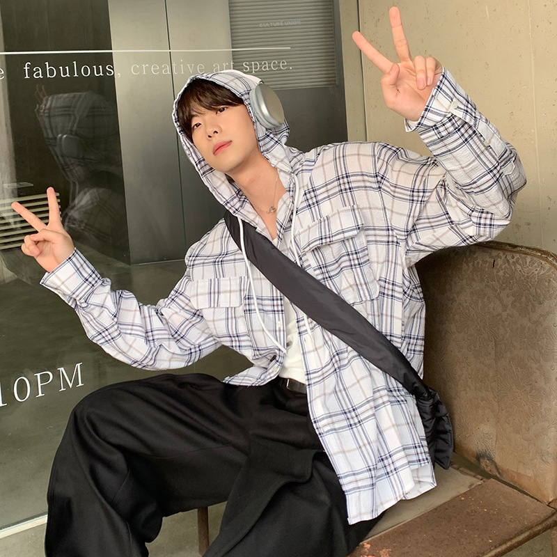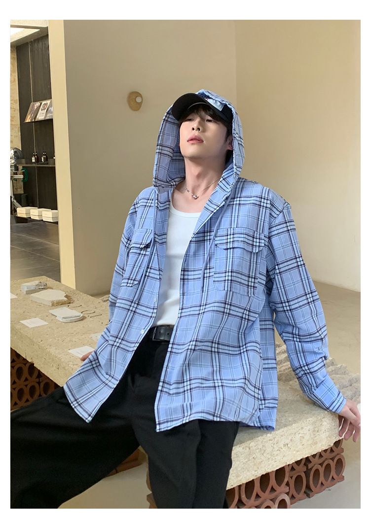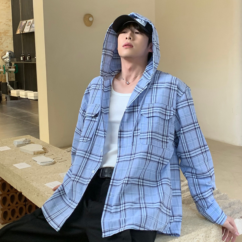 봄과 가을 2024 새로운 빈티지 후드 체크 셔츠 남자의 느슨한 올 매치 디자인 센스 캐주얼 후드 자켓