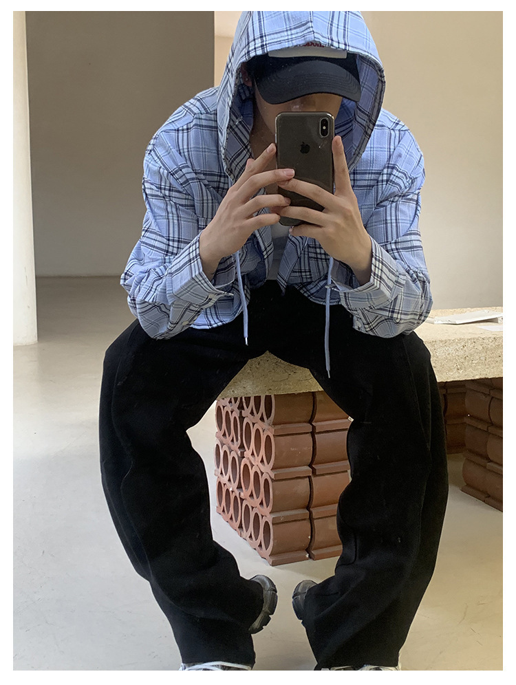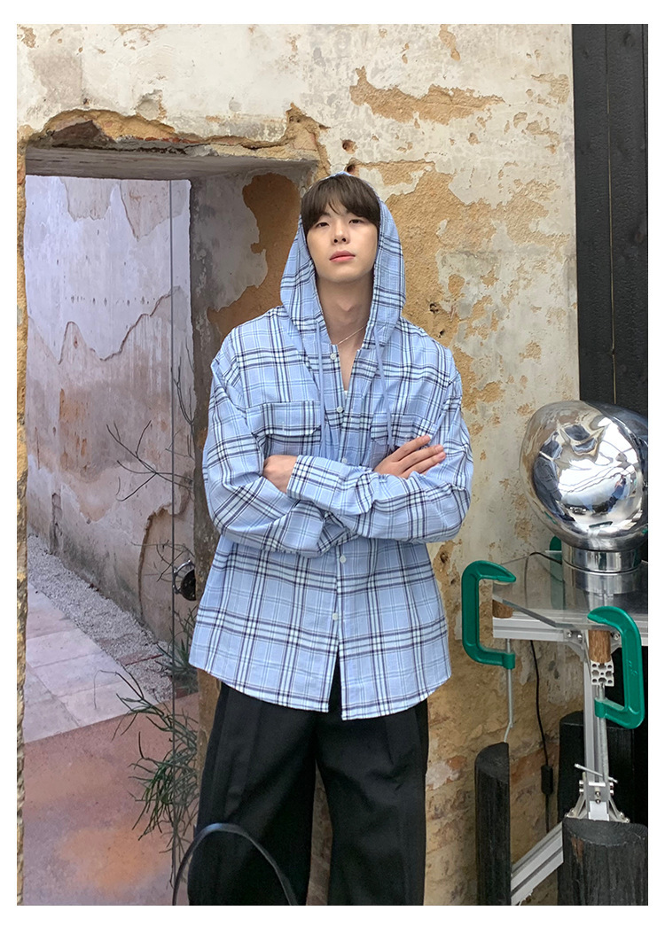 봄과 가을 2024 새로운 빈티지 후드 체크 셔츠 남자의 느슨한 올 매치 디자인 센스 캐주얼 후드 자켓스토어 가기