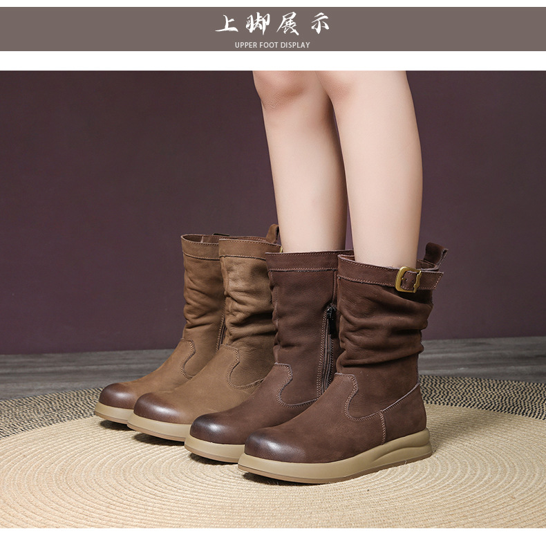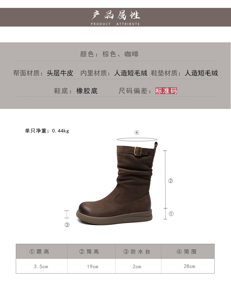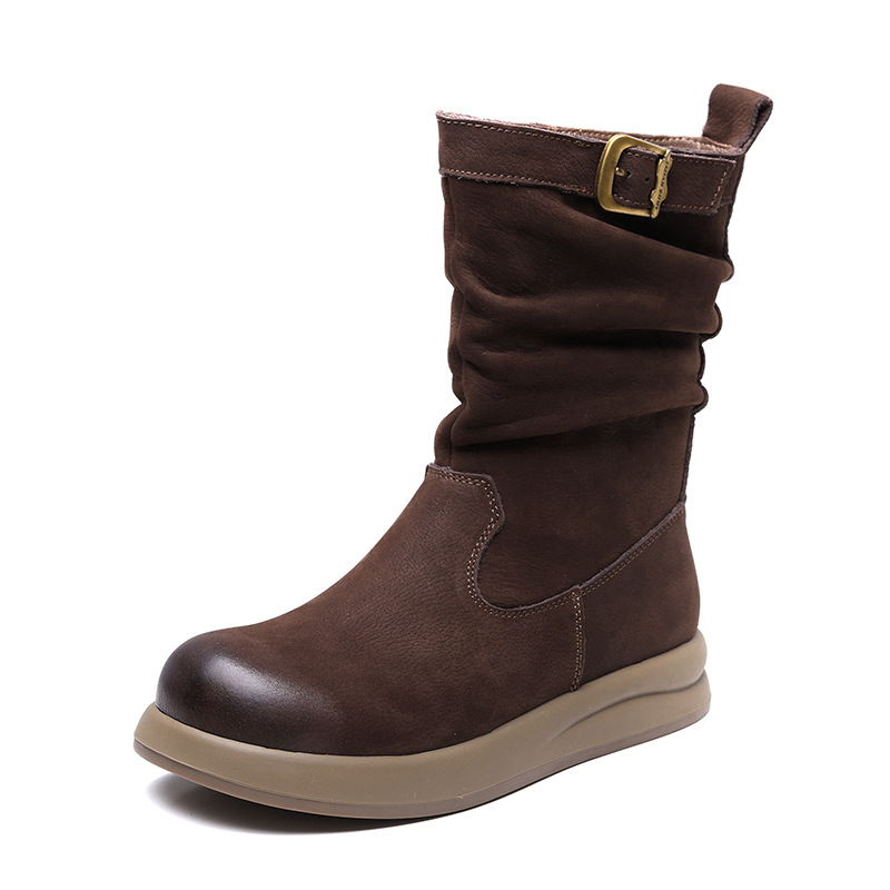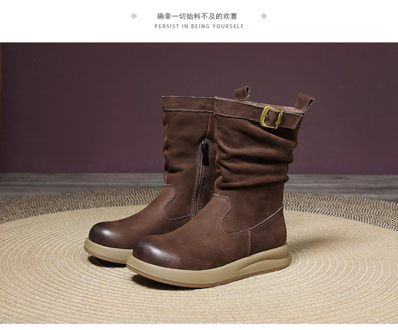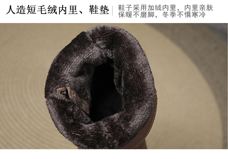 Delphinium 2024 가을과 겨울 새로운 첫 번째 레이어 소 가죽 복고풍 캐주얼 금속 버클 두꺼운 바닥 기모 따뜻한 면화 부츠