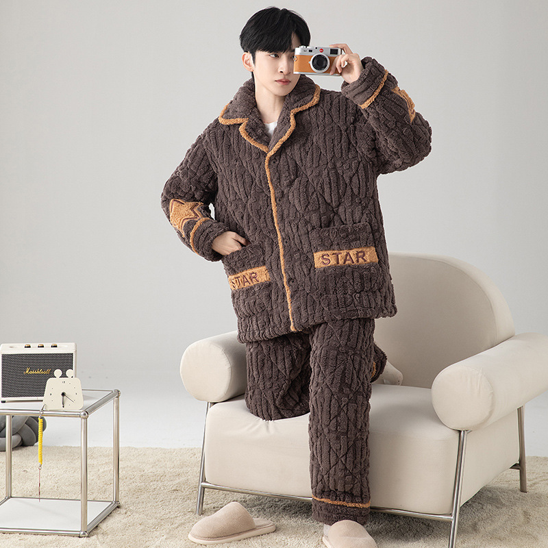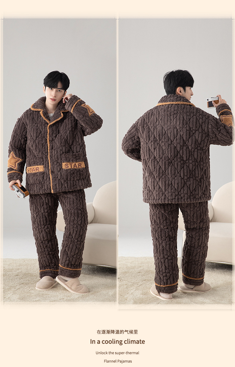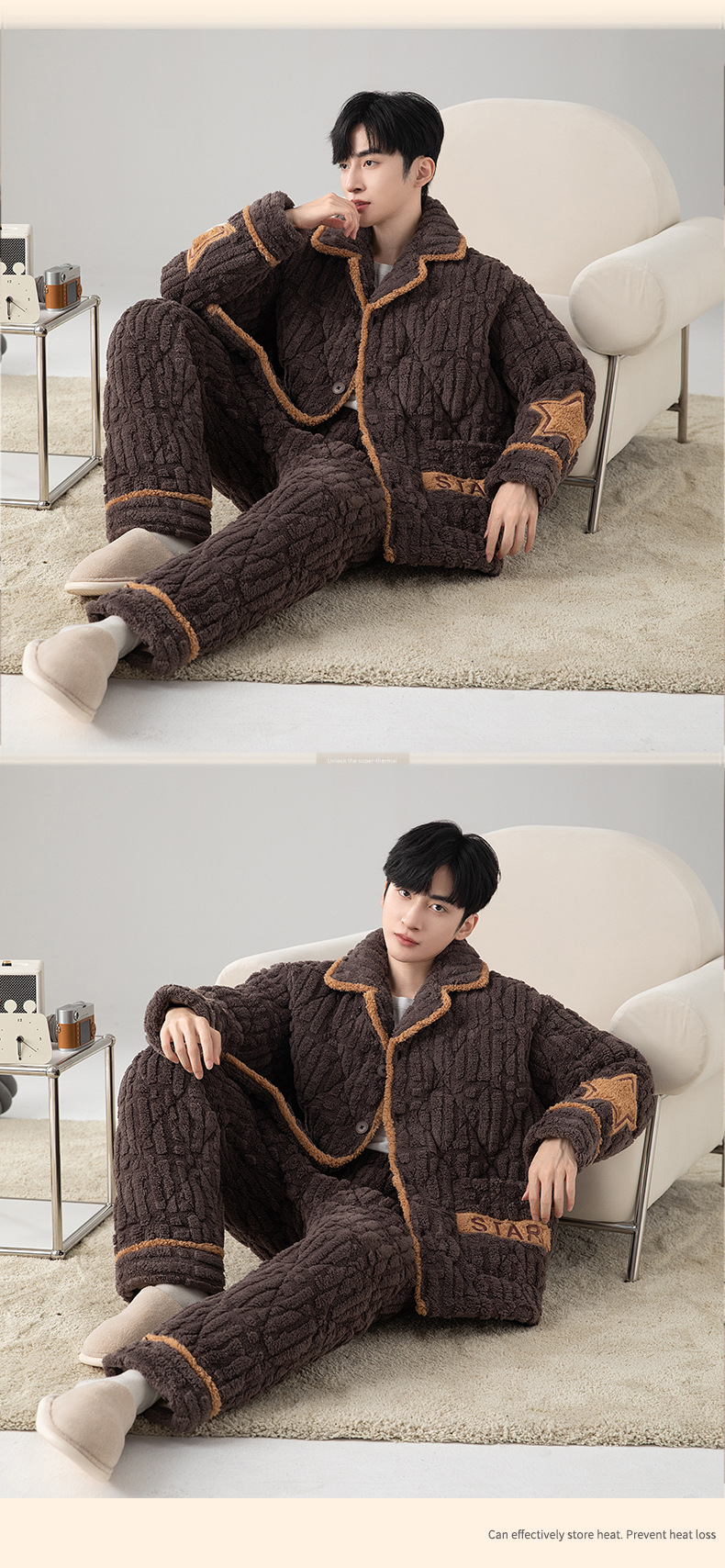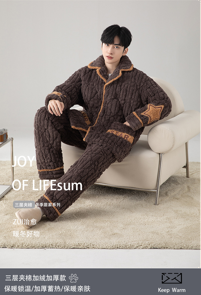 산호 양털 3 층 퀼트 파자마 남성 가을과 겨울이 기모 따뜻한 겨울 2024 새로운 홈 의류 세트