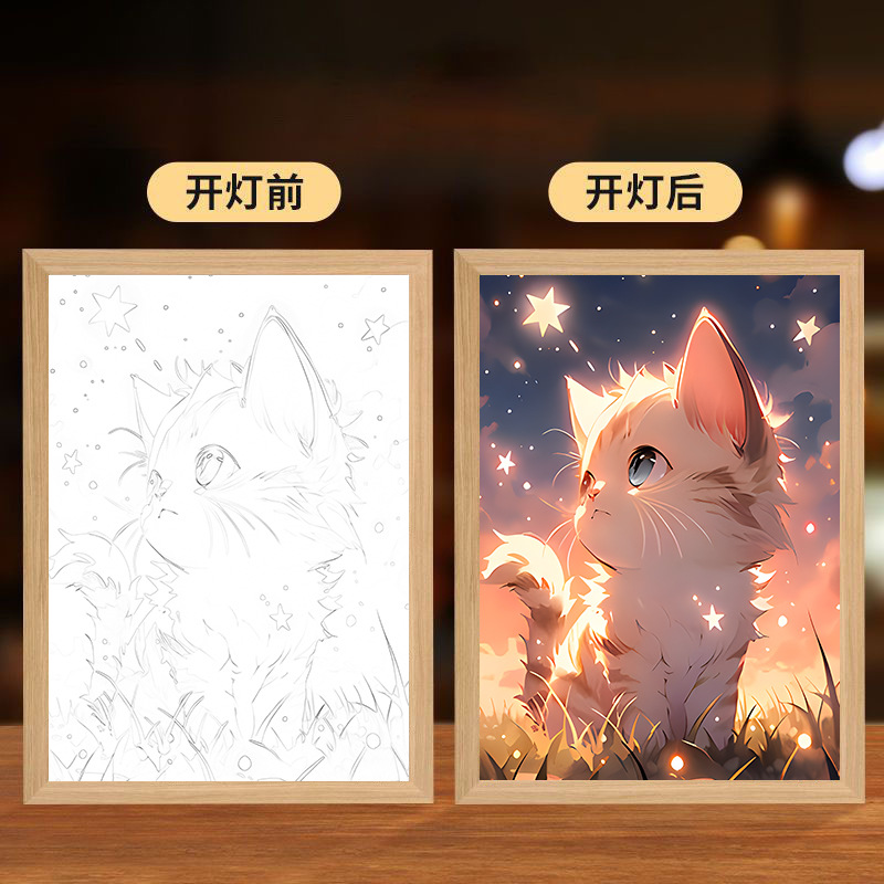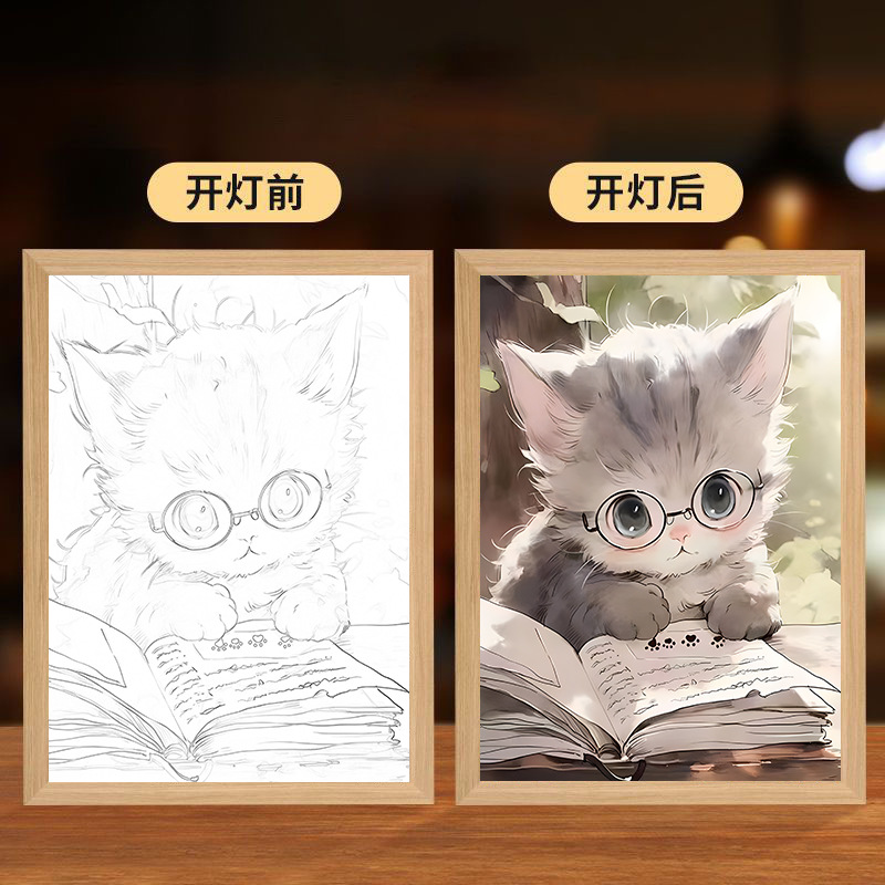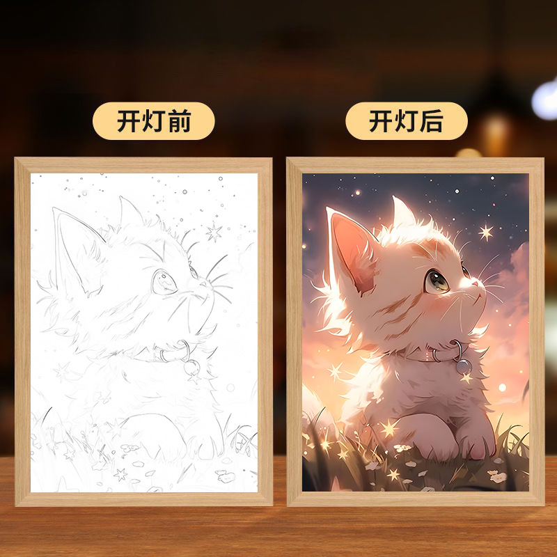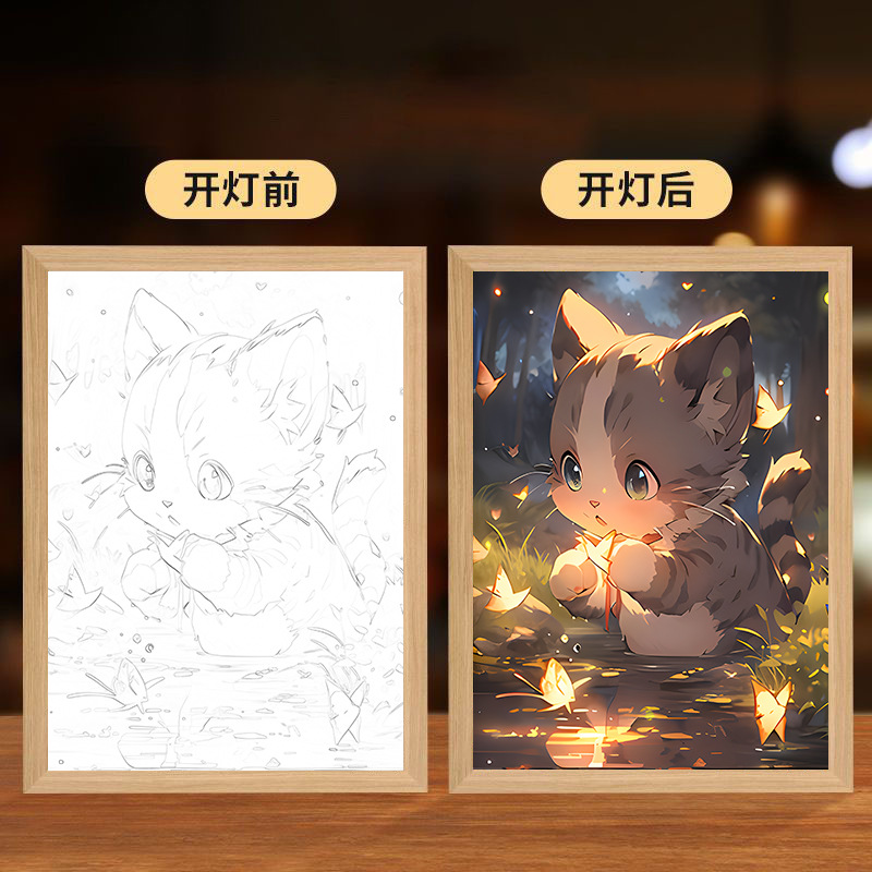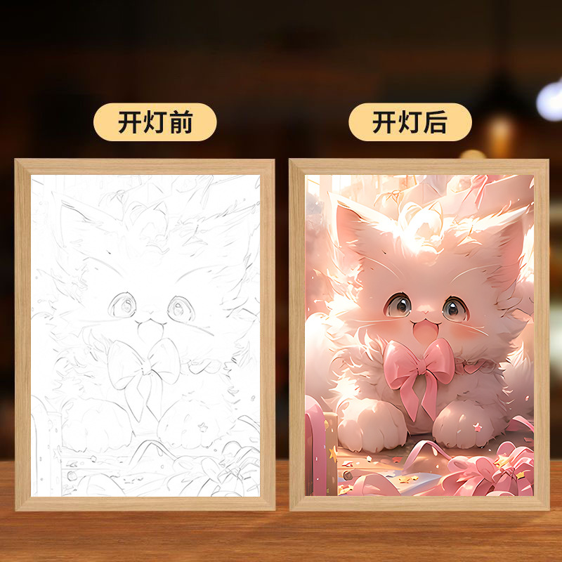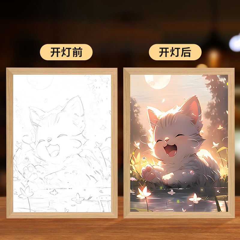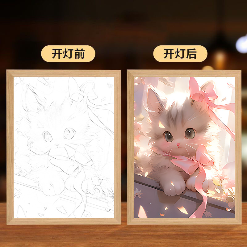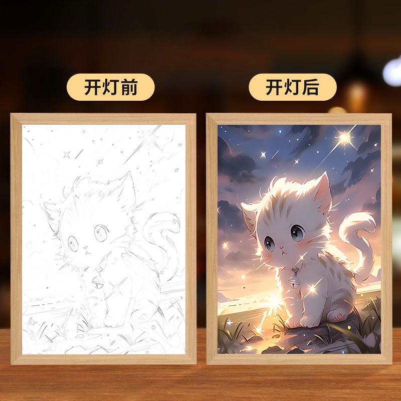 귀여운 애완 동물 키티 조명 그림 소녀 선물 치유 침대 옆 테이블 장식품 키티 데스크탑 작은 장식품 사진 프레임 그림스토어 가기