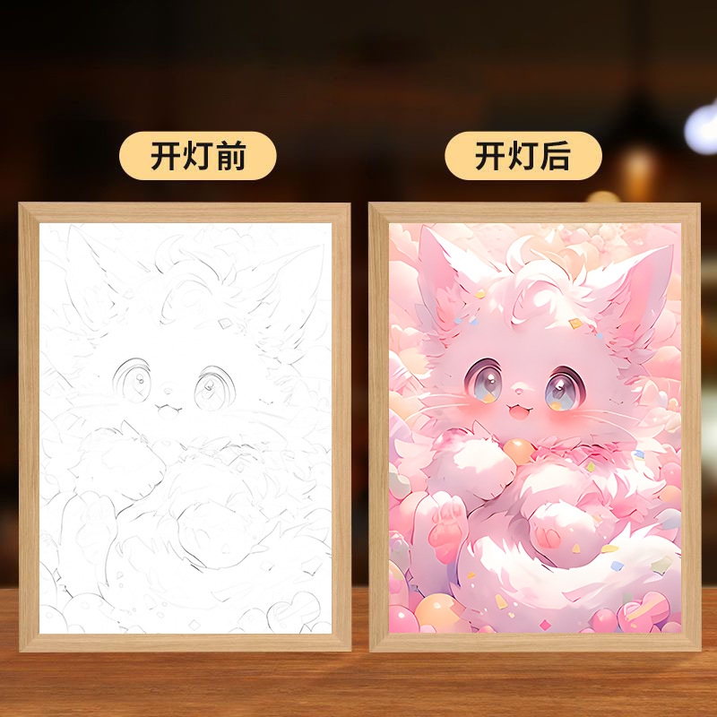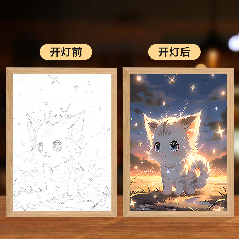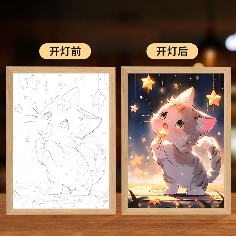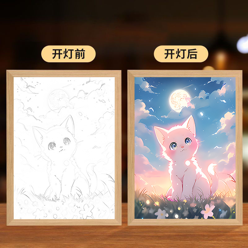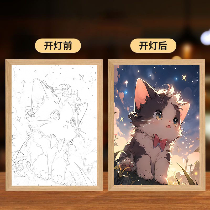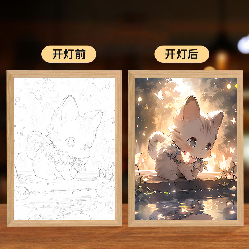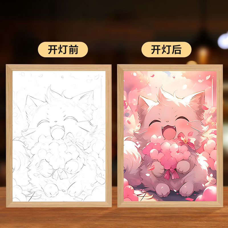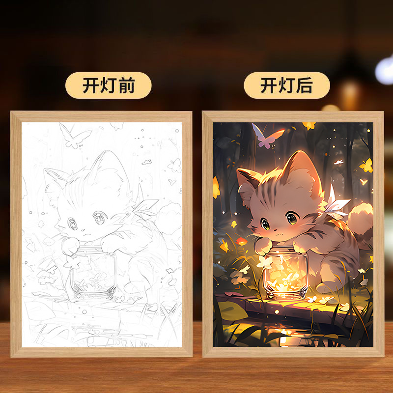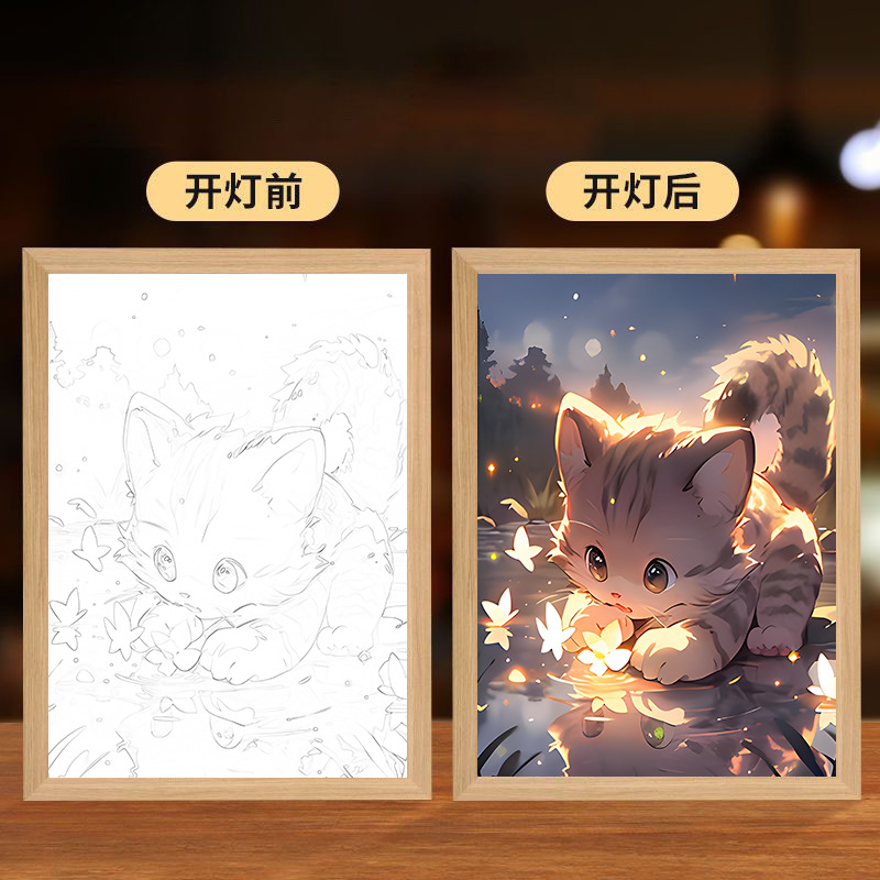 귀여운 애완 동물 키티 조명 그림 소녀 선물 치유 침대 옆 테이블 장식품 키티 데스크탑 작은 장식품 사진 프레임 그림스토어 가기