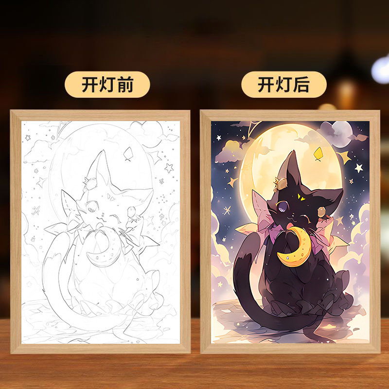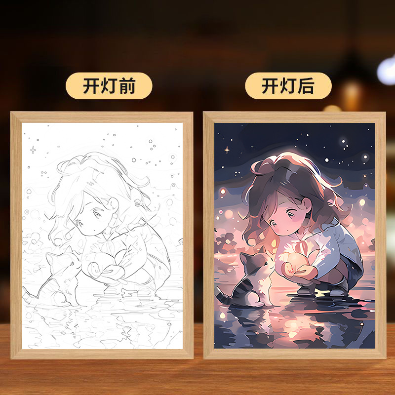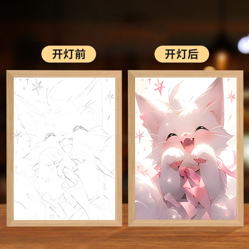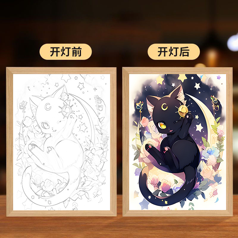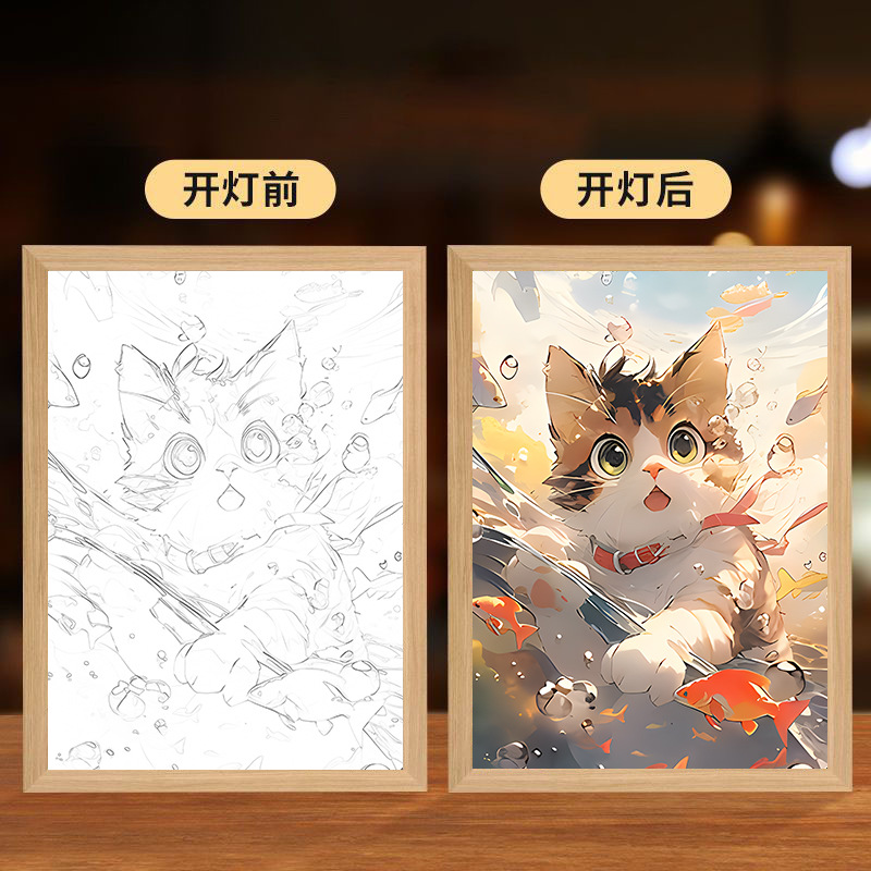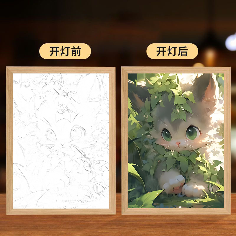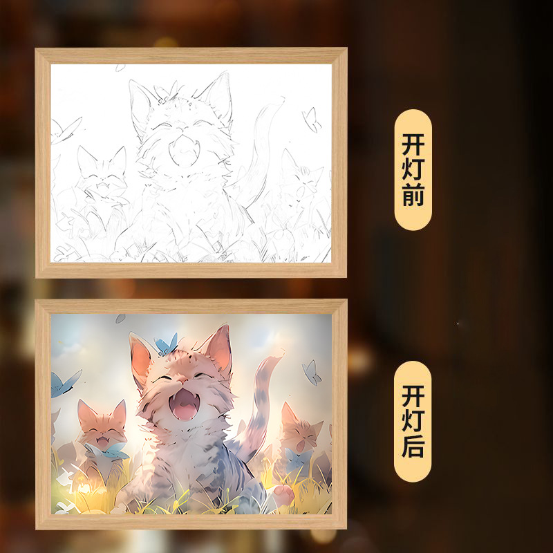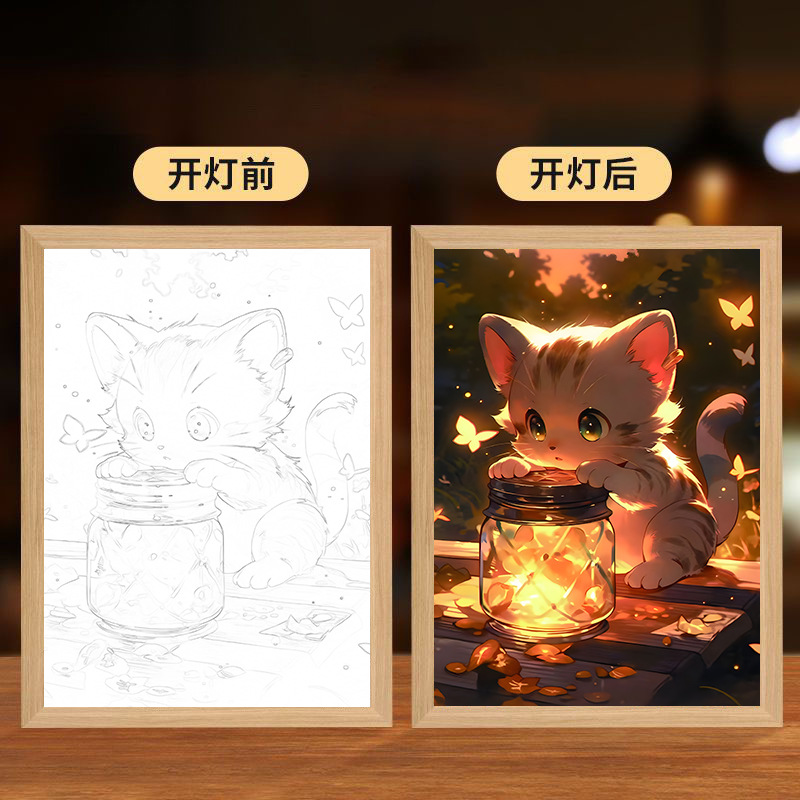 귀여운 애완 동물 키티 조명 그림 소녀 선물 치유 침대 옆 테이블 장식품 키티 데스크탑 작은 장식품 사진 프레임 그림스토어 가기