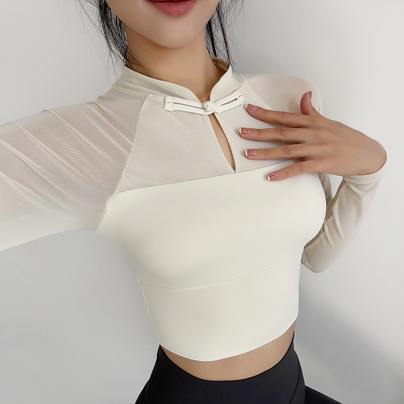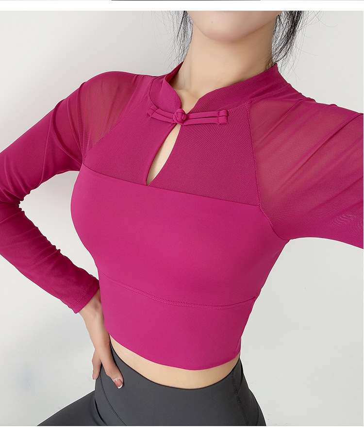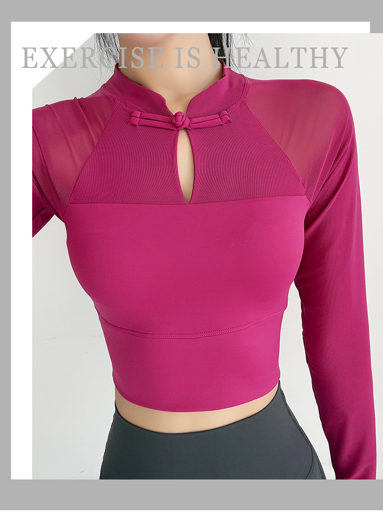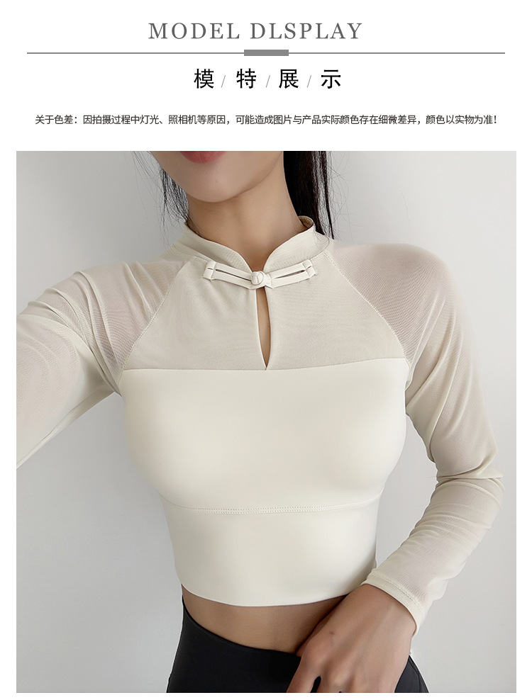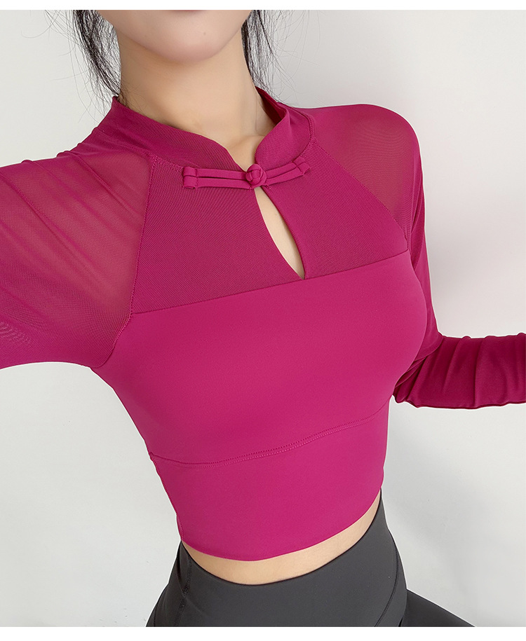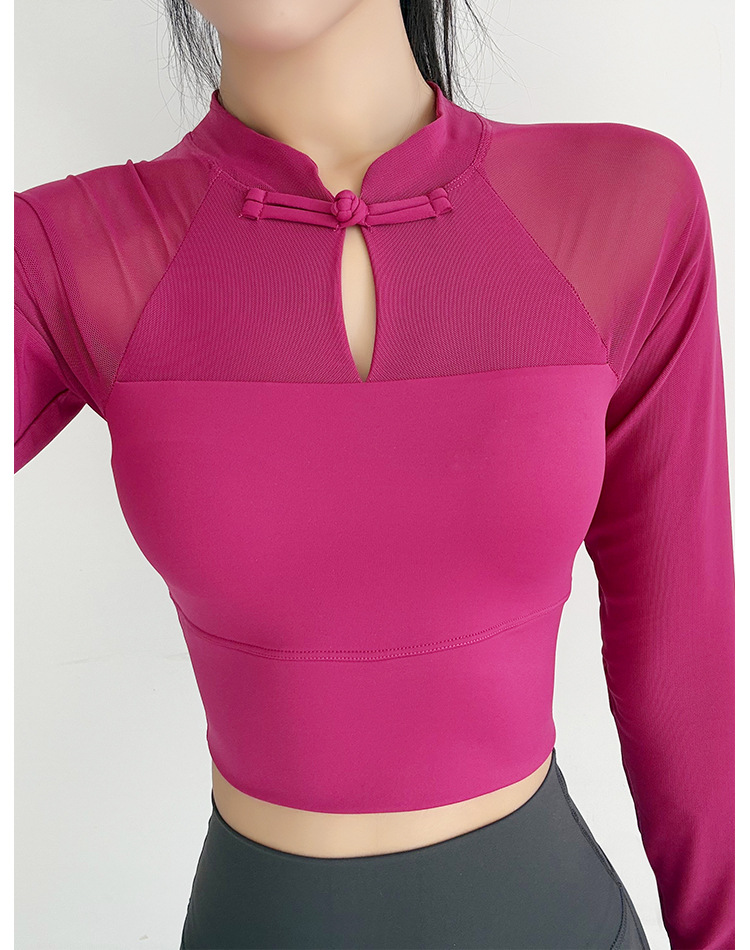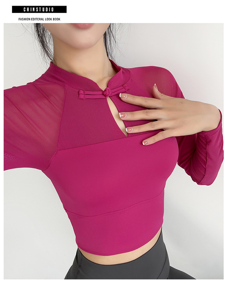 요가 의류 긴팔 Guofeng 칼라 피트니스 통기성 티셔츠 새로운 중국 메쉬 스티칭 스포츠 탑