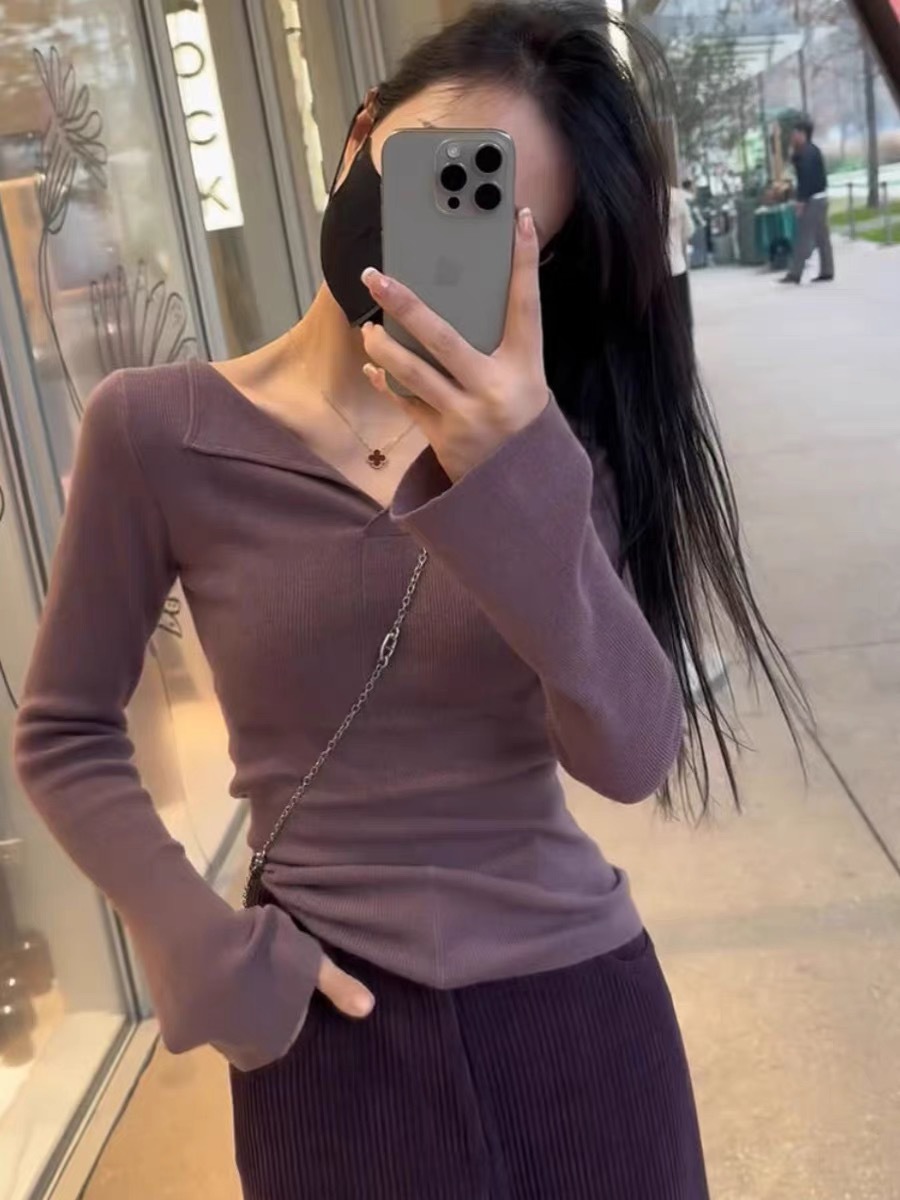 Kasler 가을과 겨울 부드러운 왁스 종이 시대를 줄이는 솔리드 컬러 V 넥 슬림 핏 최고 피부 친화적 인 니트베이스 셔츠스토어 가기