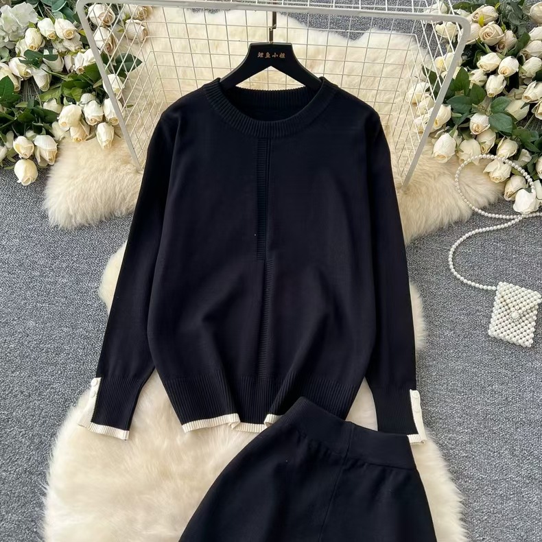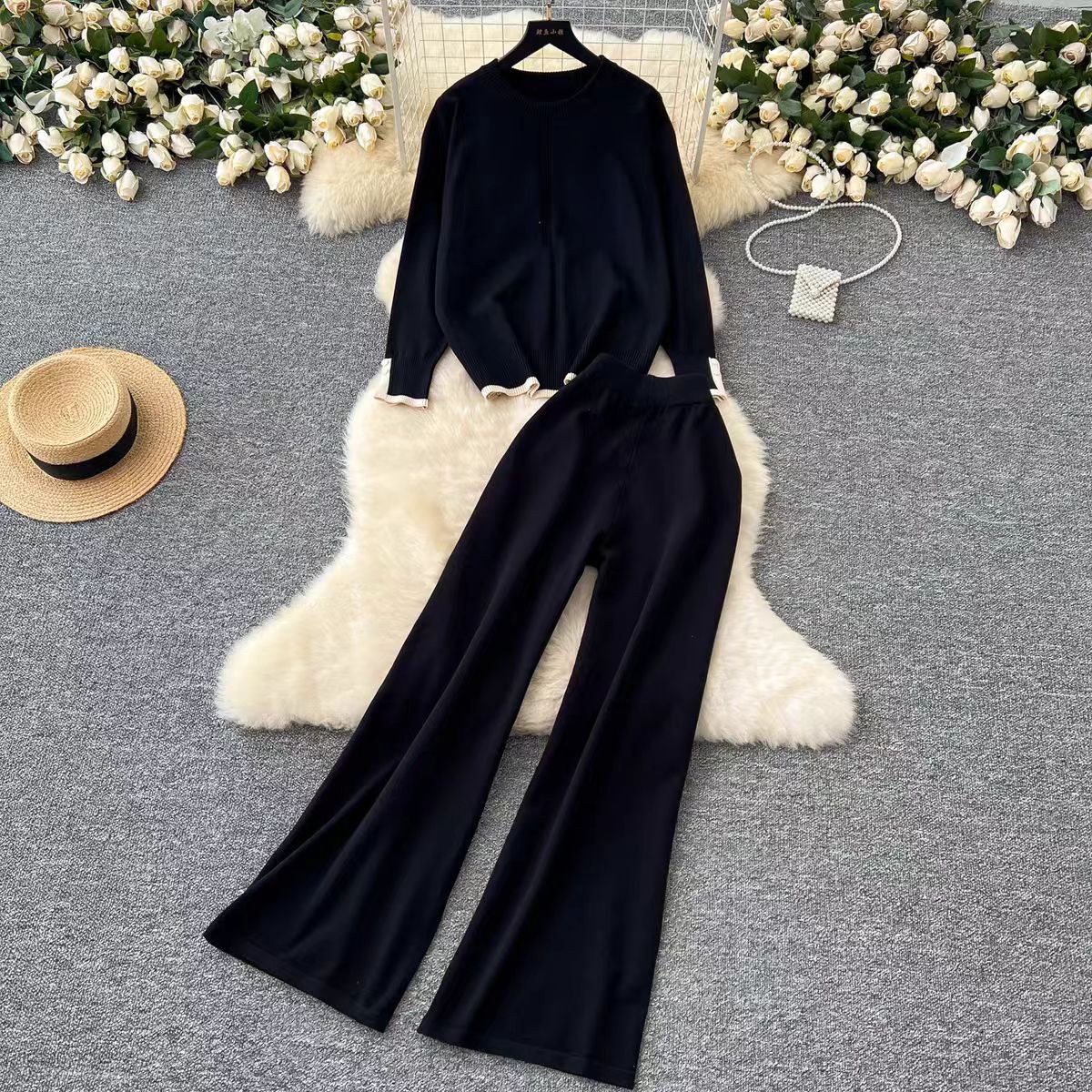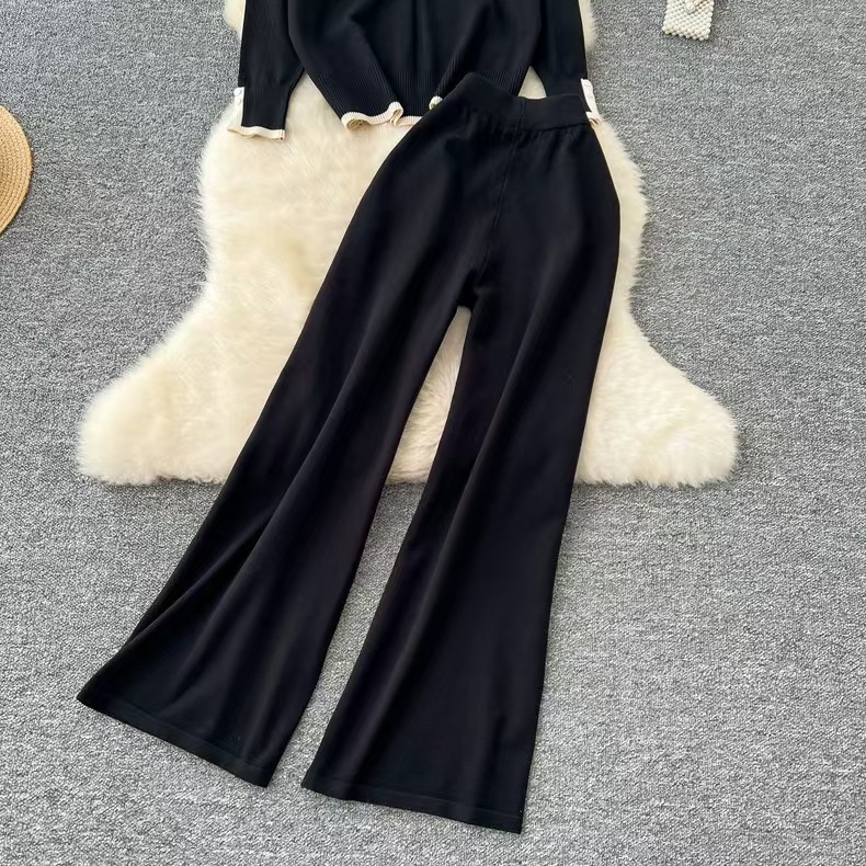 유행 세트 여성용 한국식 라운드 넥 긴팔 니트 탑 2 피스 세트 높은 허리 슬리밍 와이드 레그 바지 트렌디 한 캐주얼 바지스토어 가기