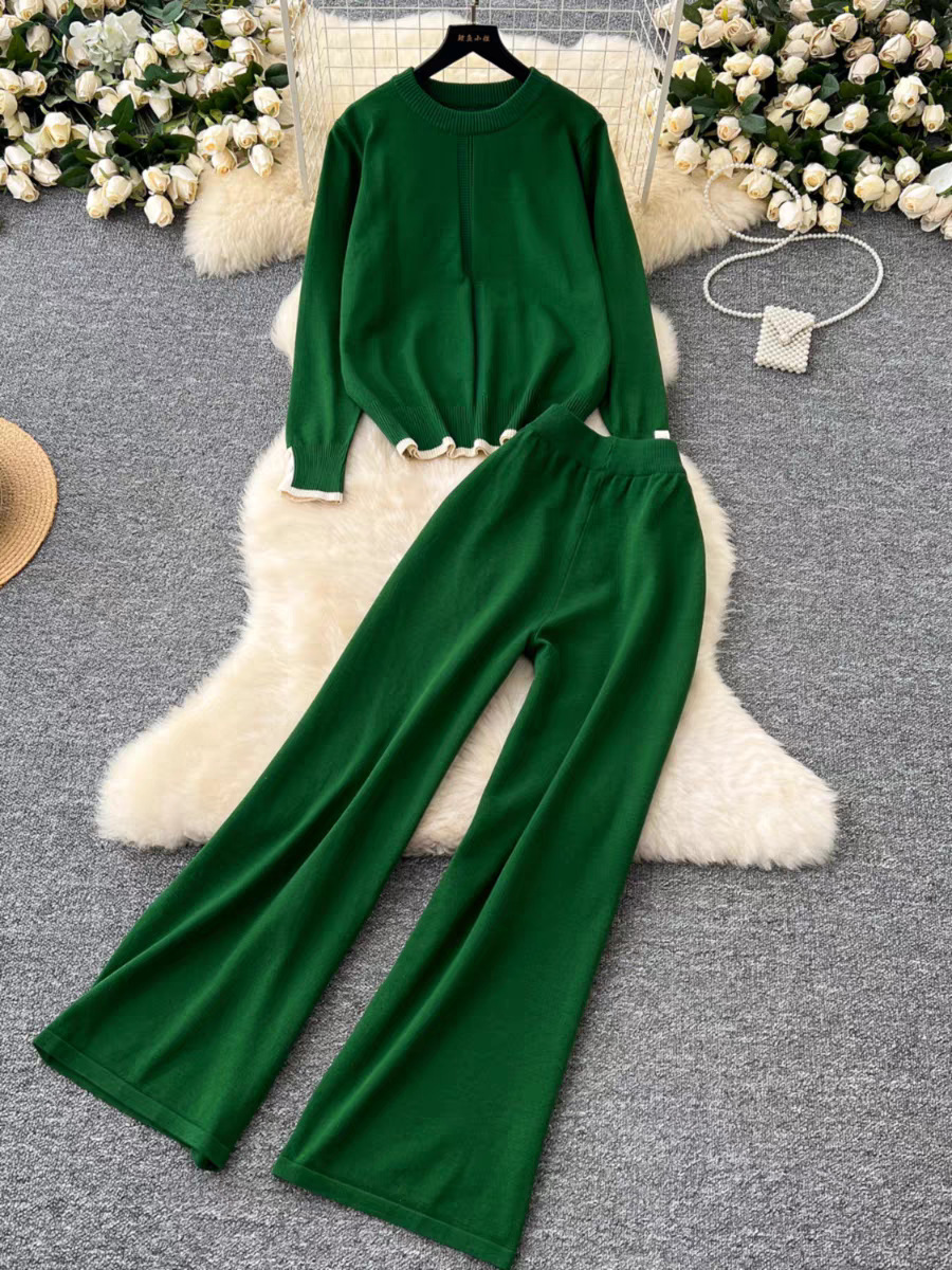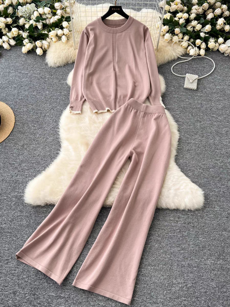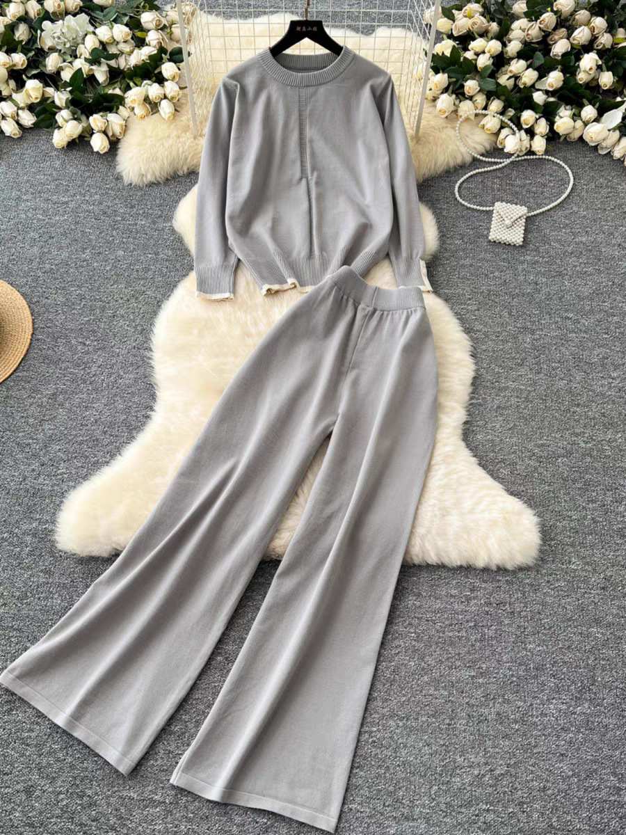 유행 세트 여성용 한국식 라운드 넥 긴팔 니트 탑 2 피스 세트 높은 허리 슬리밍 와이드 레그 바지 트렌디 한 캐주얼 바지