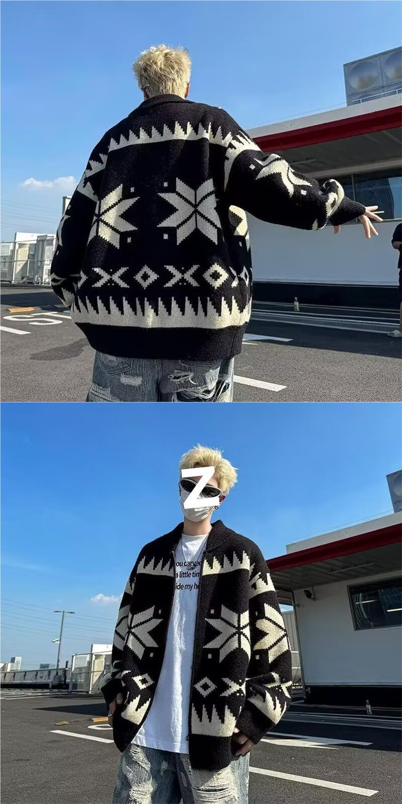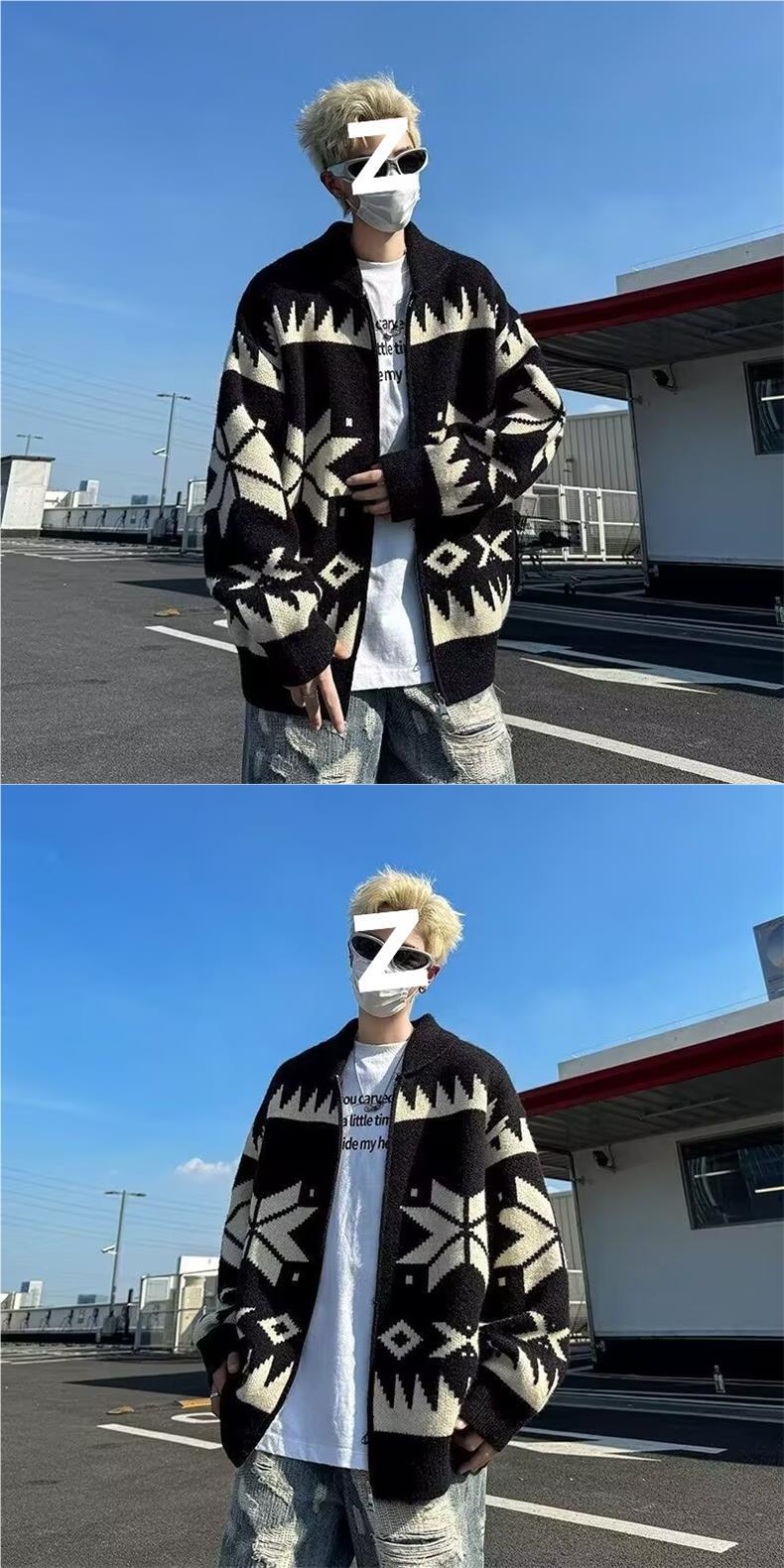 민족 스타일 옷깃 외부 착용 새로운 남성 카디건 스웨터 레트로 유행 스웨터 지퍼 느슨한 니트 따뜻한 재킷