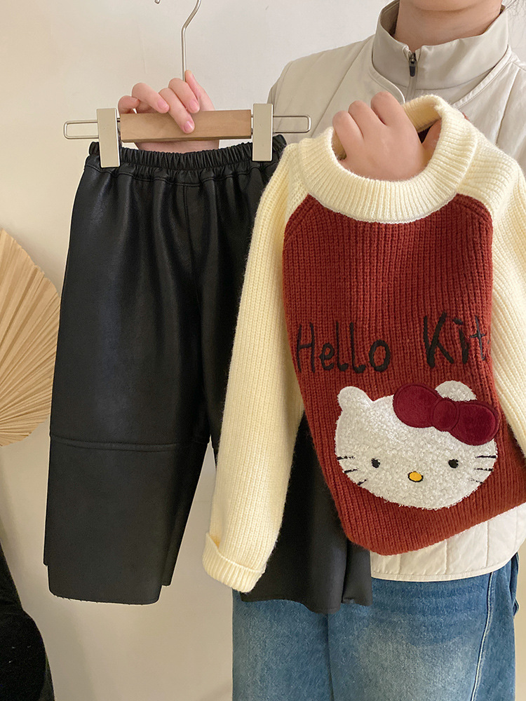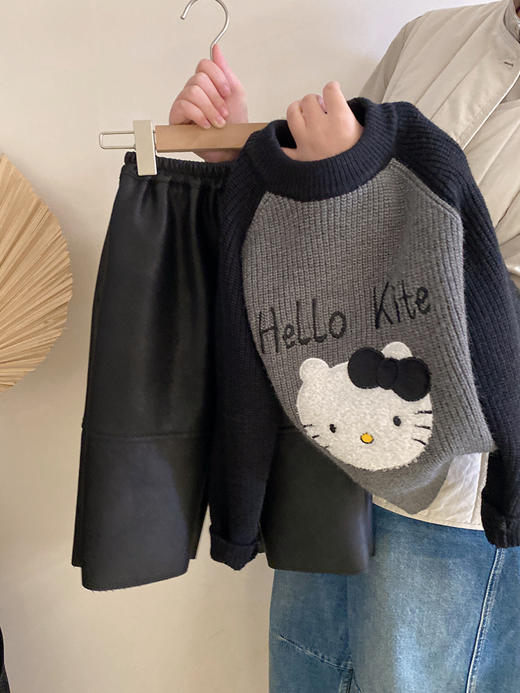 여자 한국 컬러 매칭 만화 KT 고양이 편지 니트 스웨터 2024 가을과 겨울 새로운 기모 가죽 바지 패션 세트