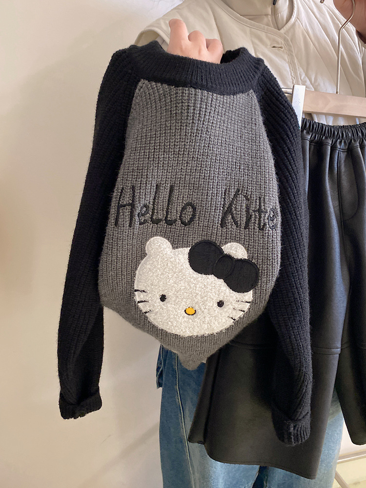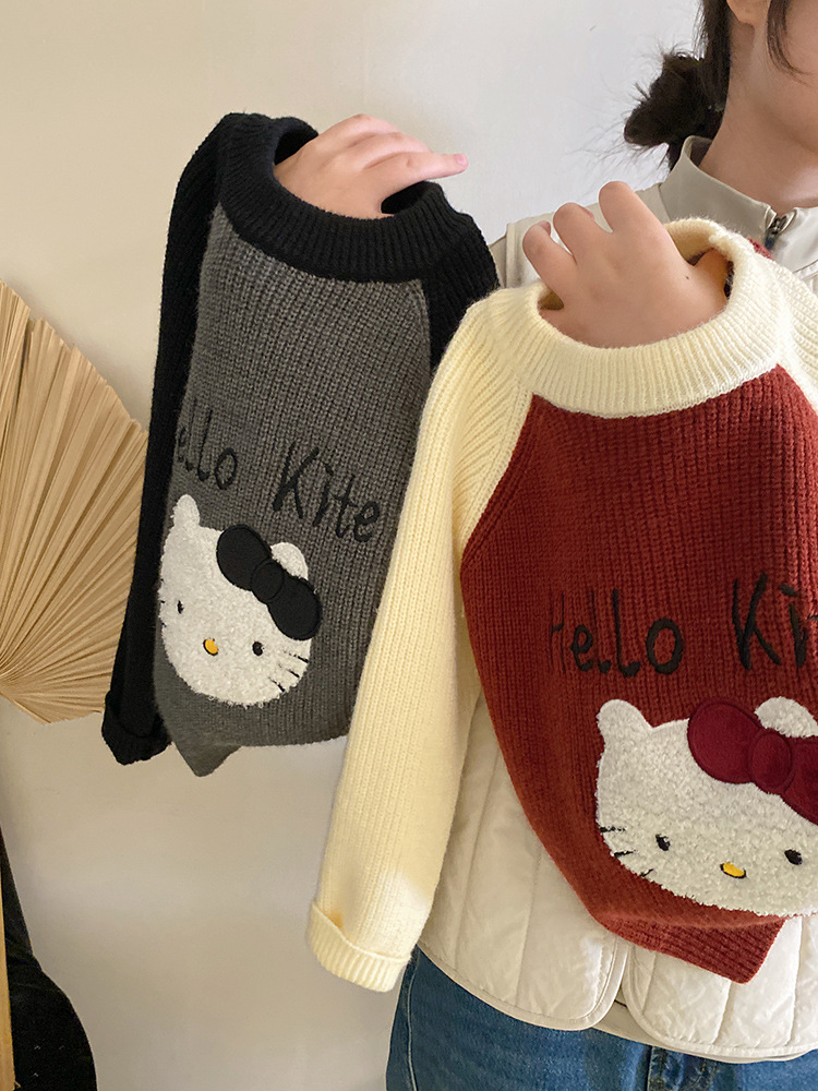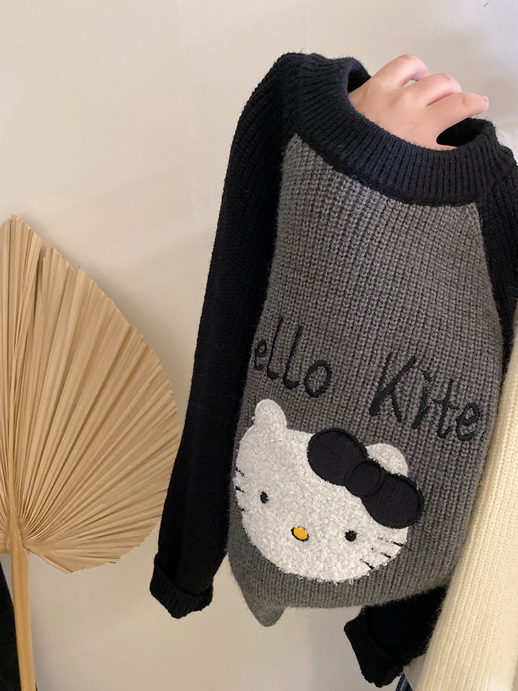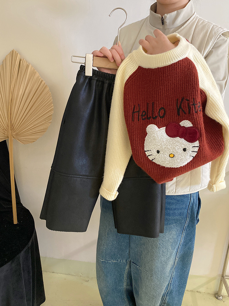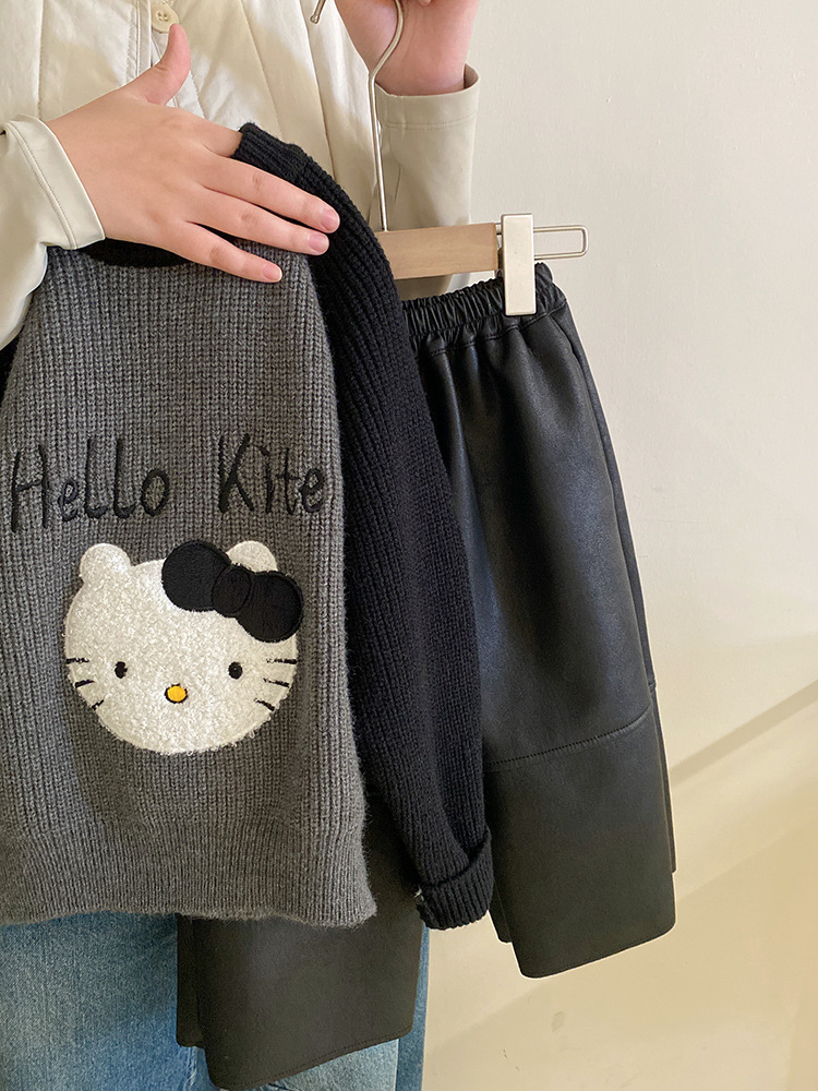 여자 한국 컬러 매칭 만화 KT 고양이 편지 니트 스웨터 2024 가을과 겨울 새로운 기모 가죽 바지 패션 세트스토어 가기