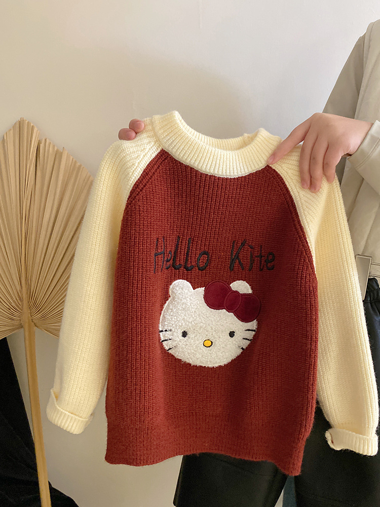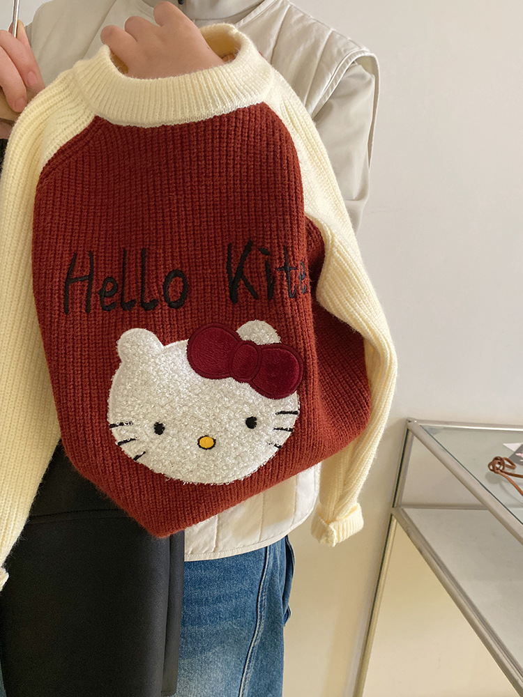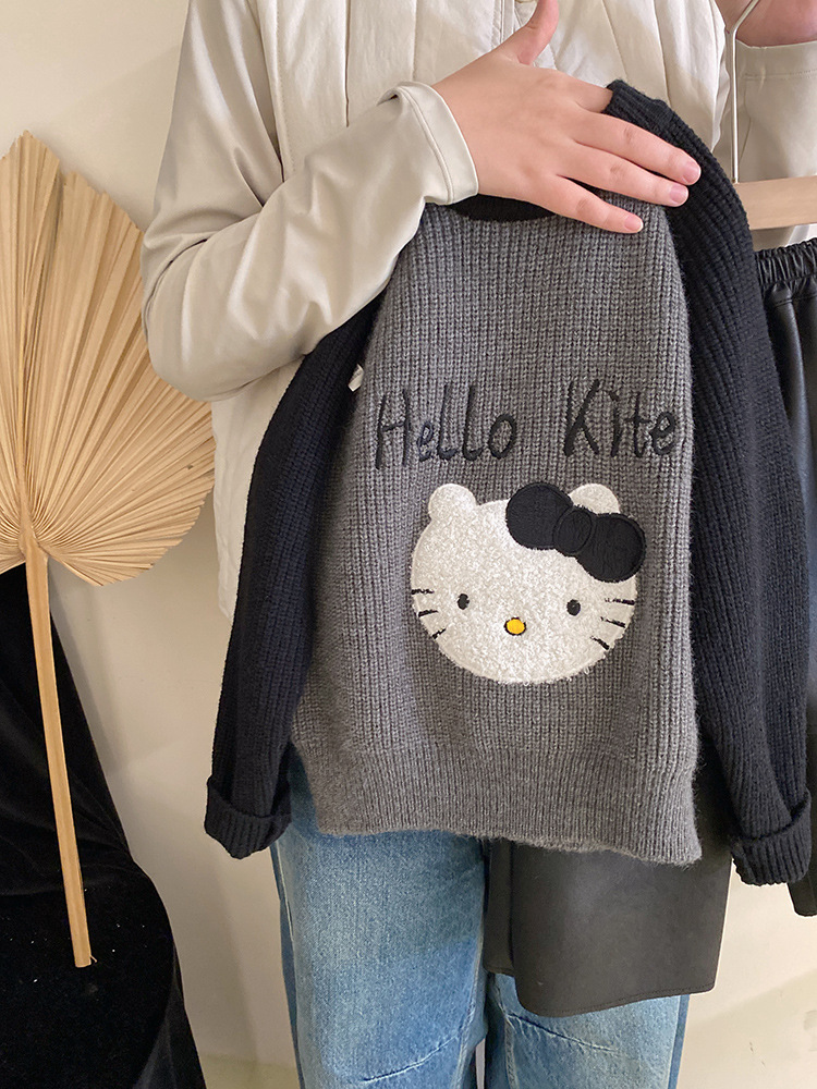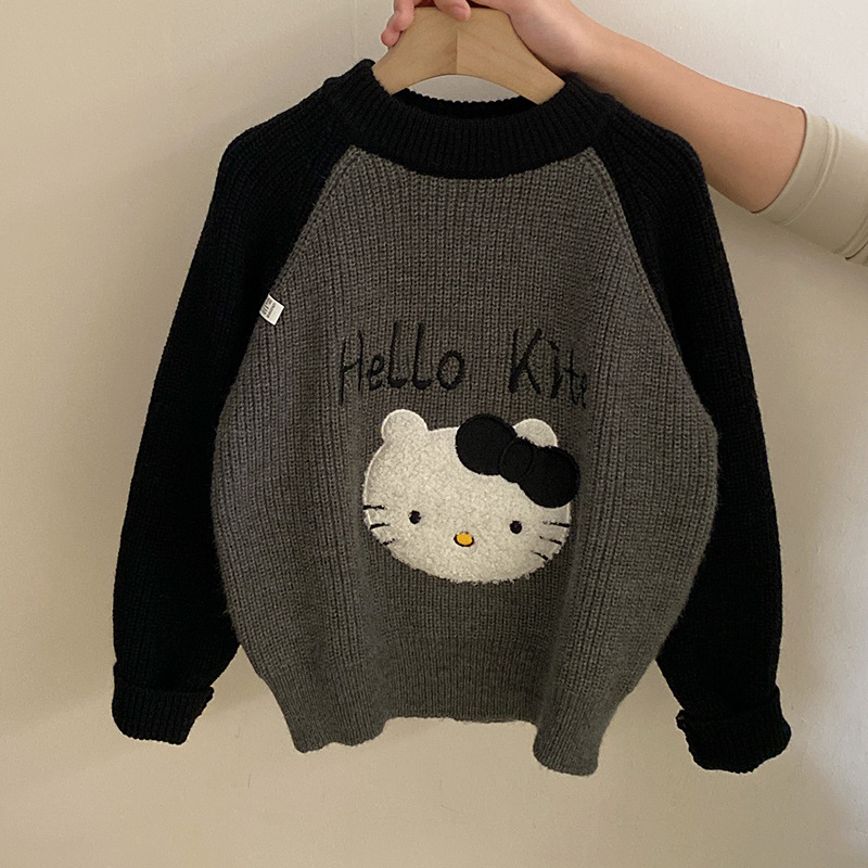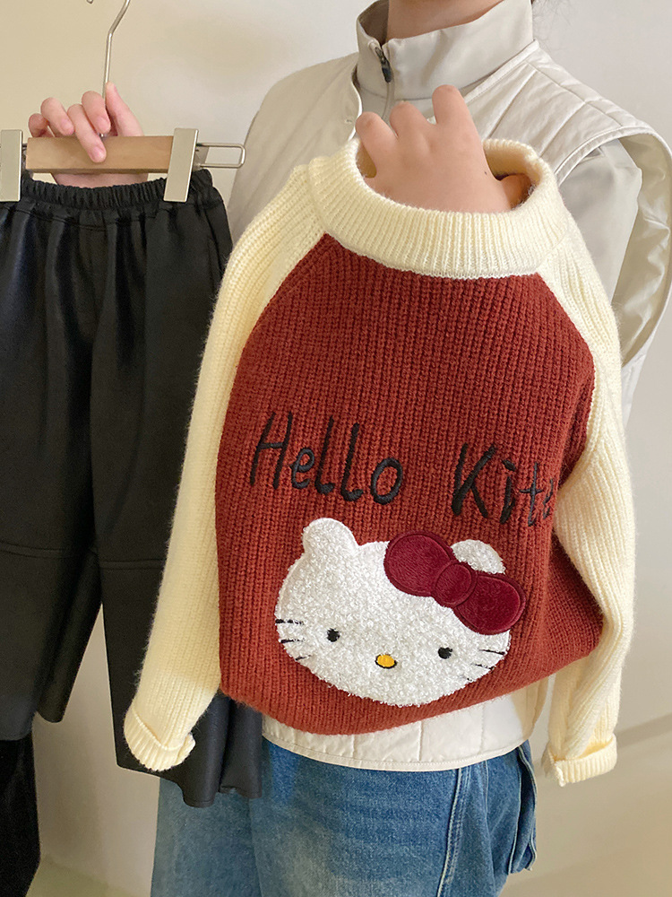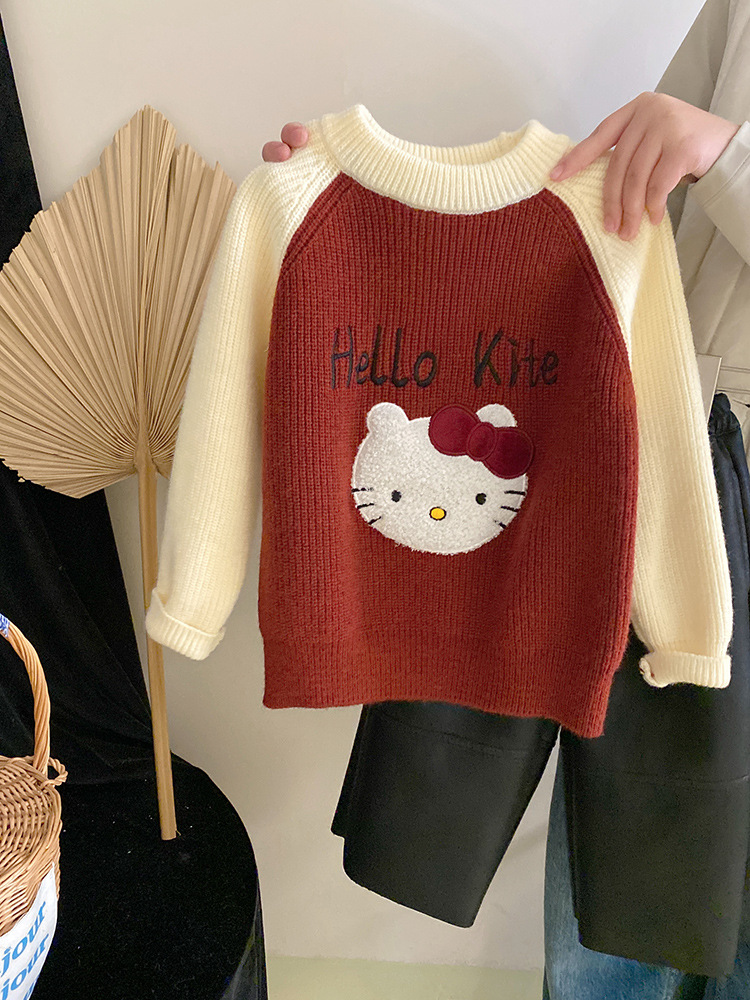 여자 한국 컬러 매칭 만화 KT 고양이 편지 니트 스웨터 2024 가을과 겨울 새로운 기모 가죽 바지 패션 세트스토어 가기