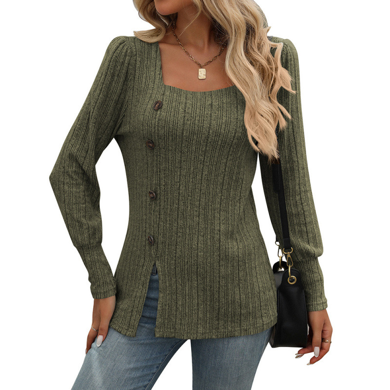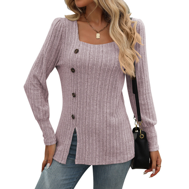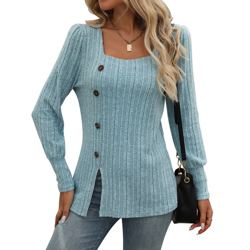 2024 크로스보더 신작 여성 의류 Amazon 여성 스퀘어 넥 핏 스트립 기모 솔리드 컬러 탑 긴팔 버튼 티셔츠
