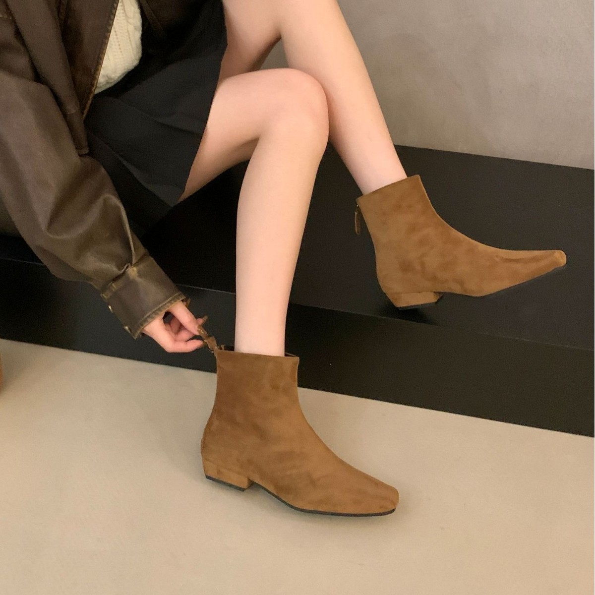베이비 벨벳 얇은 부츠 여성 스웨이드 프랑스 스타일 새로운 도착 작은 광장 발가락 마틴 부츠 가을과 겨울 2024 올 매치 두꺼운 간단한 힐스토어 가기