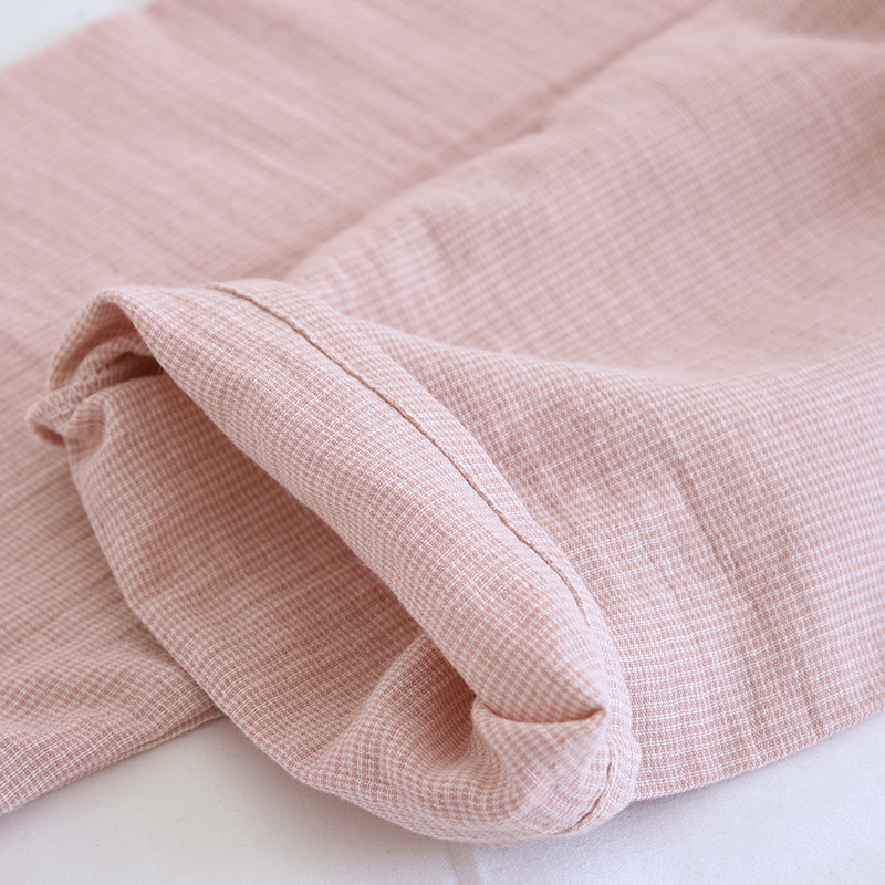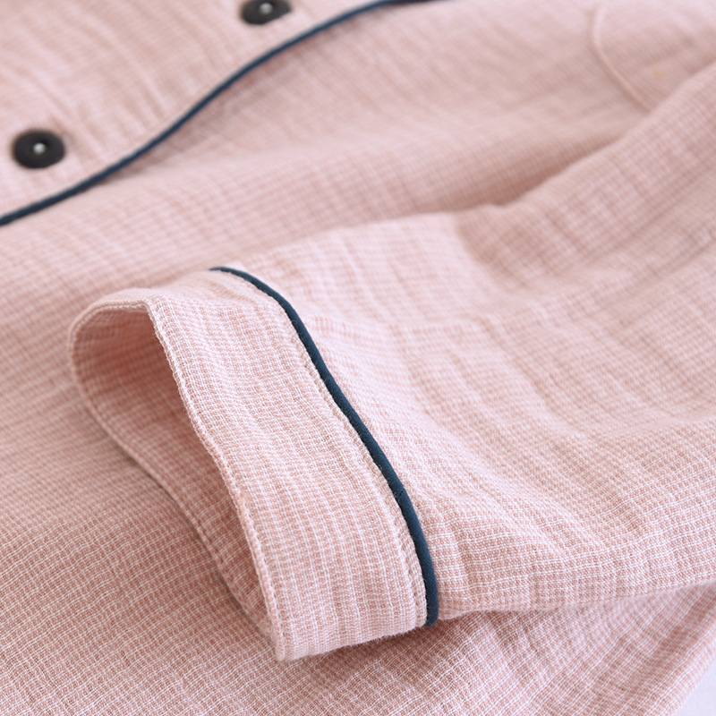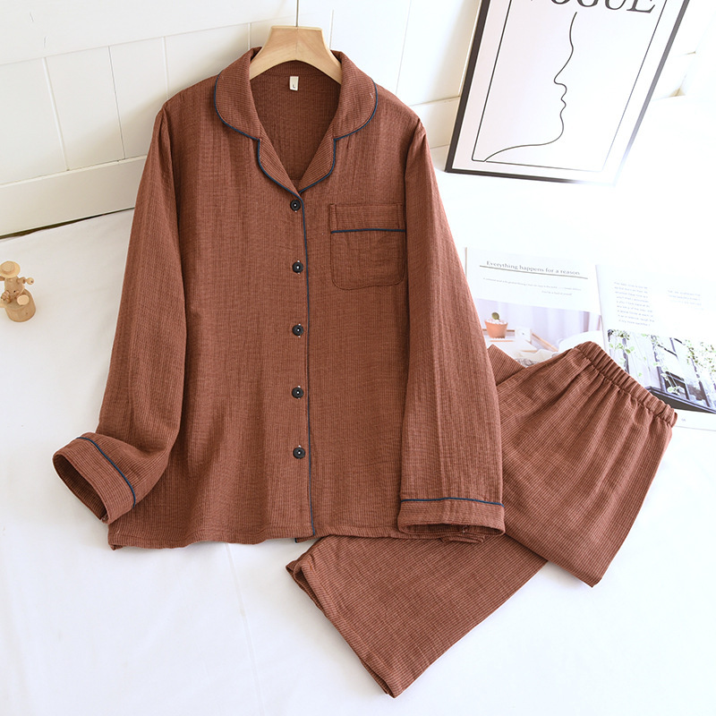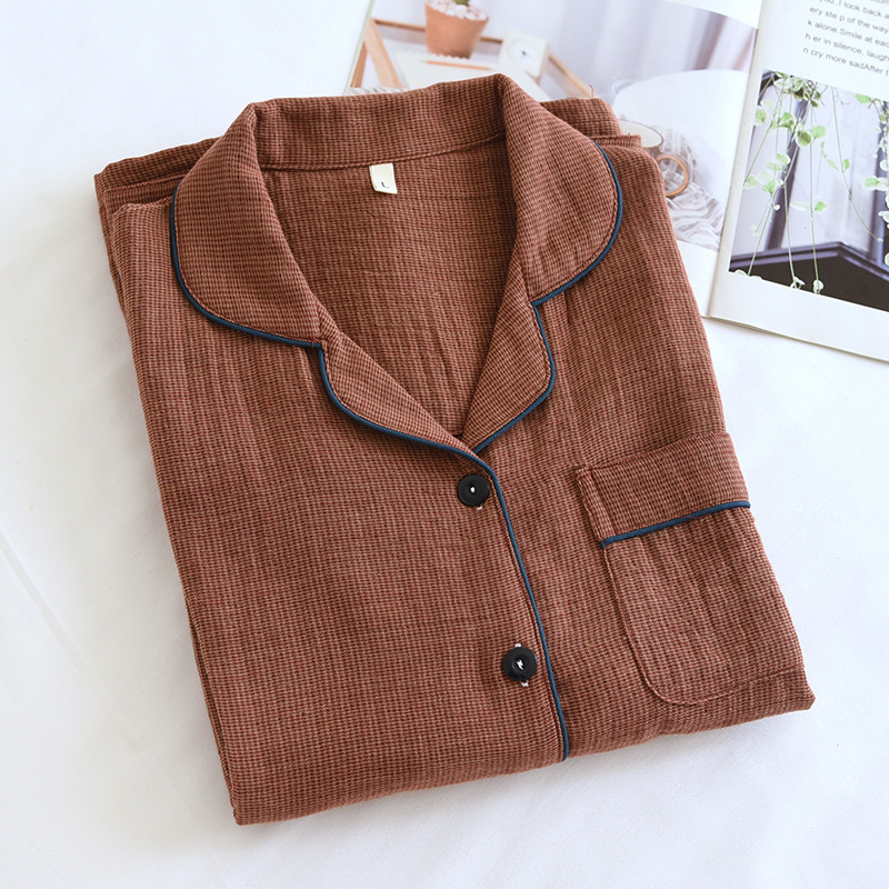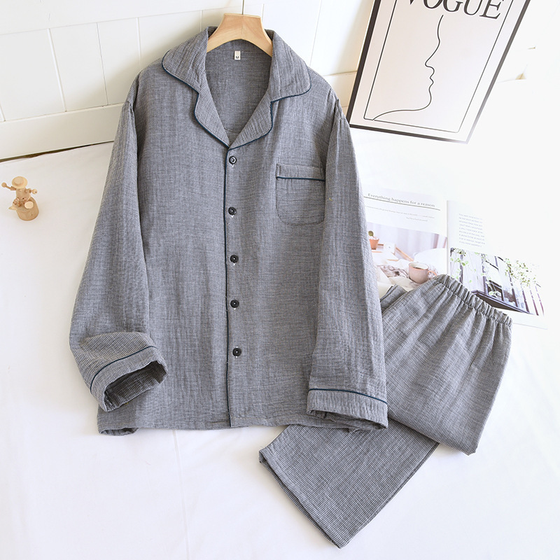 MUJI 일본식 좋은 봄과 가을 순면 더블 레이어 원사 파자마 여성 격자 무늬 남성 플러스 사이즈 긴팔 홈 의류 세트