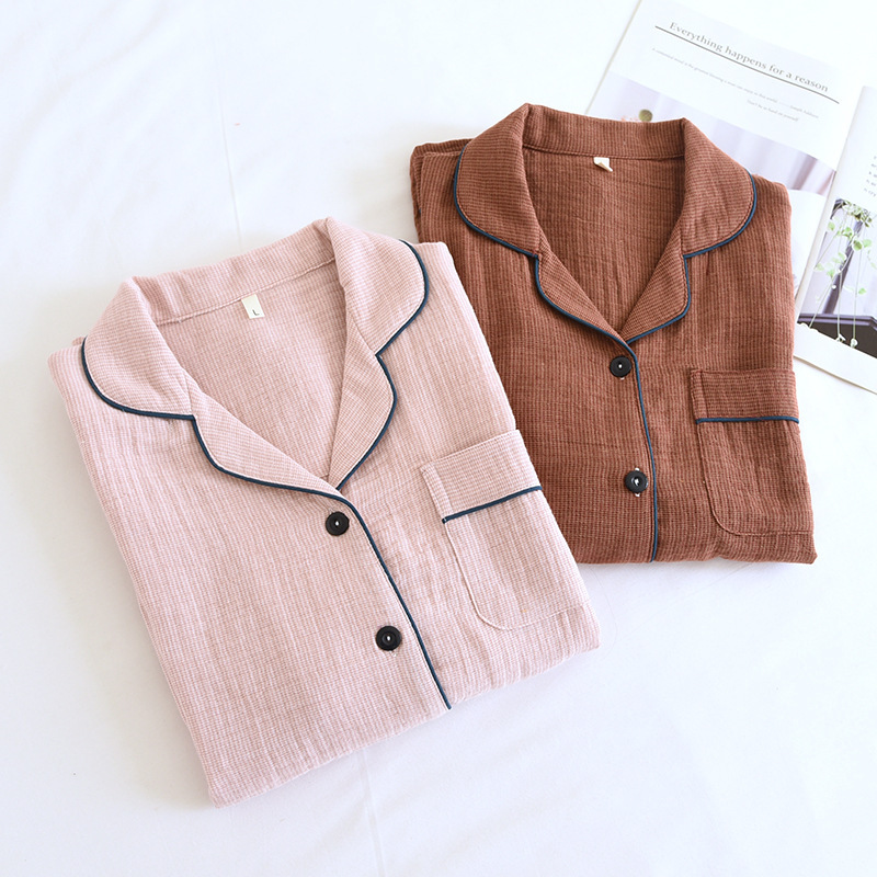 MUJI 일본식 좋은 봄과 가을 순면 더블 레이어 원사 파자마 여성 격자 무늬 남성 플러스 사이즈 긴팔 홈 의류 세트스토어 가기