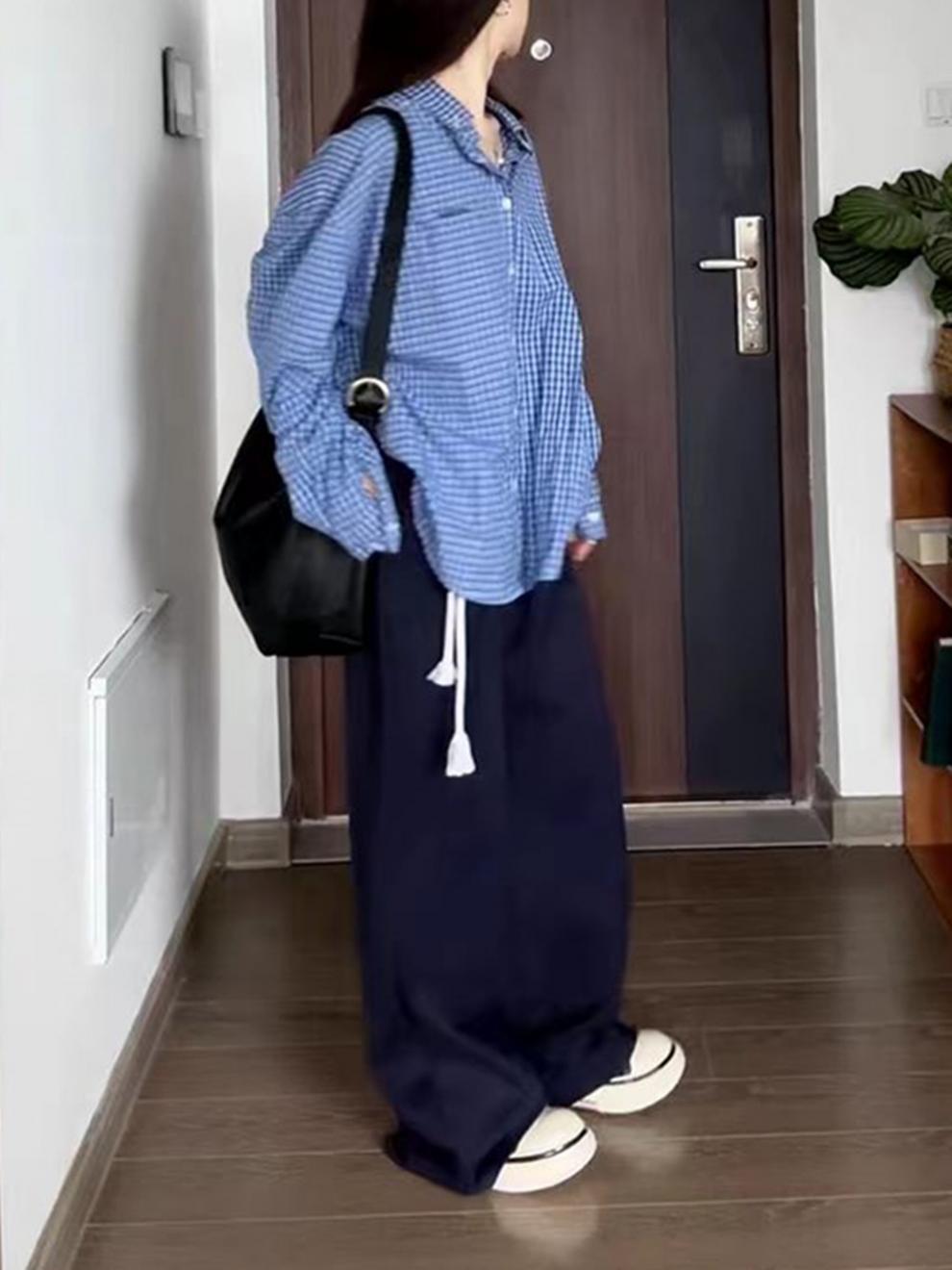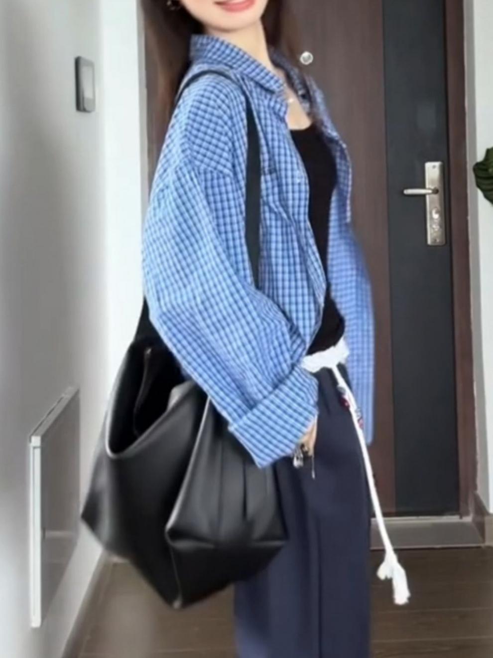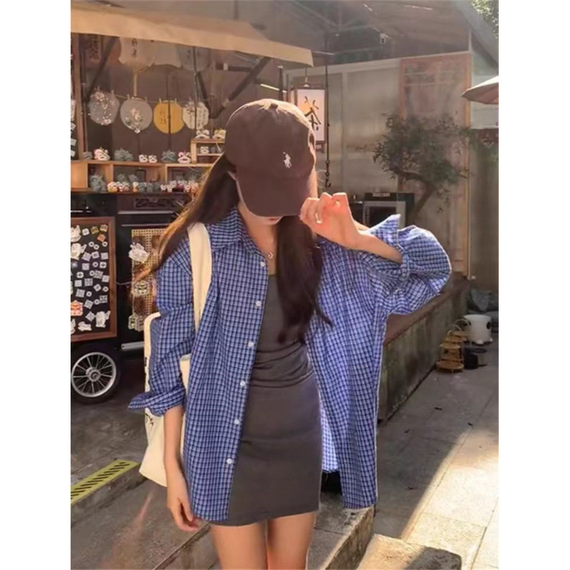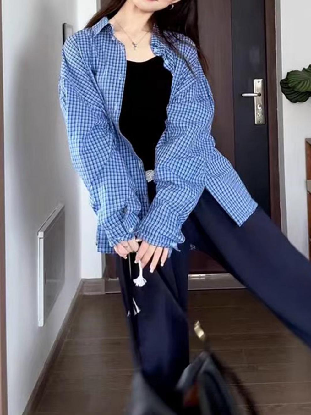 파란색 격자 무늬 셔츠 여성 가을 2024 새로운 프랑스 스타일 느슨한 태양 보호 셔츠 탑 재킷 얇은 섹션스토어 가기