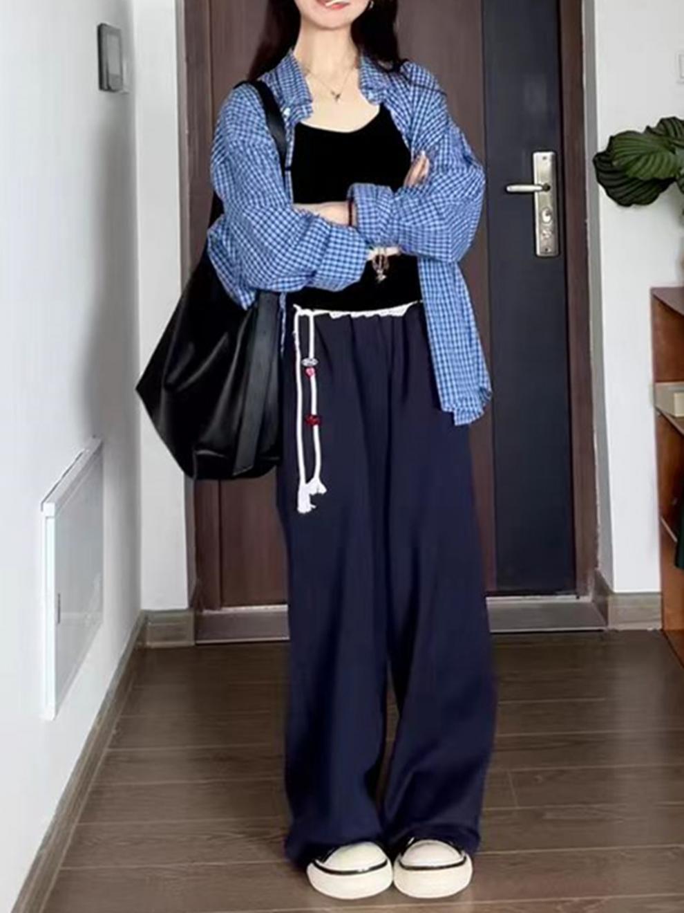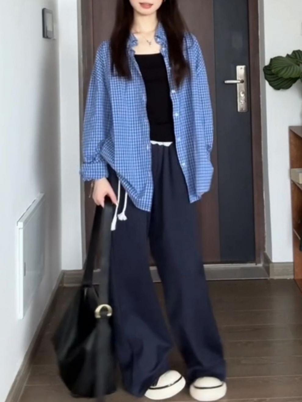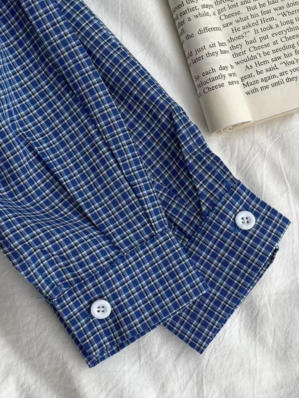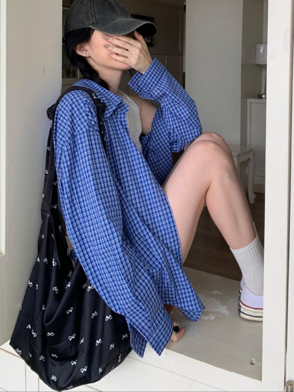 파란색 격자 무늬 셔츠 여성 가을 2024 새로운 프랑스 스타일 느슨한 태양 보호 셔츠 탑 재킷 얇은 섹션