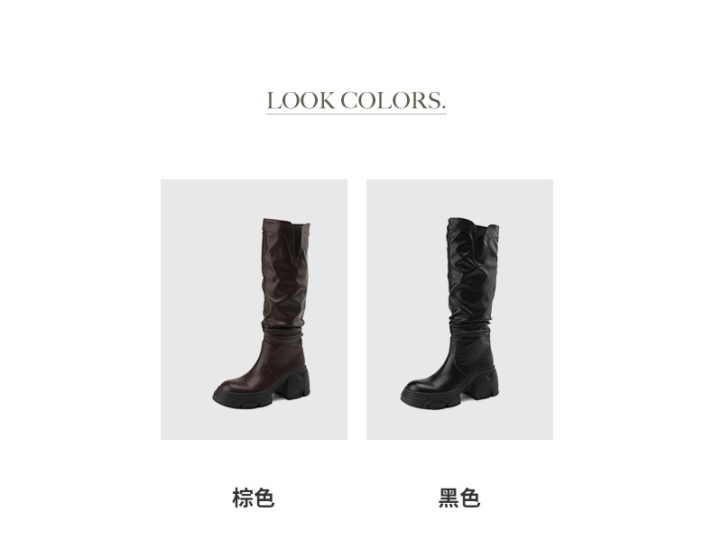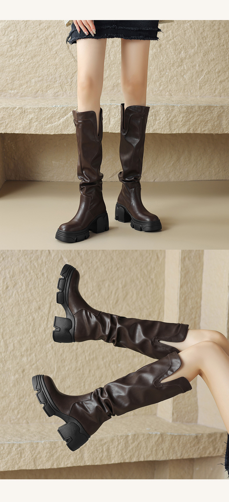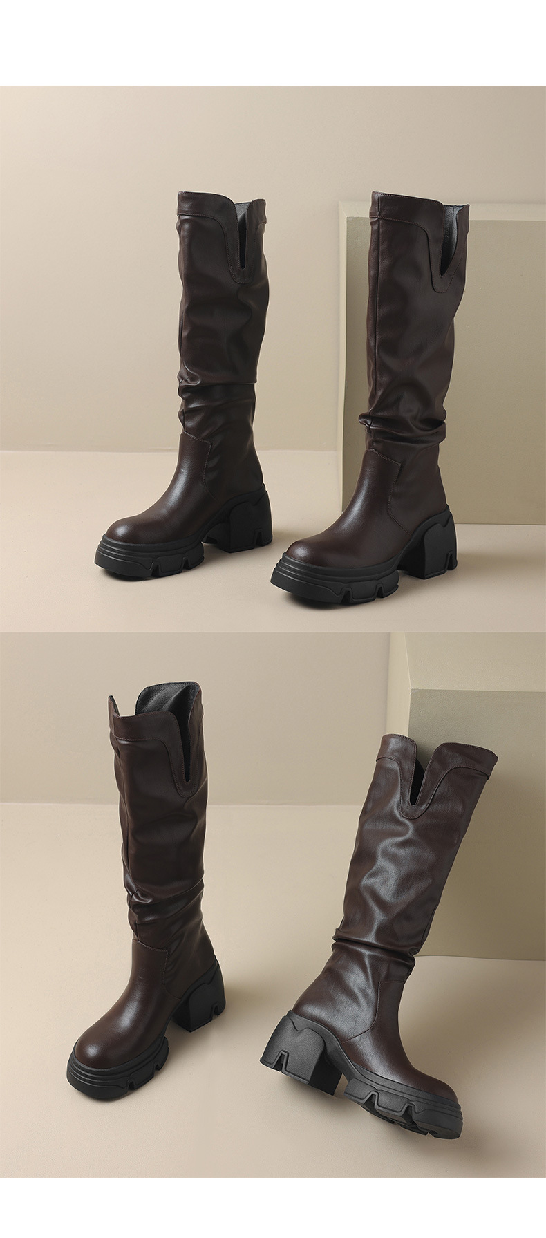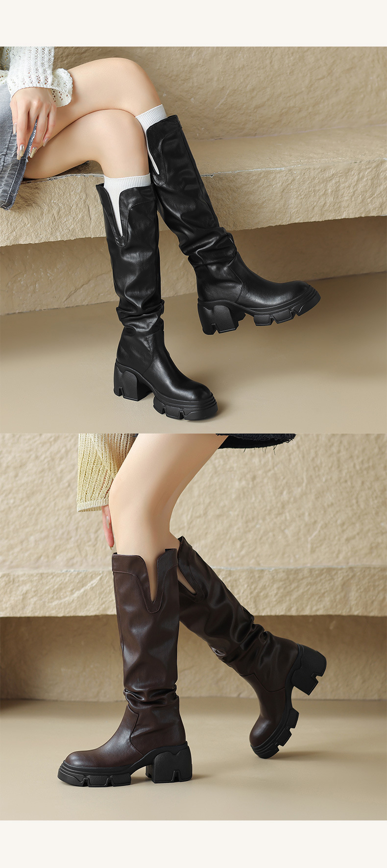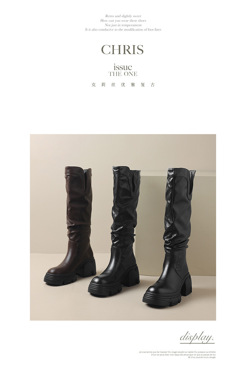 두꺼운 밑창 하이힐 부츠 여성용 정품 가죽 머핀 무릎 길이 부츠 2024 새로운 겨울 작은 하이힐 나이트 부츠스토어 가기