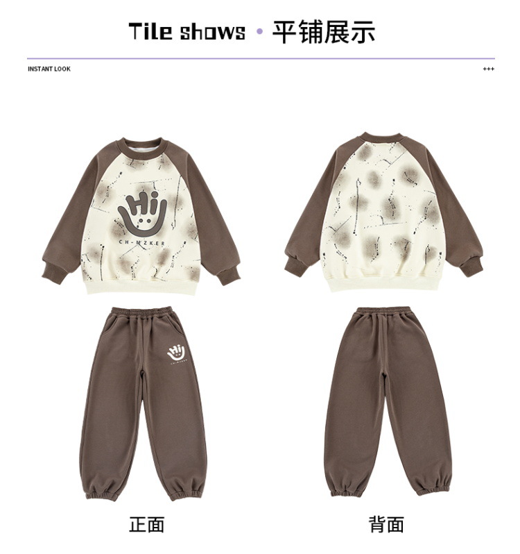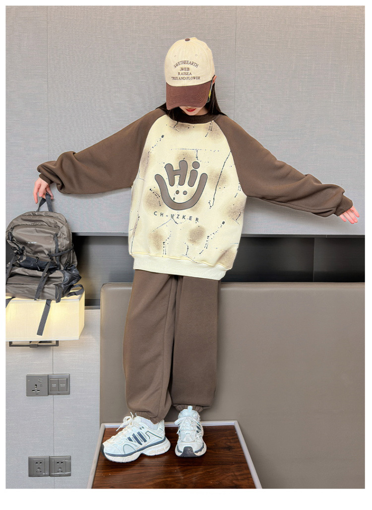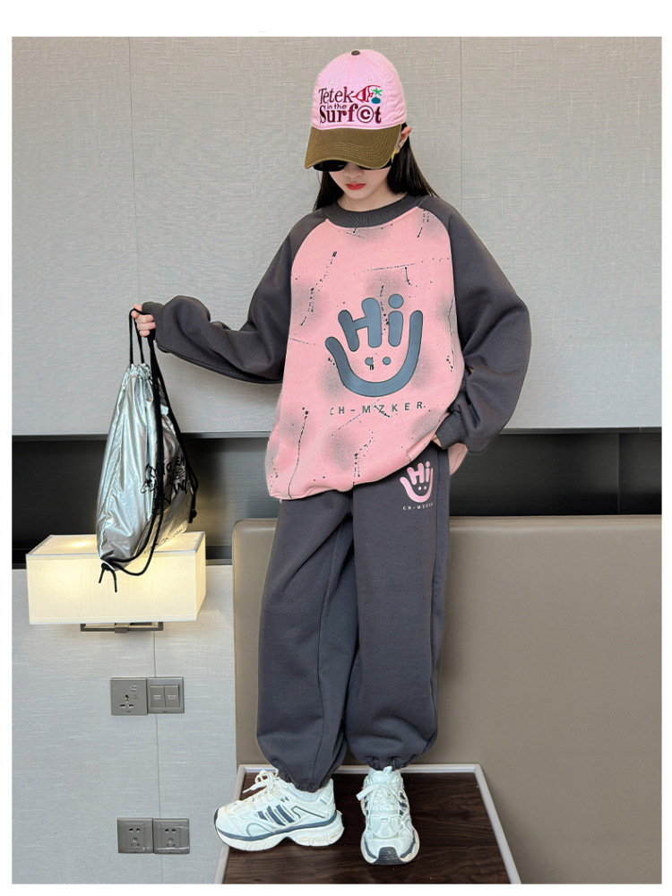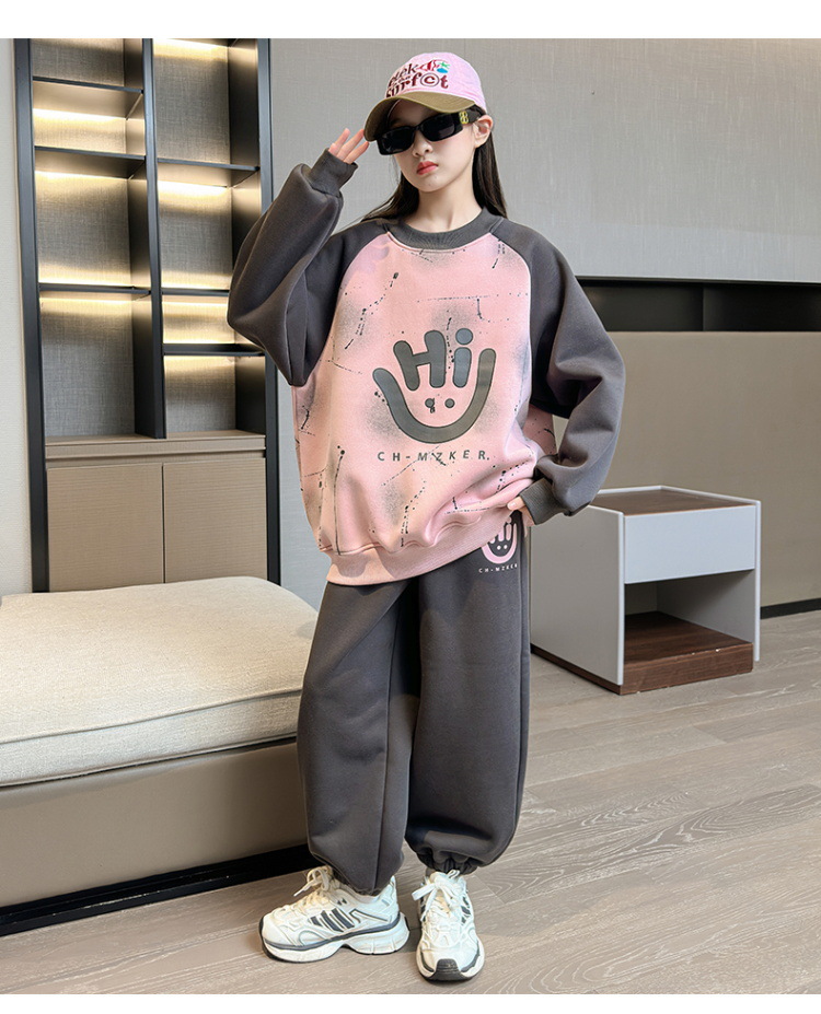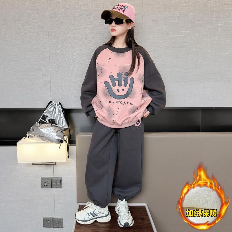 24 가을/겨울 어린이 기모 두꺼운 느슨한 캐주얼 스포츠 세트 소녀의 인쇄 땀 바지 2 피스 세트스토어 가기