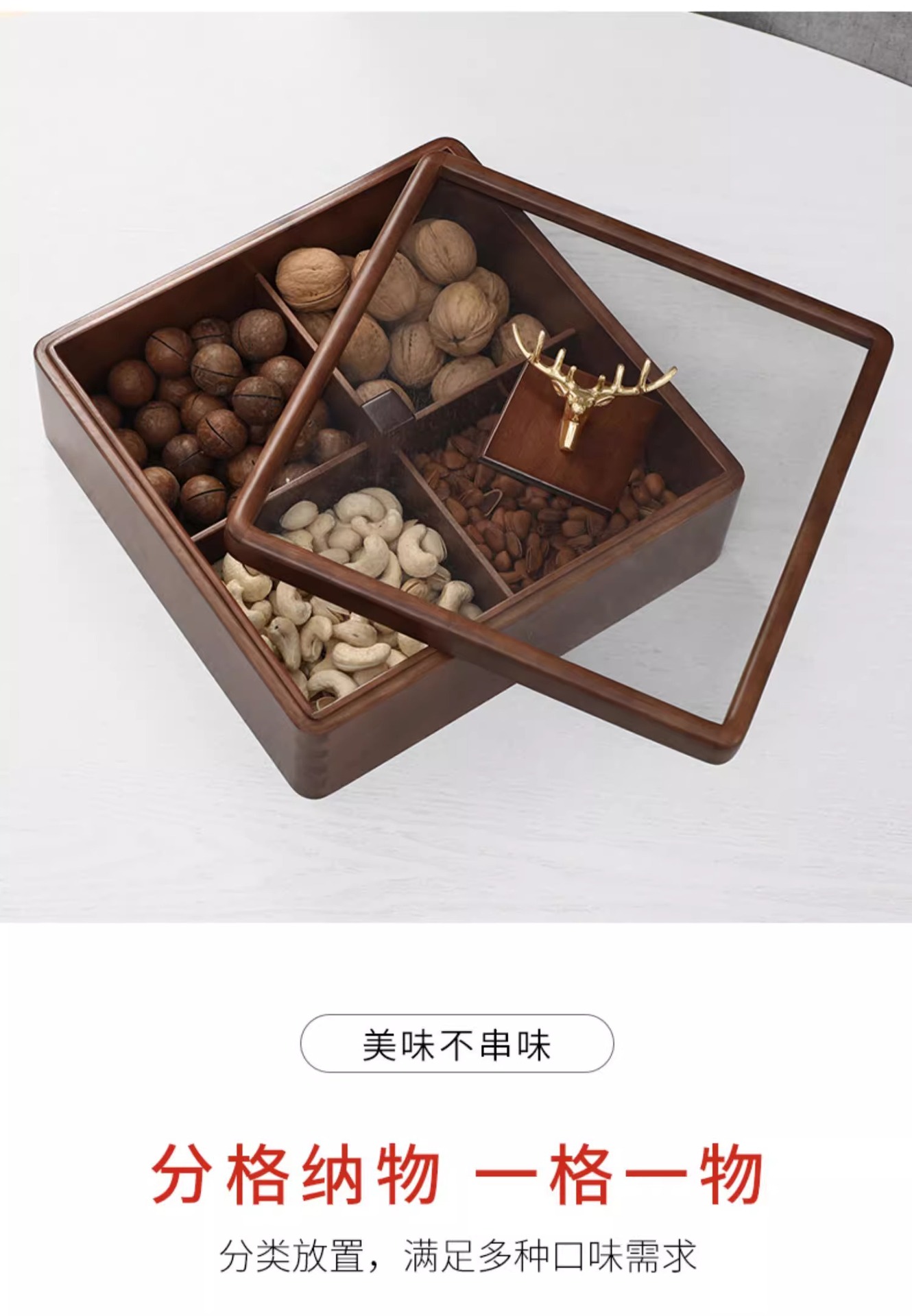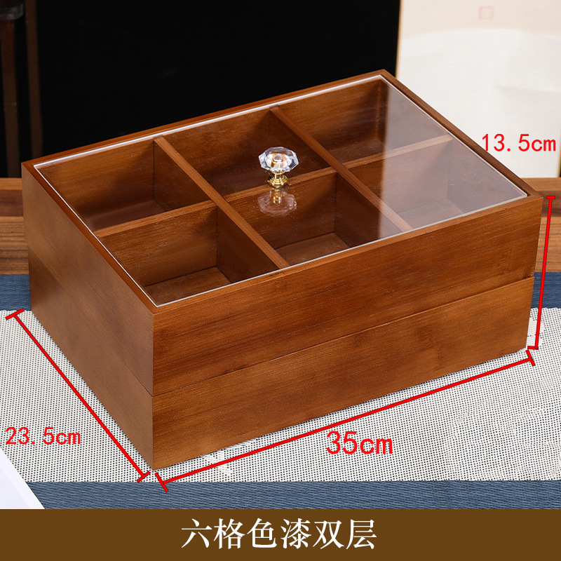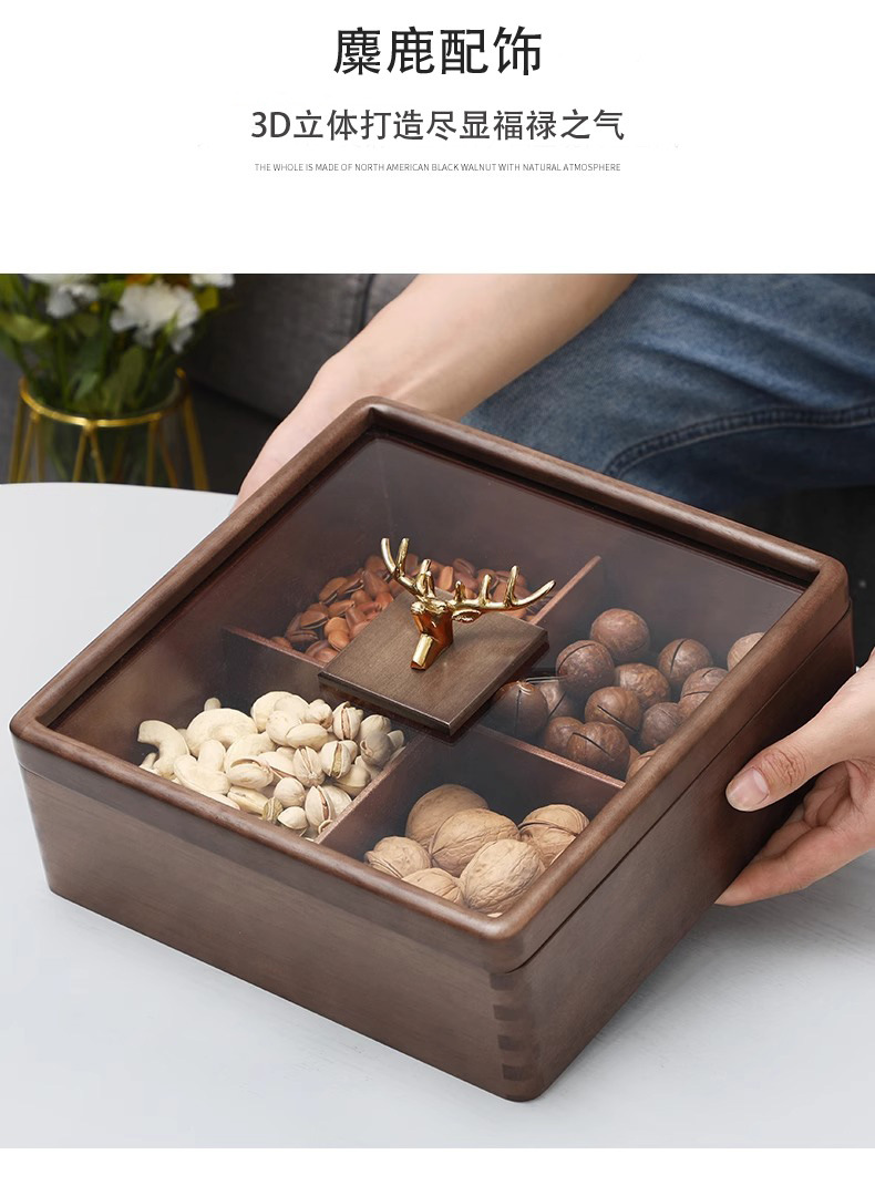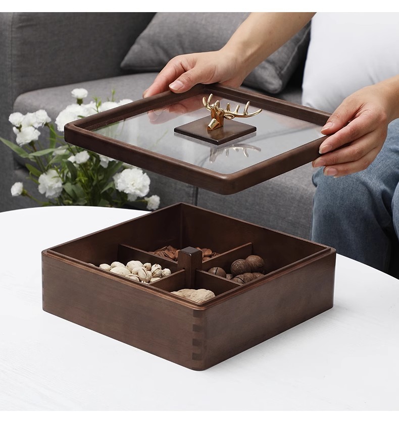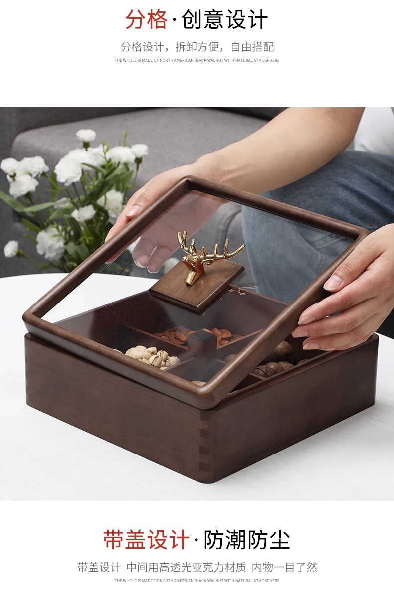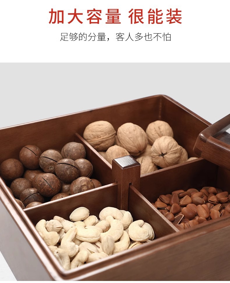 새로운 중국 스타일의 솔리드 우드 말린 과일 상자 가구 거실 사탕 상자 뚜껑 분할 스낵 너트 상자 멜론 씨드 스토리지 트레이 우드