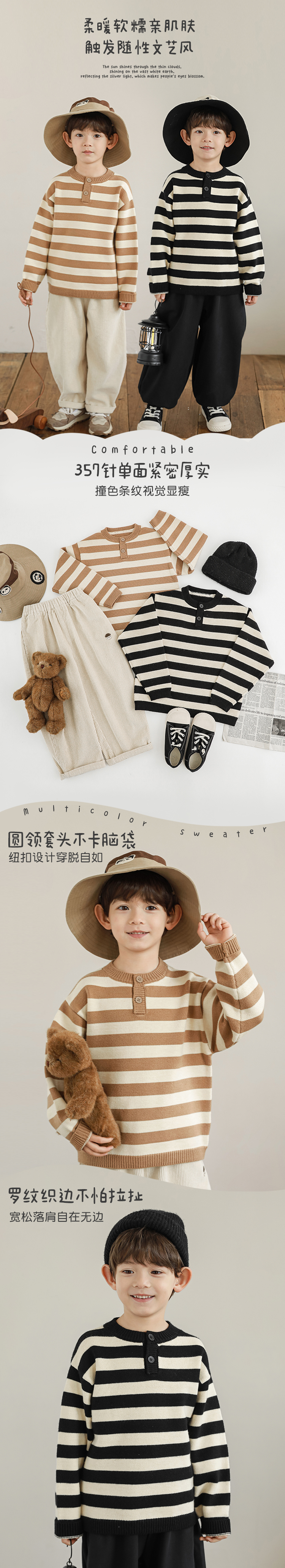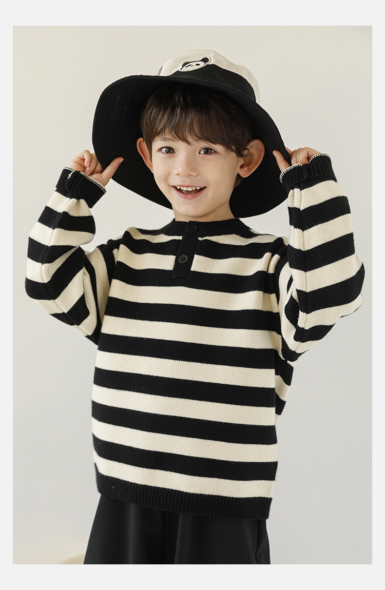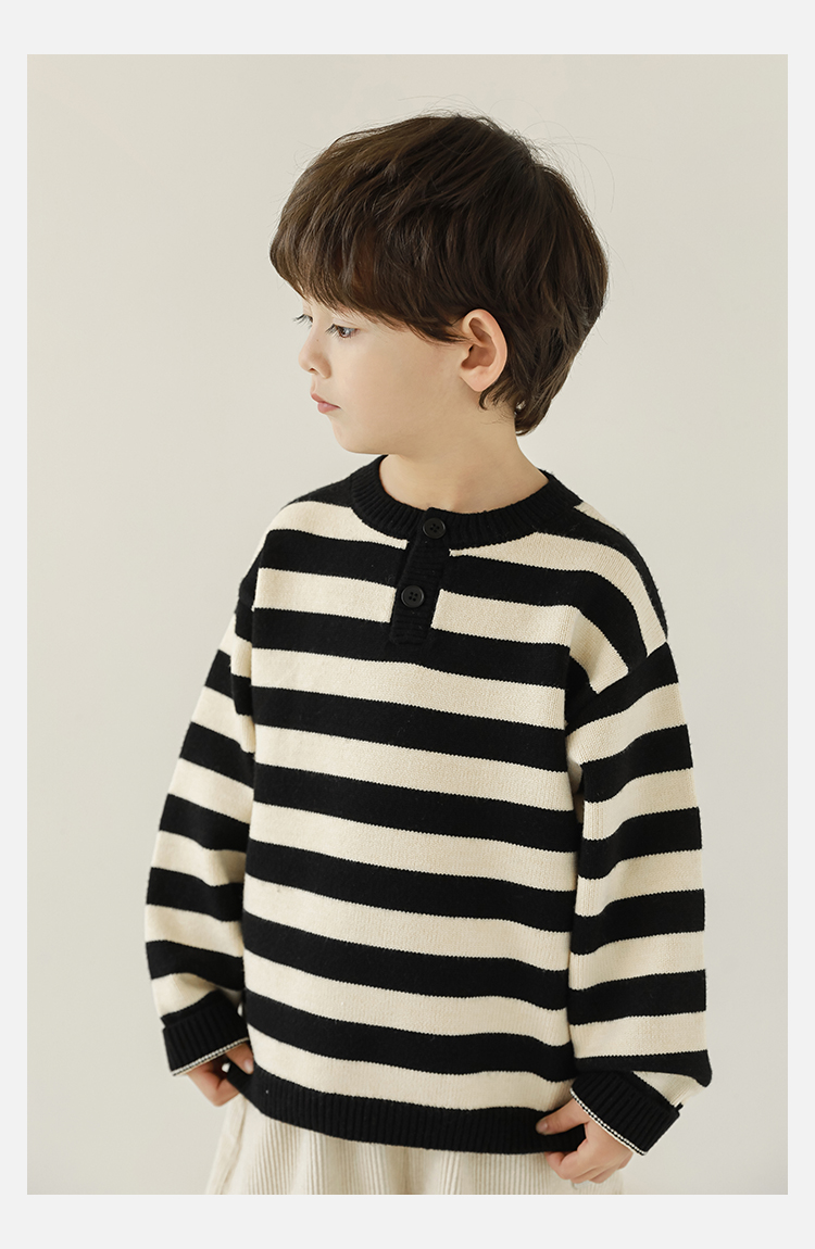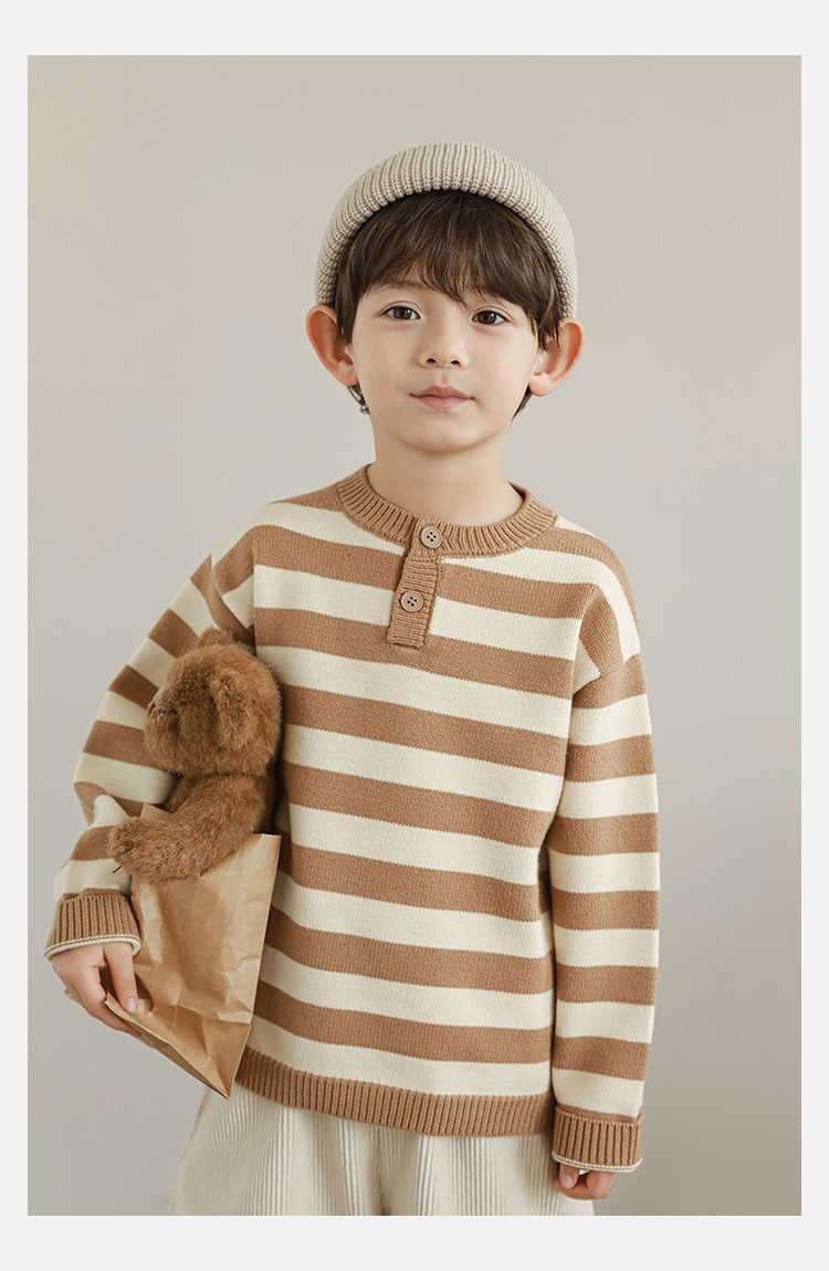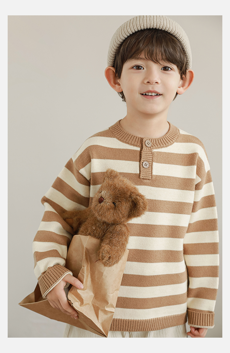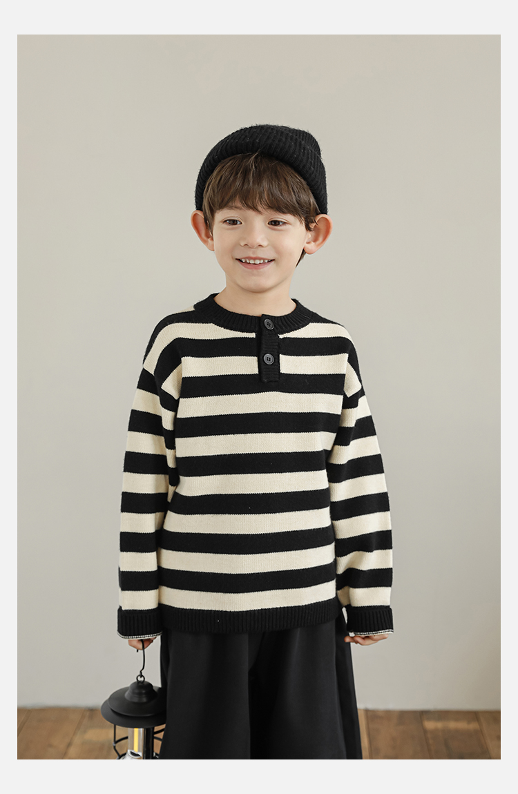 우리부이 남아용 2025 신상 라운드넥 배색 스트라이프 스웨터 겨울용 두꺼운 따뜻한 루즈핏 니트셔츠 트렌디스토어 가기