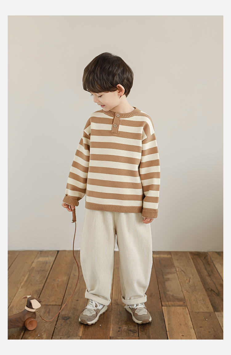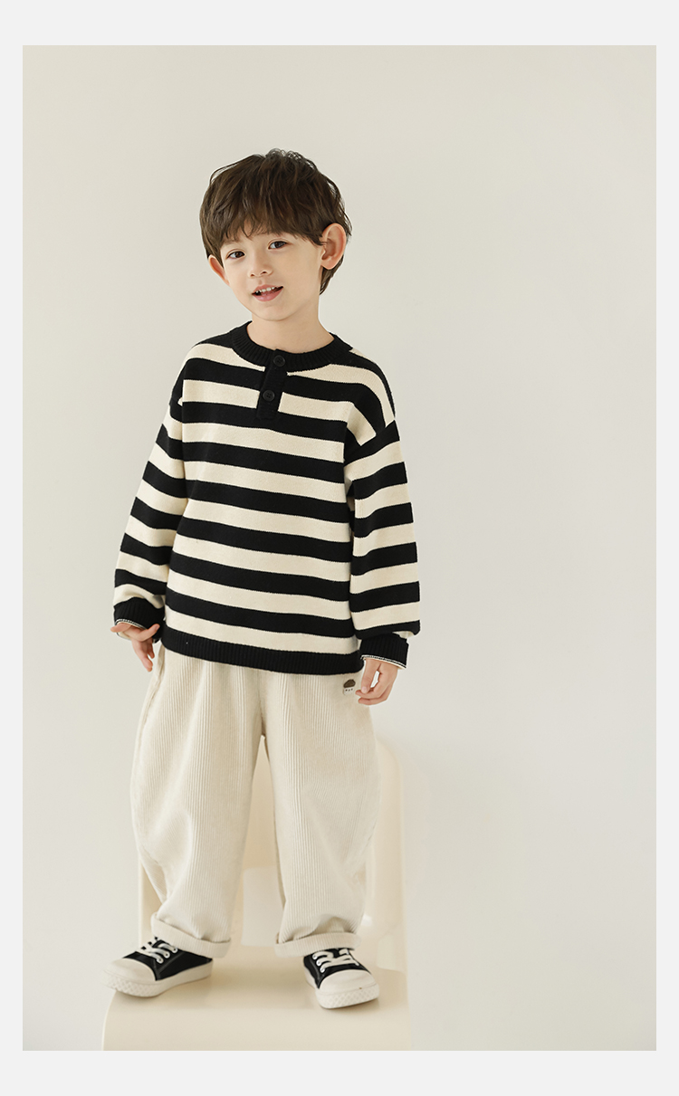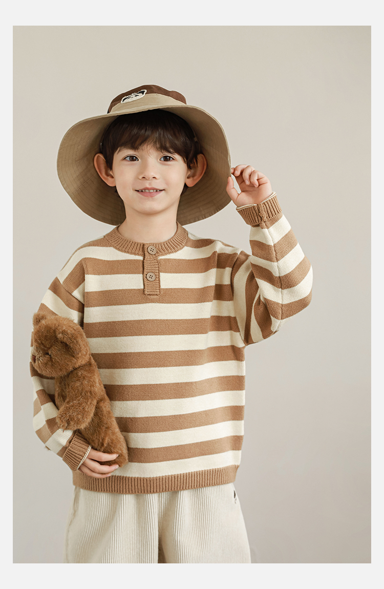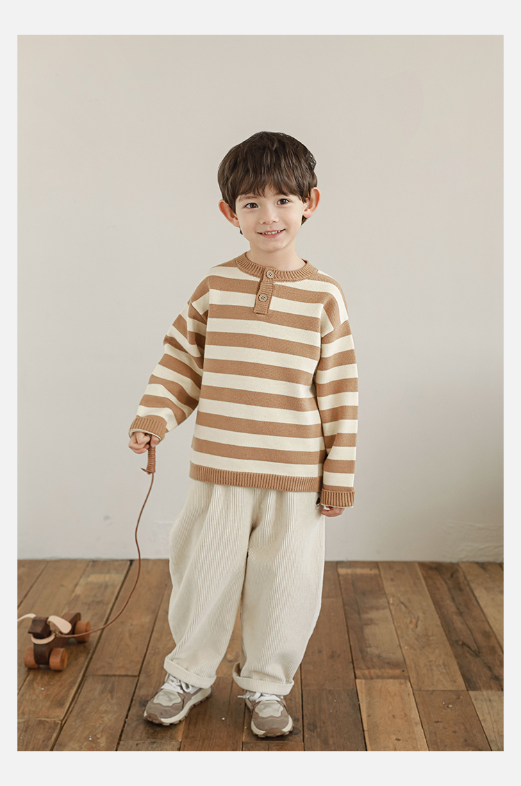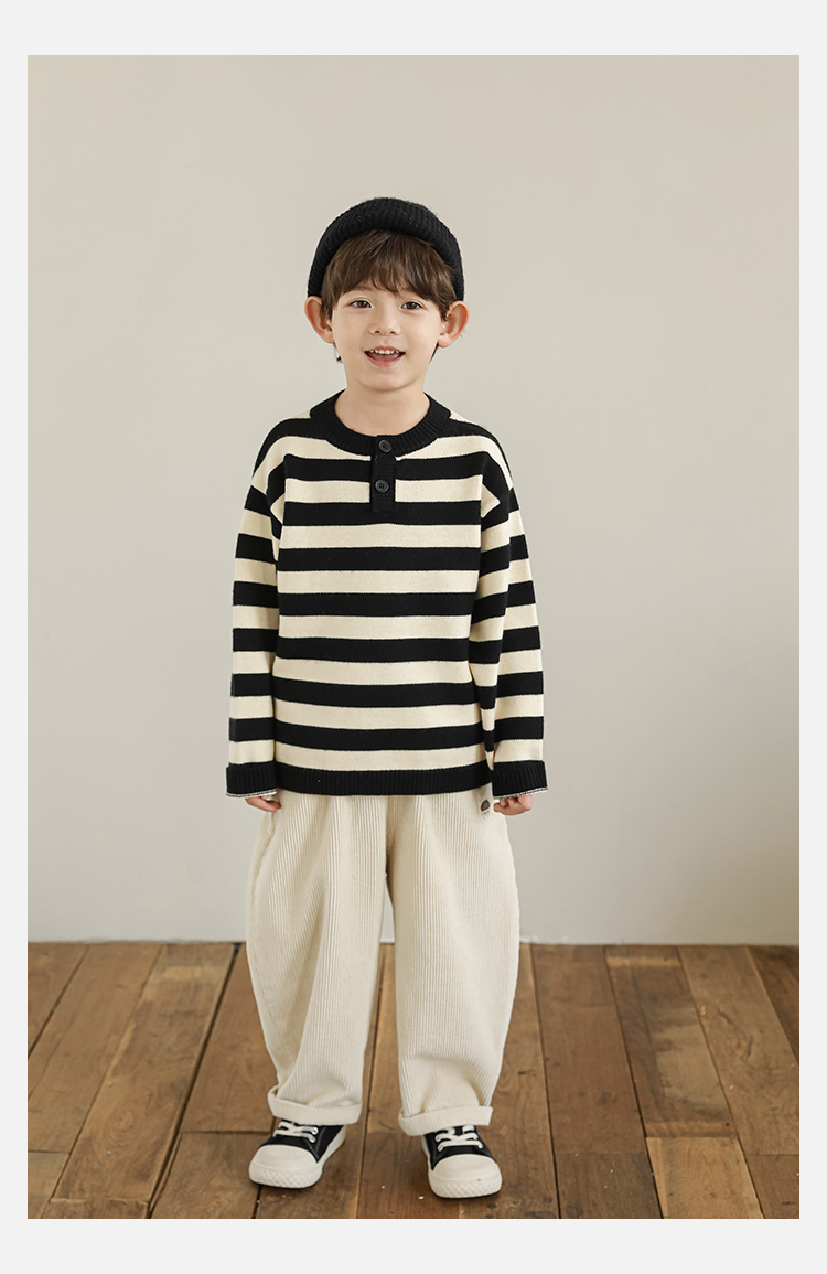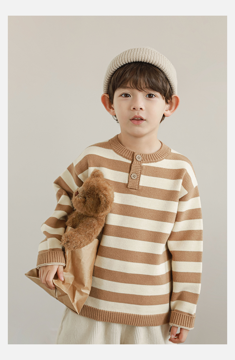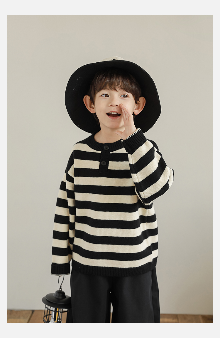 우리부이 남아용 2025 신상 라운드넥 배색 스트라이프 스웨터 겨울용 두꺼운 따뜻한 루즈핏 니트셔츠 트렌디스토어 가기