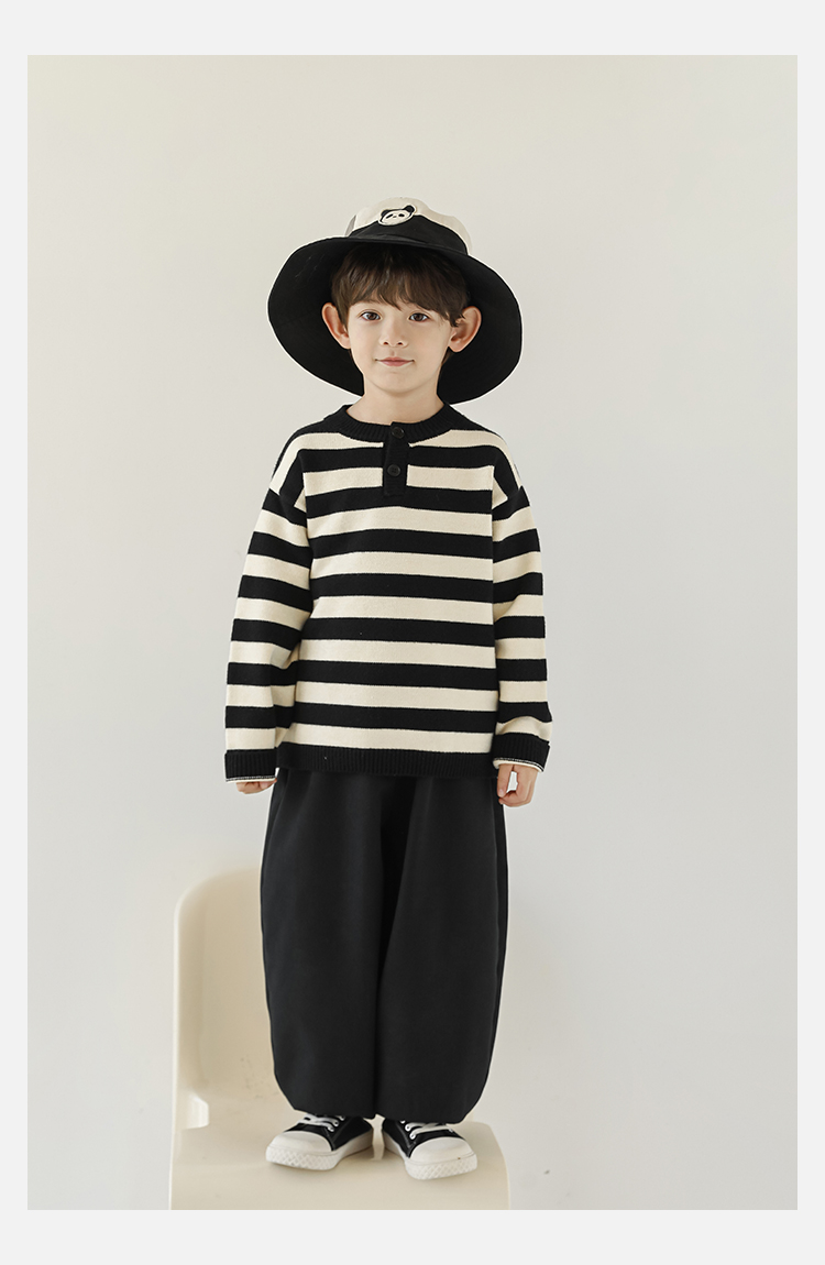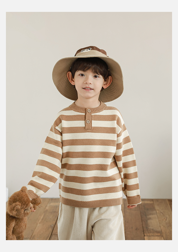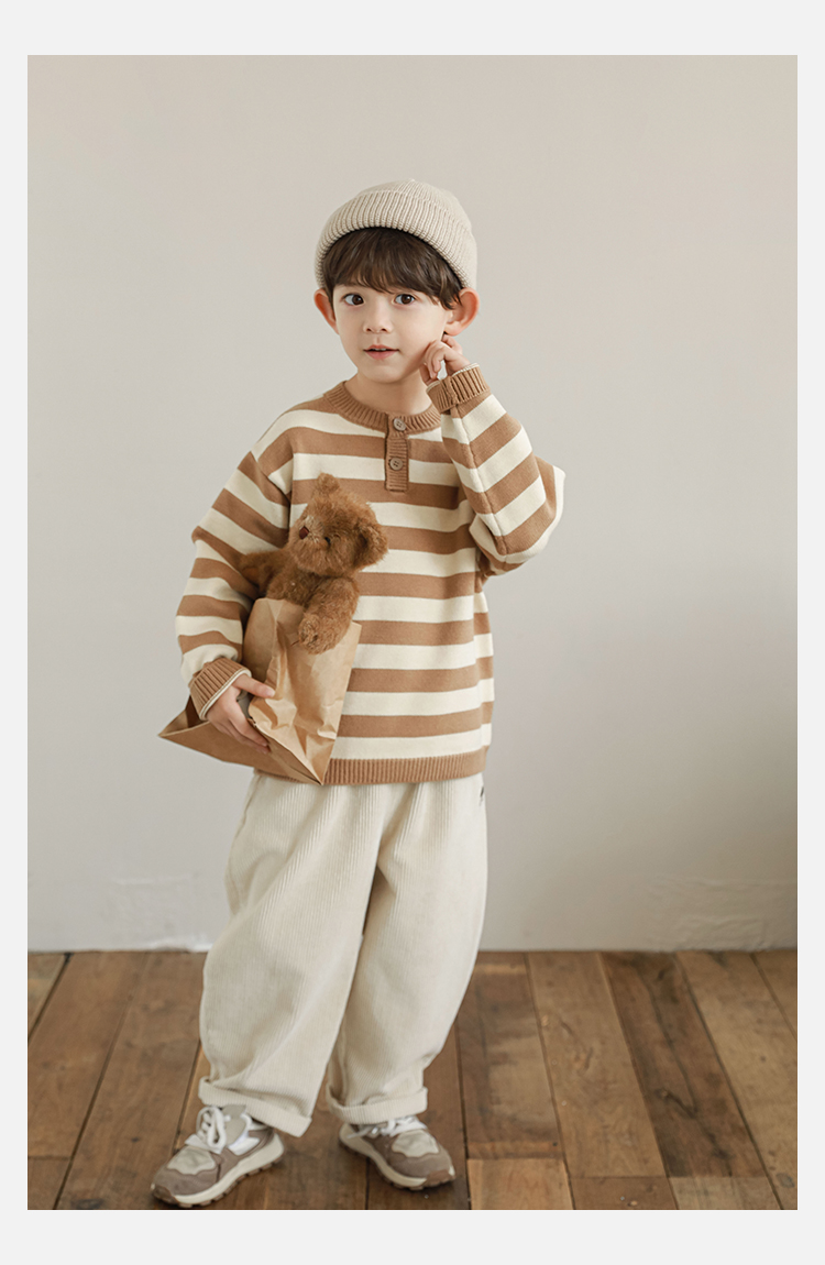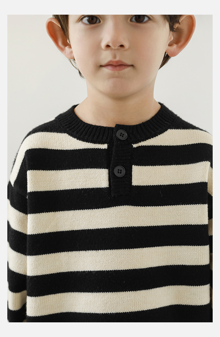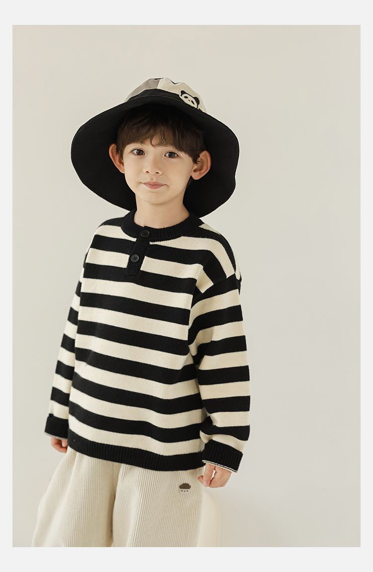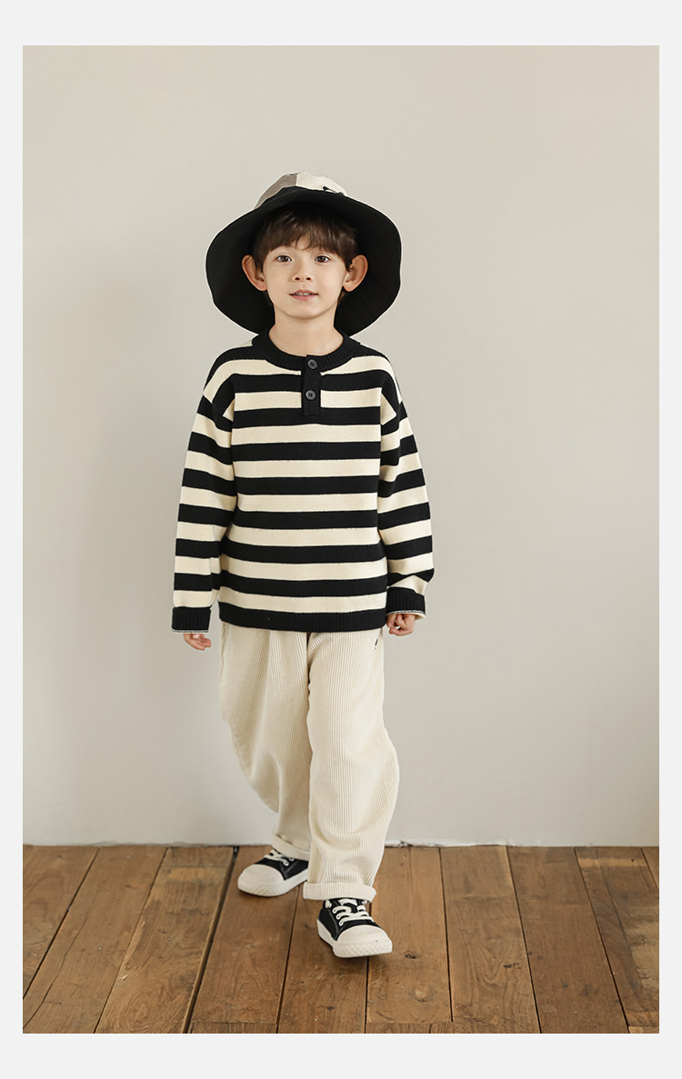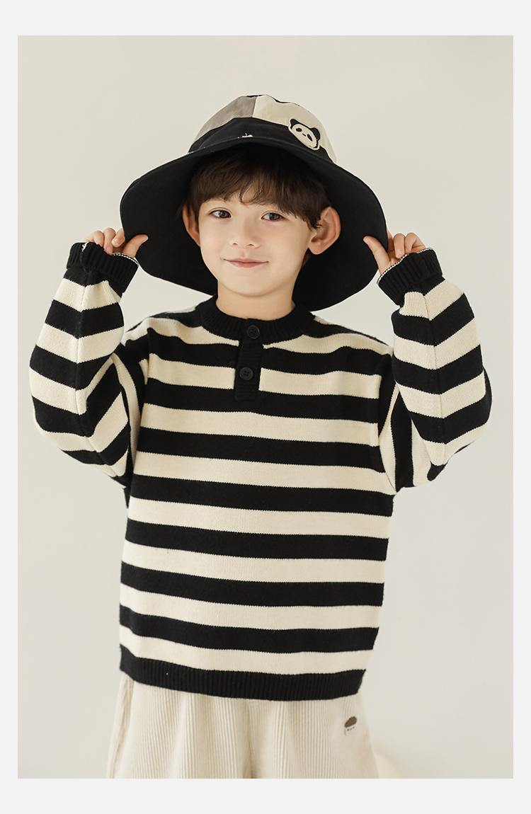 우리부이 남아용 2025 신상 라운드넥 배색 스트라이프 스웨터 겨울용 두꺼운 따뜻한 루즈핏 니트셔츠 트렌디스토어 가기