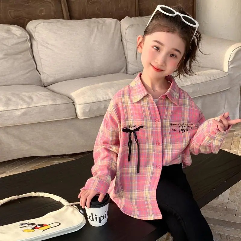 여자 셔츠 가을 스타일 2025 새로운 어린이 가을 탑 작은 셔츠 유행 여자 가을 큰 어린이 셔츠