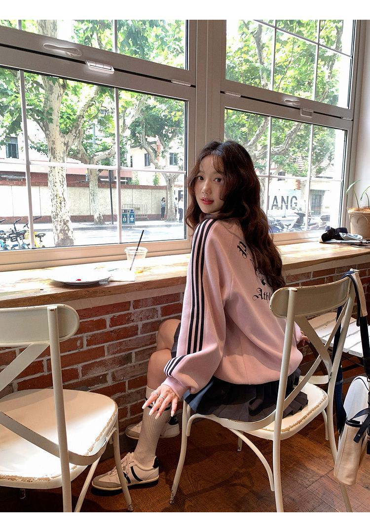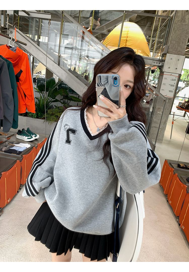 미국 스타일 코튼 프린트 V 넥 긴 소매 스웨트 셔츠 여성의 이른 가을 그레이 독특한 레이스 바느질 느슨한 캐주얼 탑