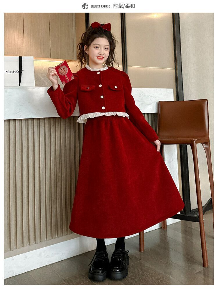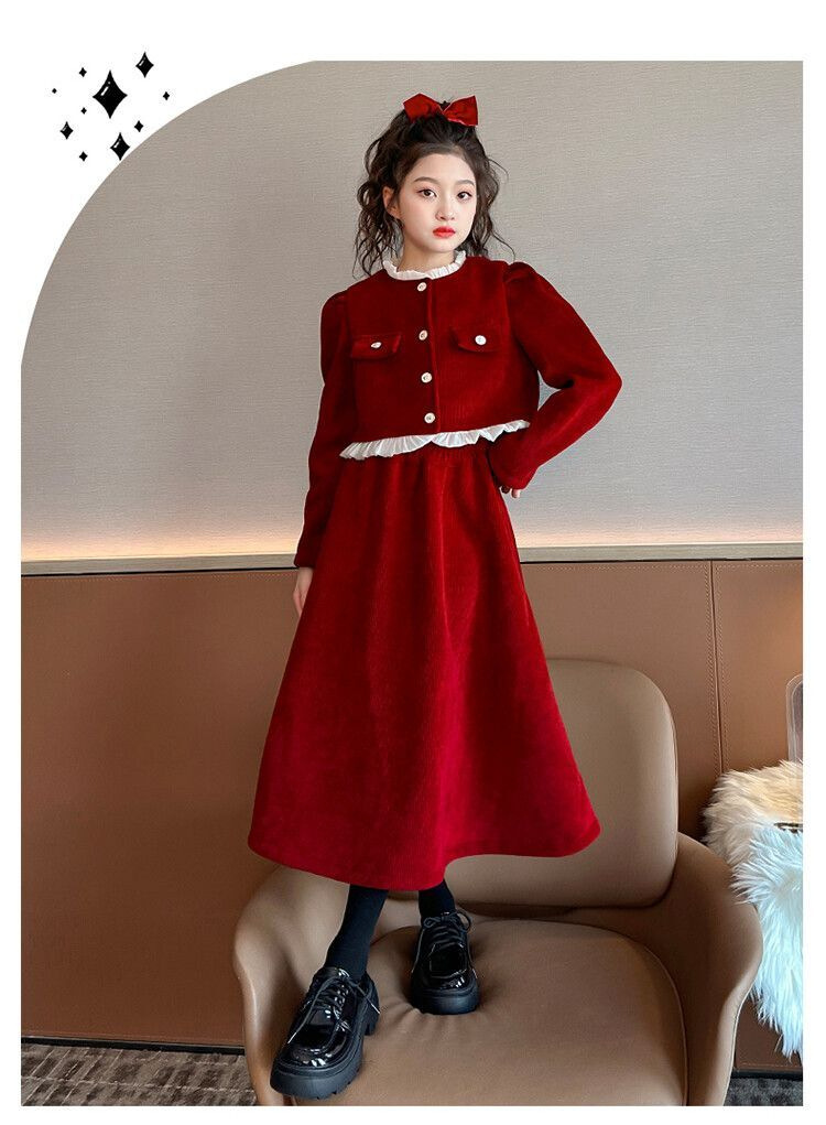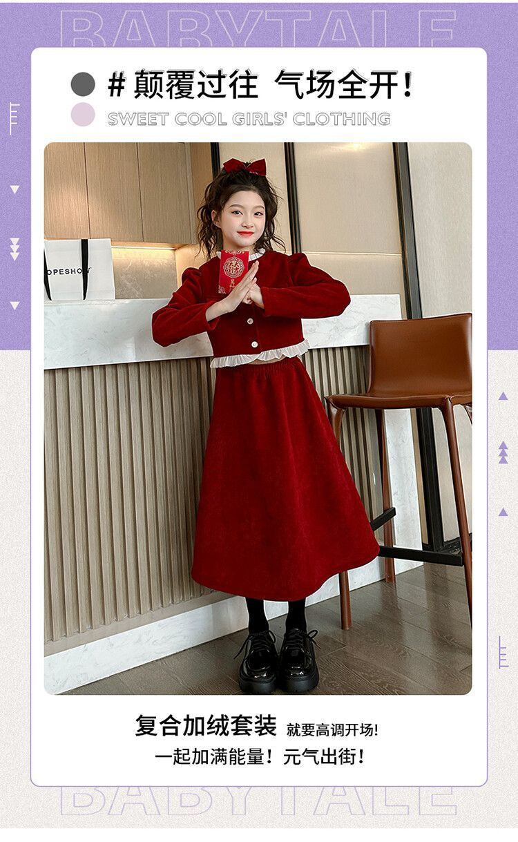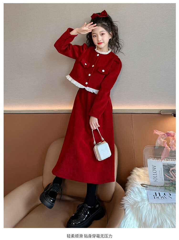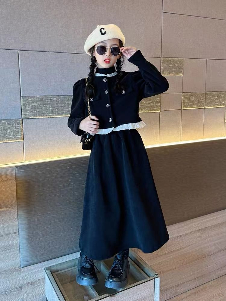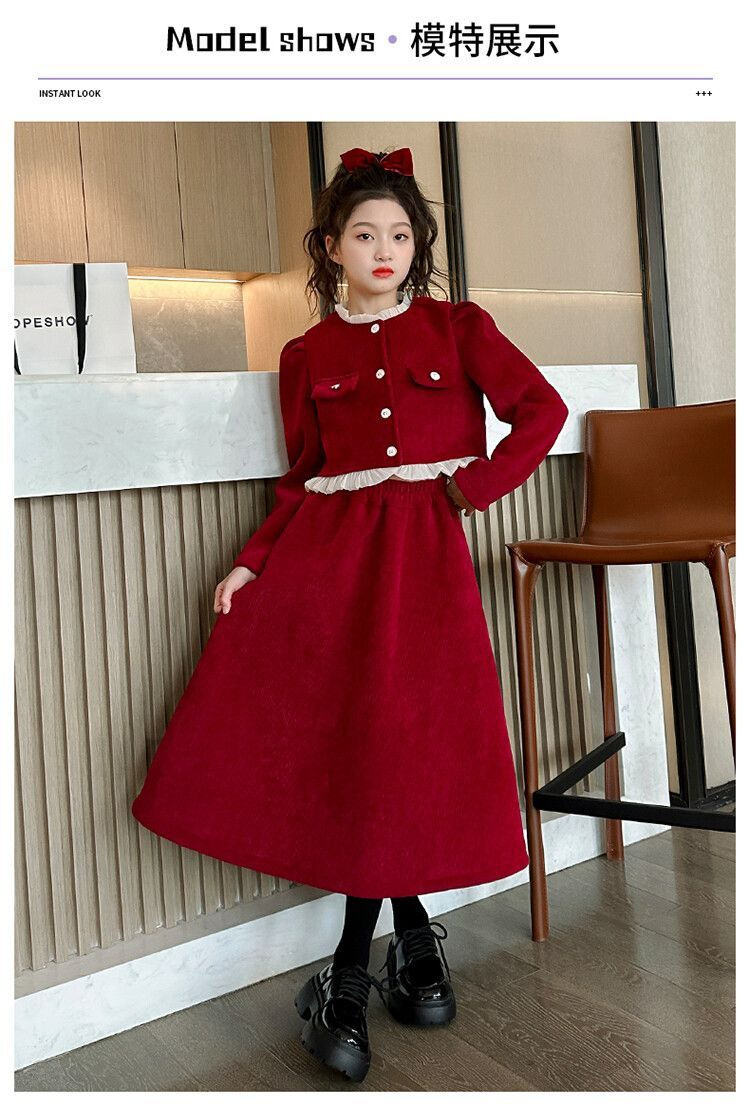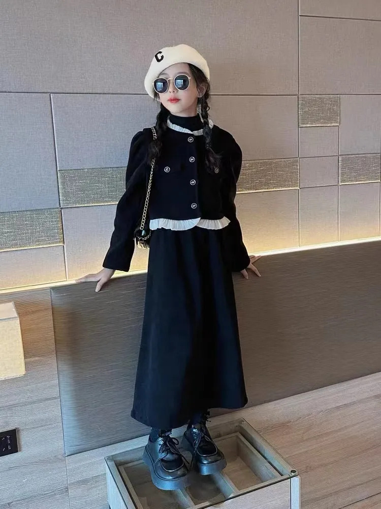 소녀의 세트 스커트 가을과 겨울 2024 새로운 어린이 세련된 유행 소녀의 두꺼운 작은 샤넬 스타일 재킷 투피스 세트