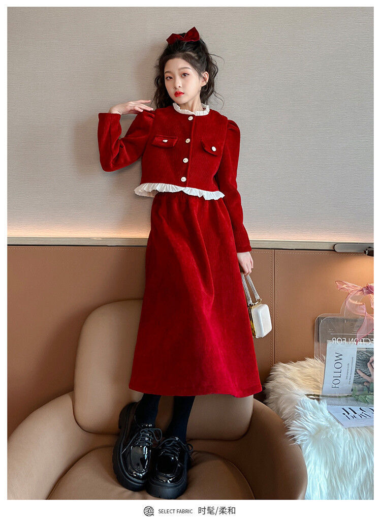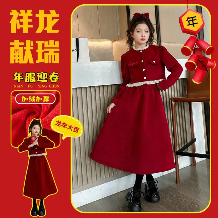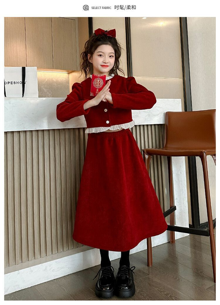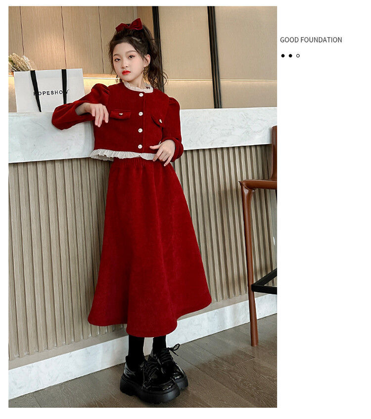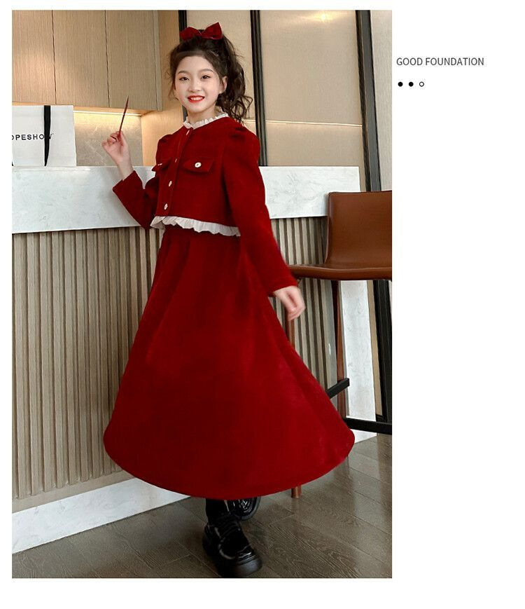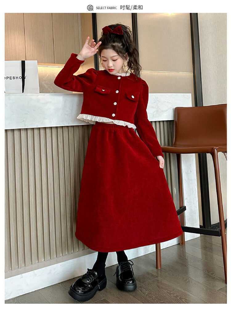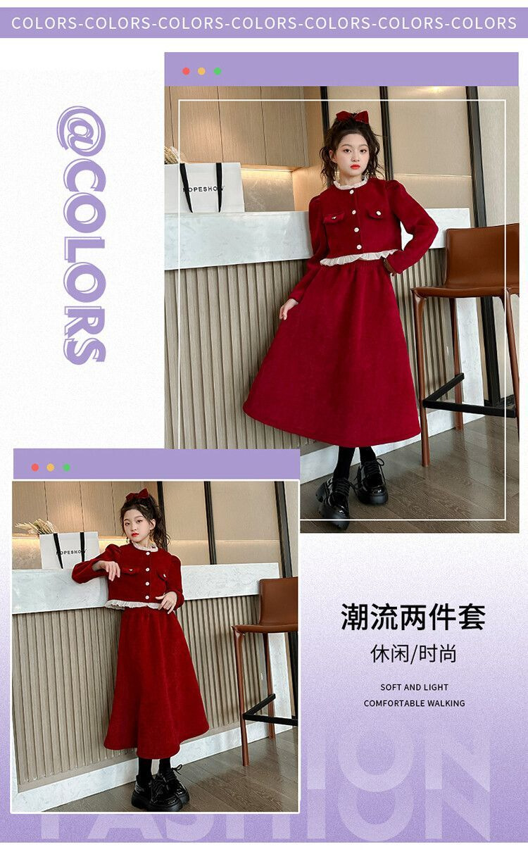 소녀의 세트 스커트 가을과 겨울 2024 새로운 어린이 세련된 유행 소녀의 두꺼운 작은 샤넬 스타일 재킷 투피스 세트