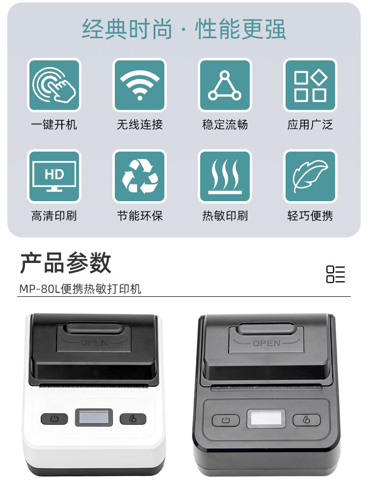 告别传统的点阵式打印机,现在,我们为您提供更多高效便携式打印机!这款MP-80L迷你型蓝牙热敏打印机将轻量,卓越的连接性和超长的电池寿命集于一身。手持数据打印使其成功应用于各种领域。打印机可以由可充电电池供电。紧凑的设计可让您随时随地将其放入包中以便轻松使用。