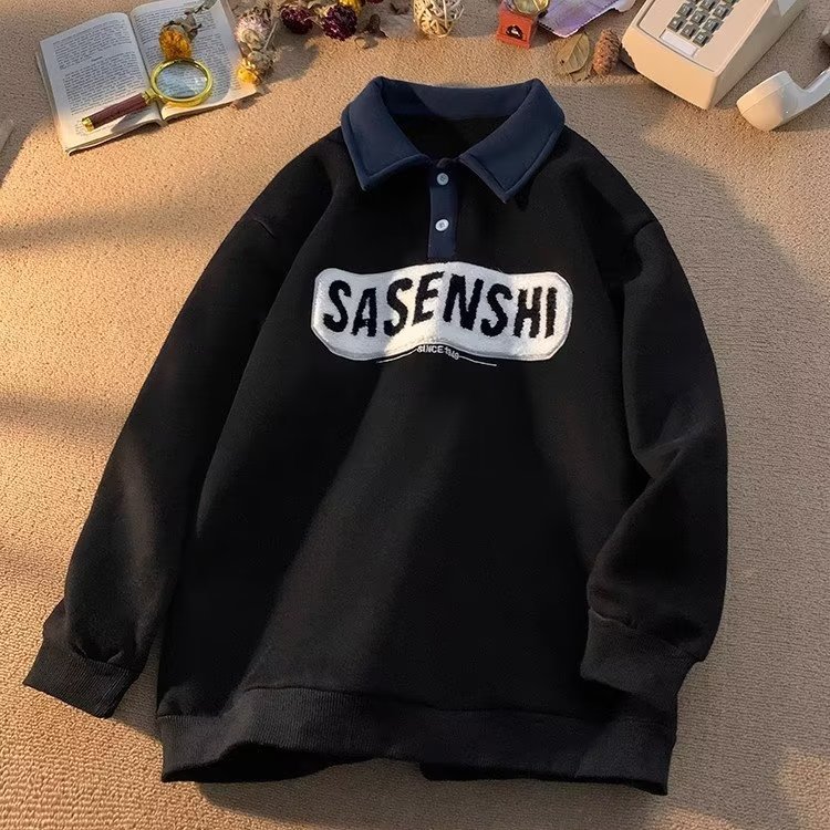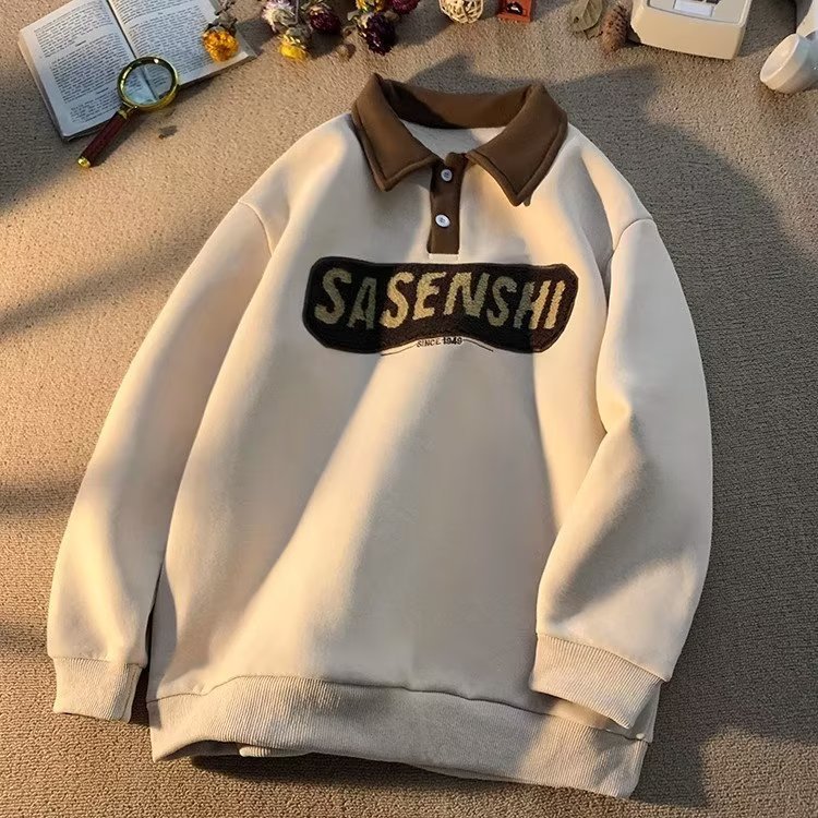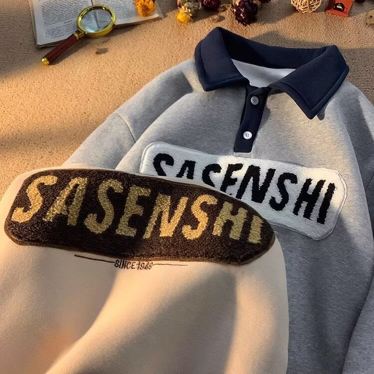 폴로 칼라 스웨트 셔츠 남자의 가을과 겨울 미국 스타일 레트로 무거운 아카데미 스타일 자수 탑 루즈 기모 옷깃 재킷스토어 가기