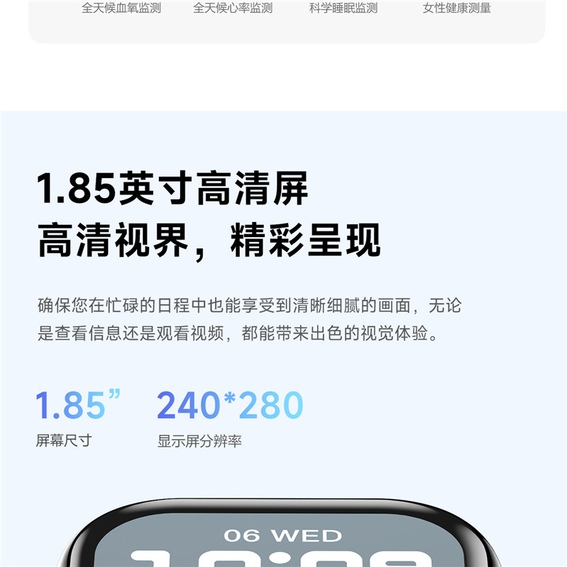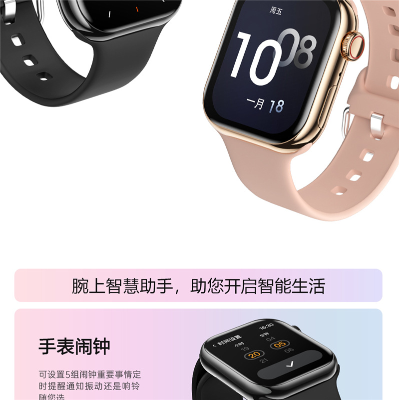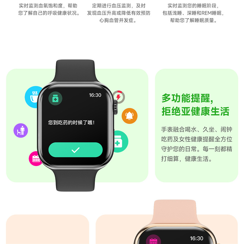 主要功能 | 基本功能:电话(联系人、通话记录、拨号键盘、通话设置、SOS)、消息推送、运动、计步、睡眠检测、音乐、心率、血压、血氧、体温、女性健康检测、吃药提醒、喝水提醒、久坐提醒、风格切换、日历、语音助手、天气、拍照、计算器、呼吸、我的二维码、计时器、查找手机、秒表、运动轨迹、闹钟、设置、恢复出厂设置、喝水提醒、久坐提醒、分屏(向右滑动)、小组件(向左滑动) 设置功能:灵动岛、息屏时间、亮度调节、亮度设置(熄屏指针)、按键自定义、抬手亮屏、振动强度、勿扰模式、密码设置、语言选择、省电模式、时间和日期设置、NFC、连接手机、蓝牙通话、恢复出厂设置、重启、关机、关于 下拉功能:勿扰模式、蓝牙开关、亮度调节、设置、关机、闹钟、密码锁、风格切换、亮度设置(熄屏指针)、连接手机 提醒功能:吃药提醒、女性生理健康提醒、喝水提醒、久坐提醒 |