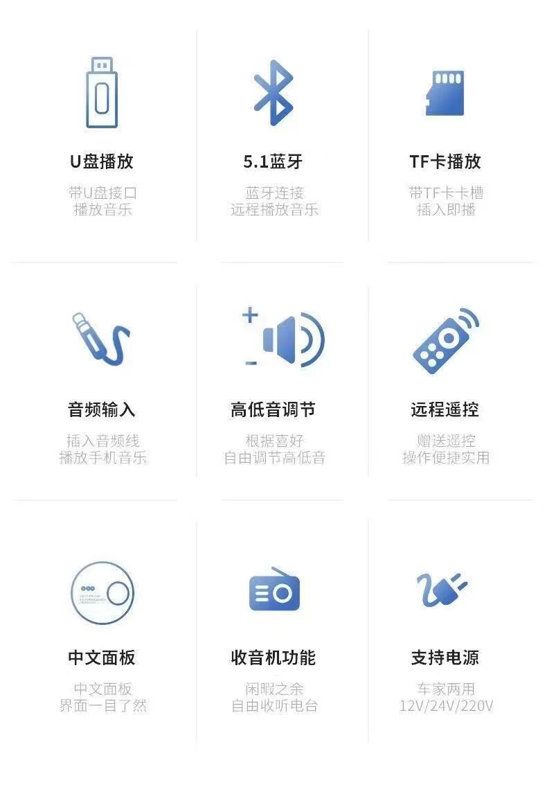 • 새로 업그레이드된 5inch 스퀘어(블루투스/카드/USB 디스크/AUX 지원)