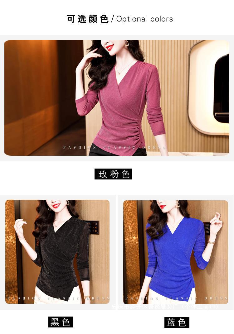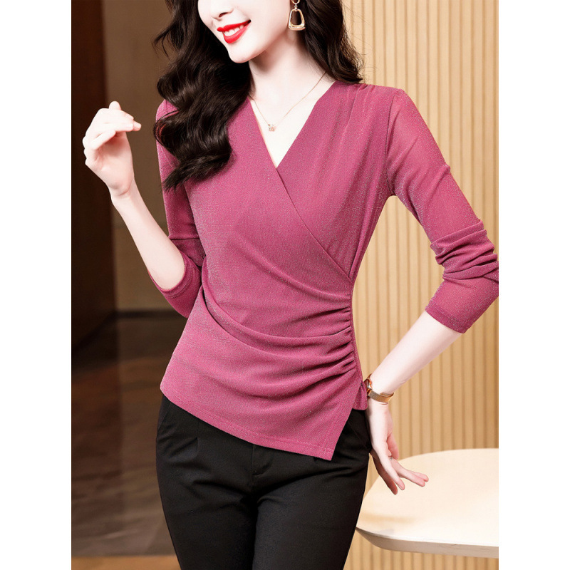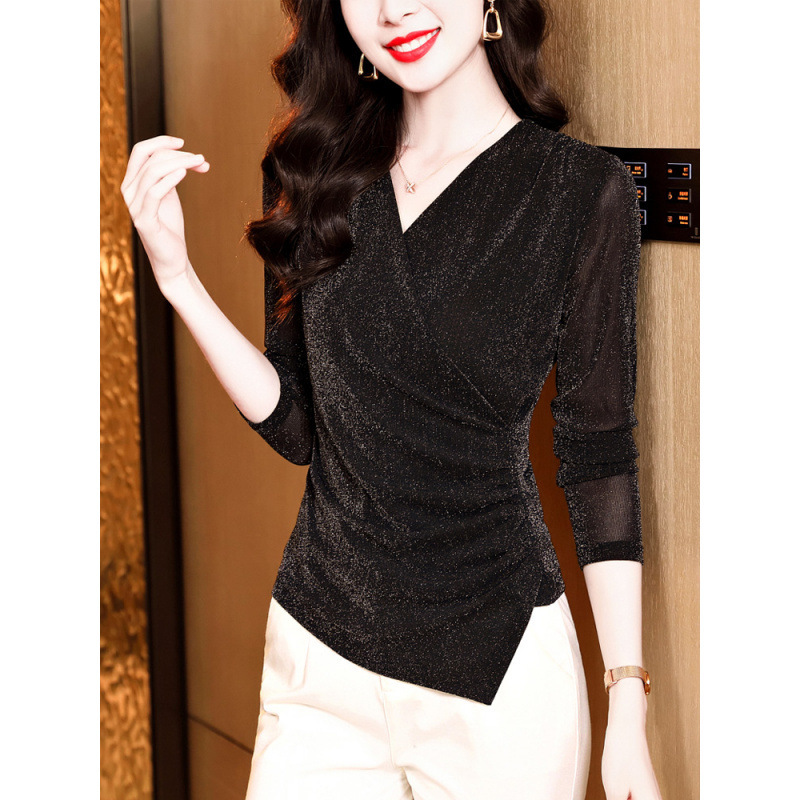 크로스 V 넥 메쉬 티셔츠 여성 긴팔 2024 가을 새로운 밝은 실크 셔츠 서양식 내부 레이스 바닥 셔츠 탑스토어 가기