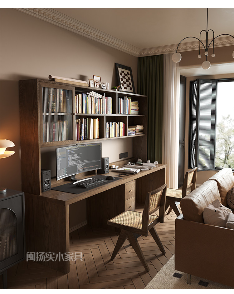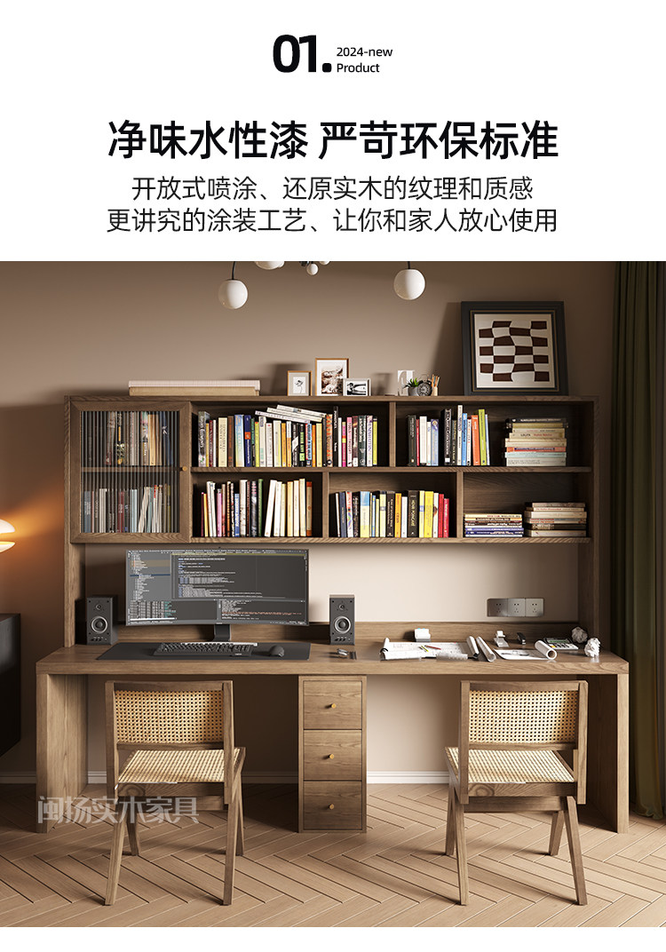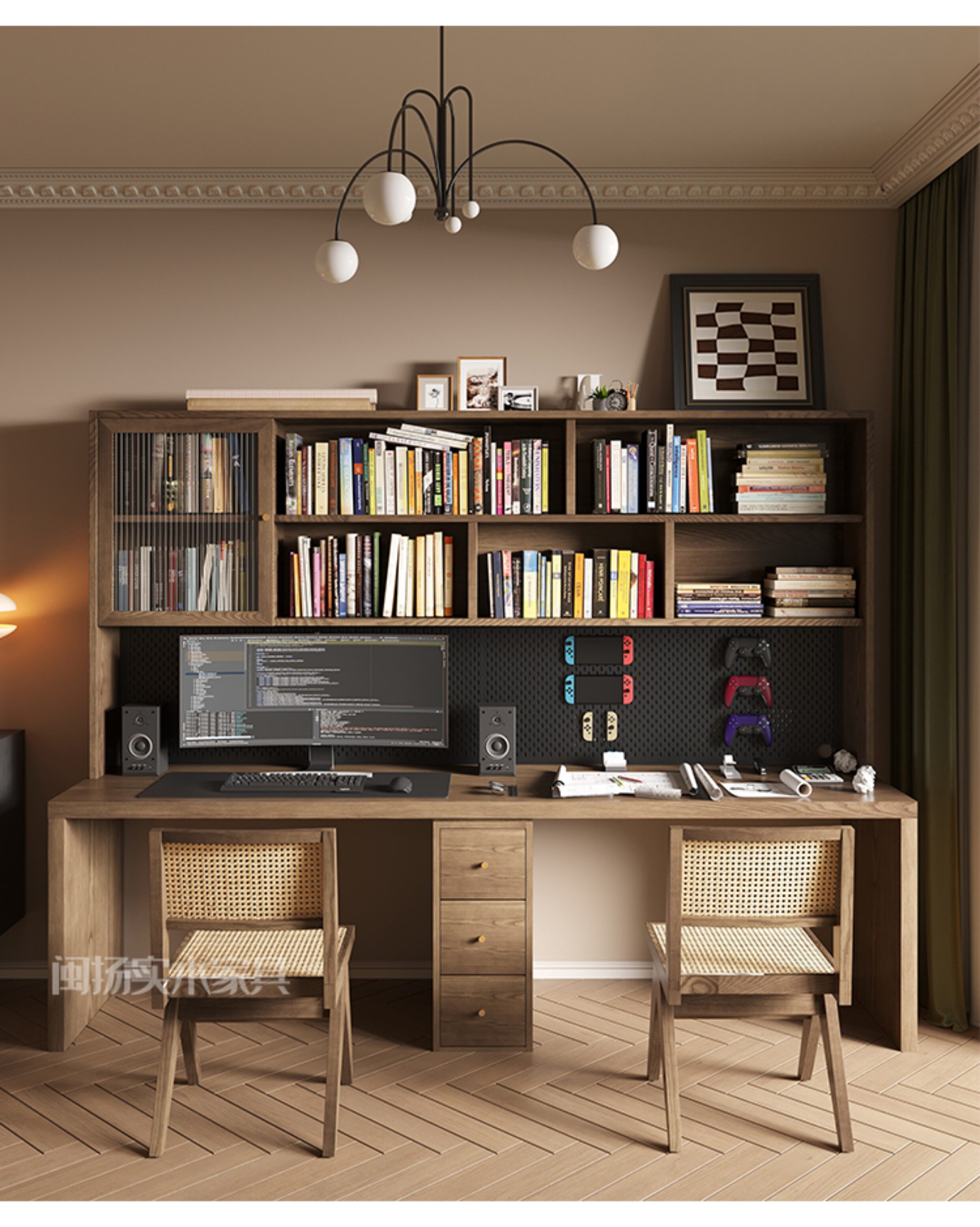 단단한 나무 더블 데스크 책장 홈 긴 스트립 테이블 작업대 연구 벽 연구 컴퓨터 책상 책장 통합