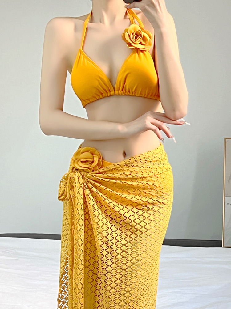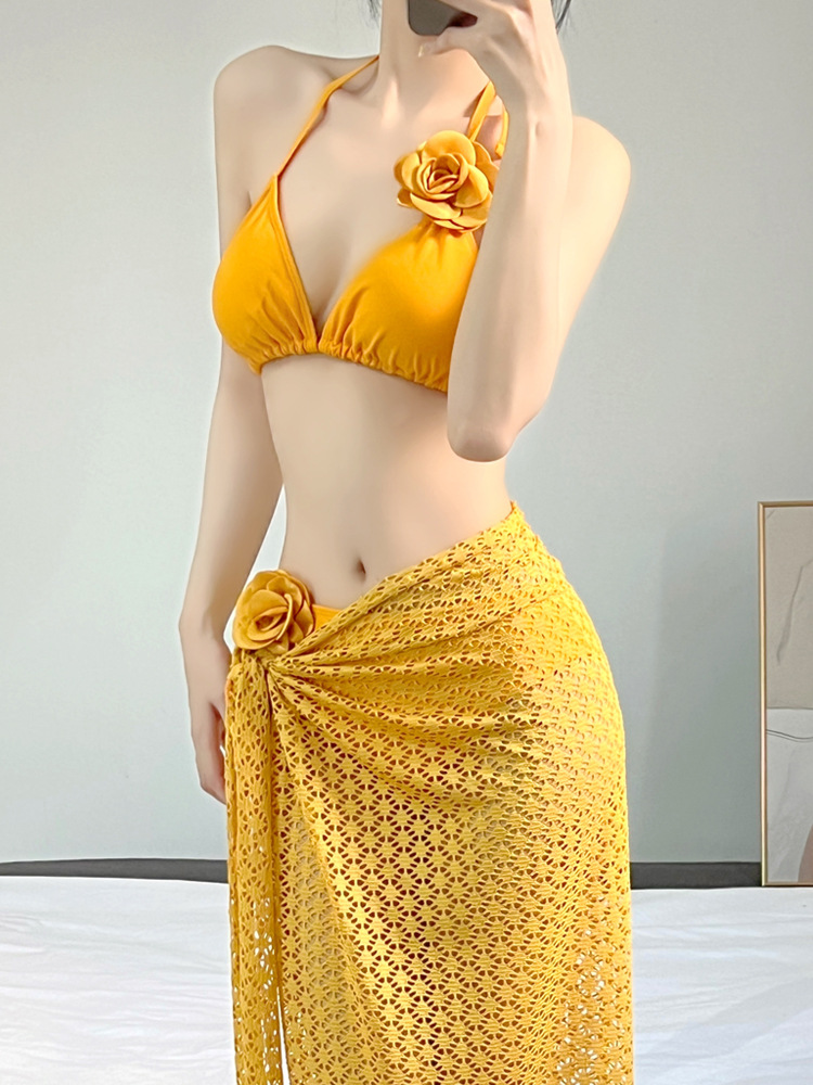 새로운 교수형 목 스트랩 비키니 스테레오 로즈 메쉬 힙합 섹시 스플릿 긴 원피스 수영복 세트 온천
