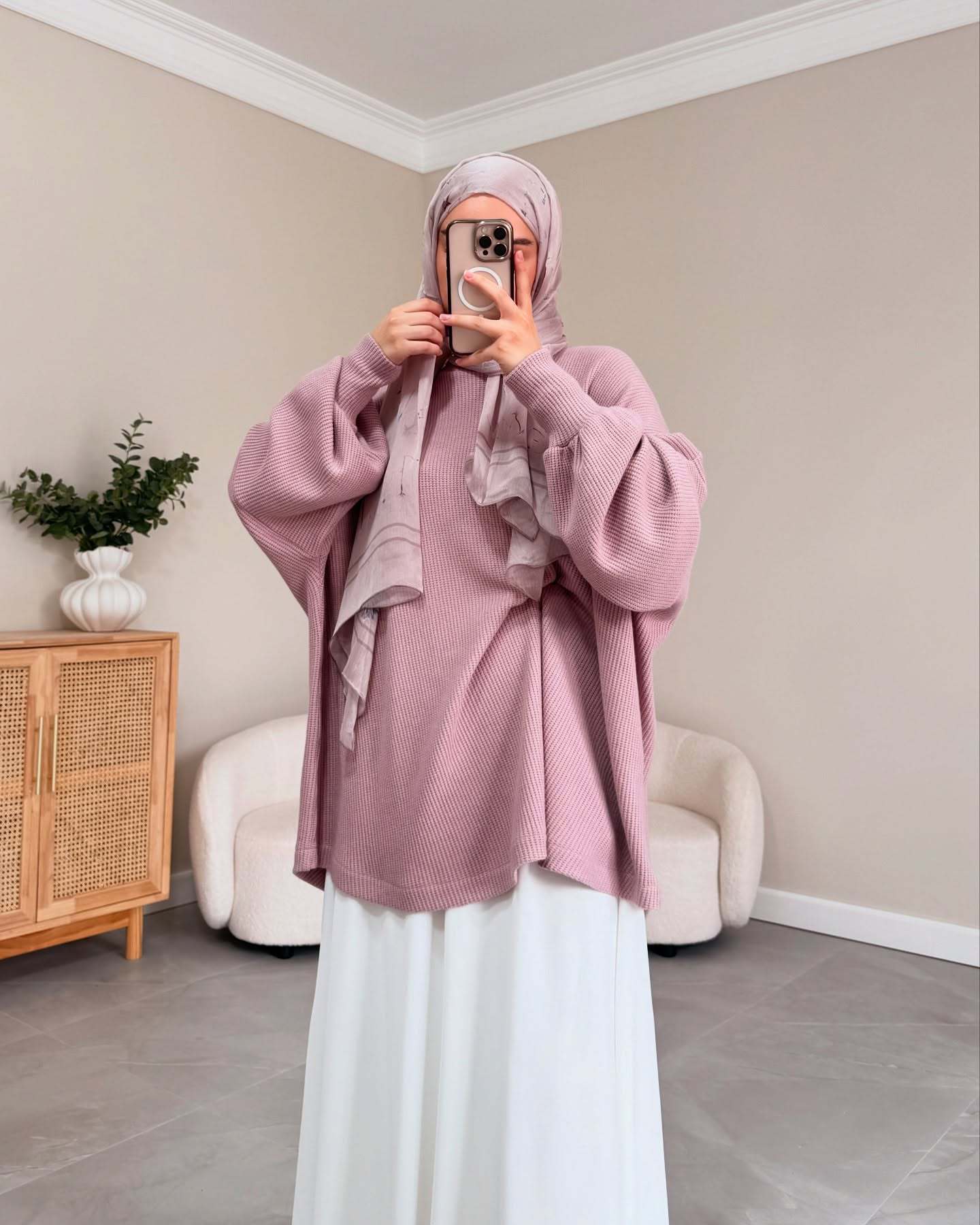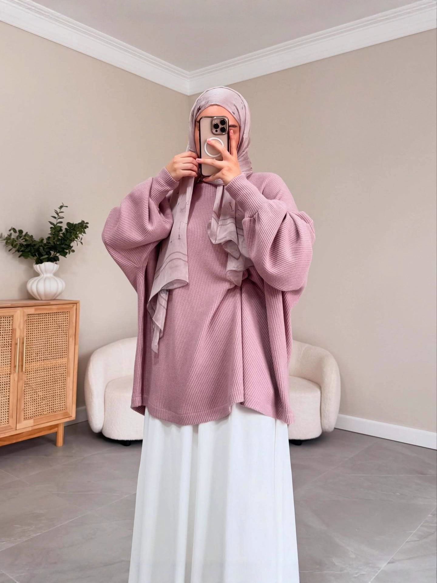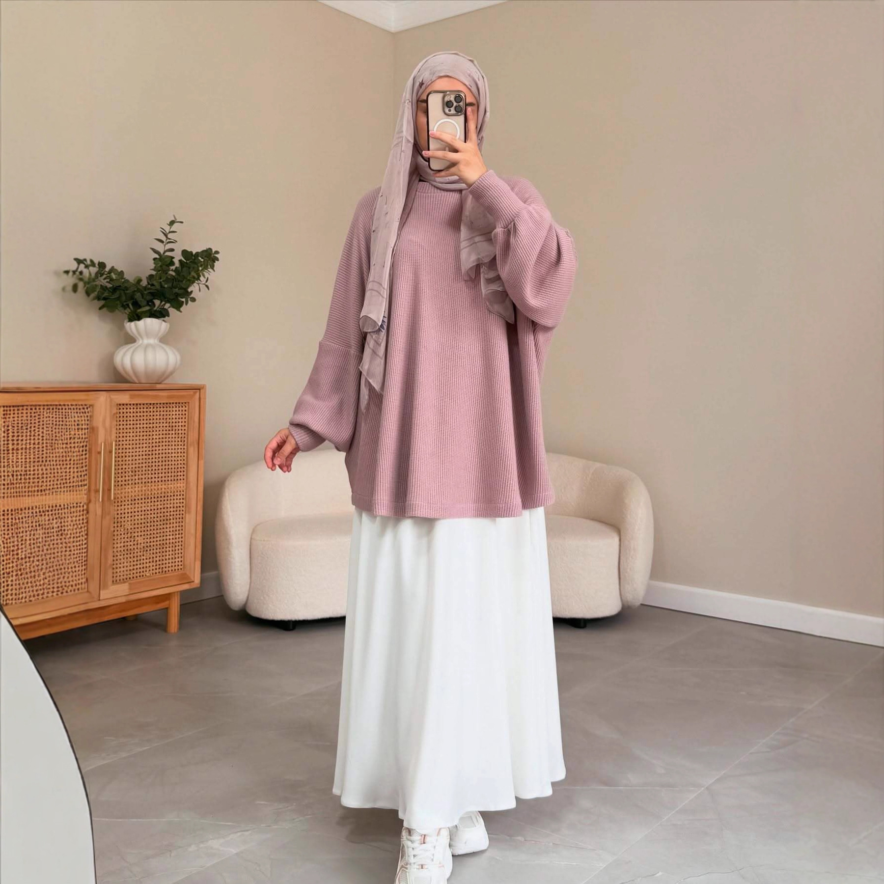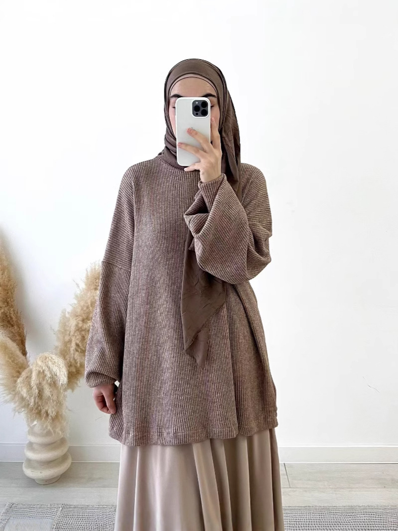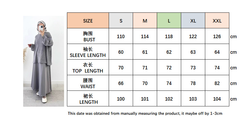 2024 국경 중동 무슬림 여성의 게으른 회색 풀오버 니트 탑 대형 스윙 하프 스커트 세트 패션 와이드스토어 가기