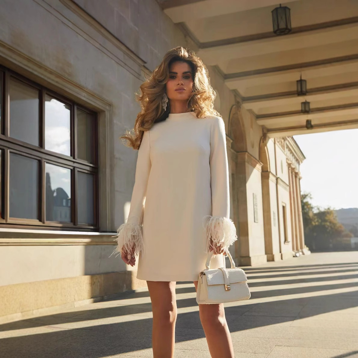 유럽과 미국 국경 가을과 겨울 새로운 패션 기질 긴 소매 사교계 바람 깃털 스티칭 원피스 1026