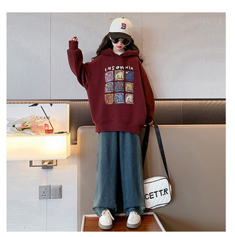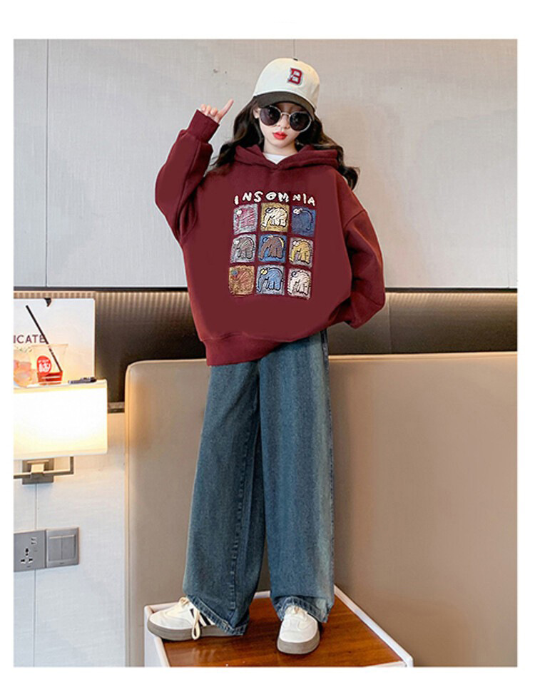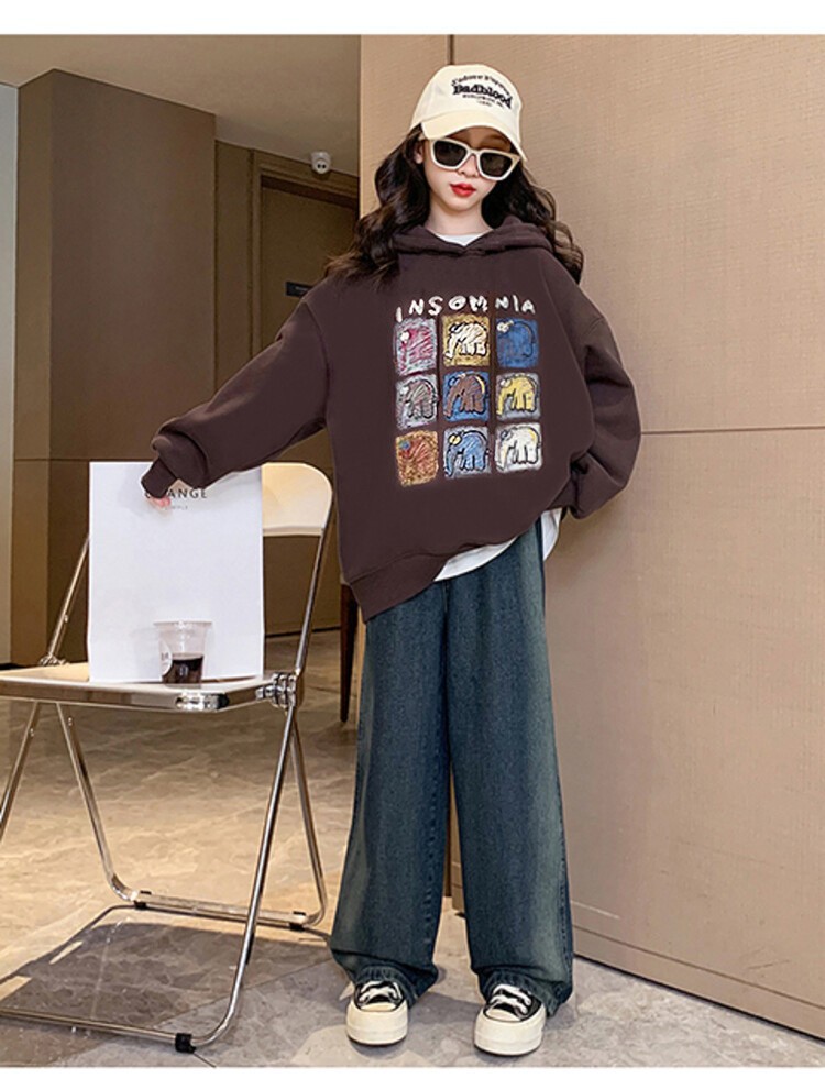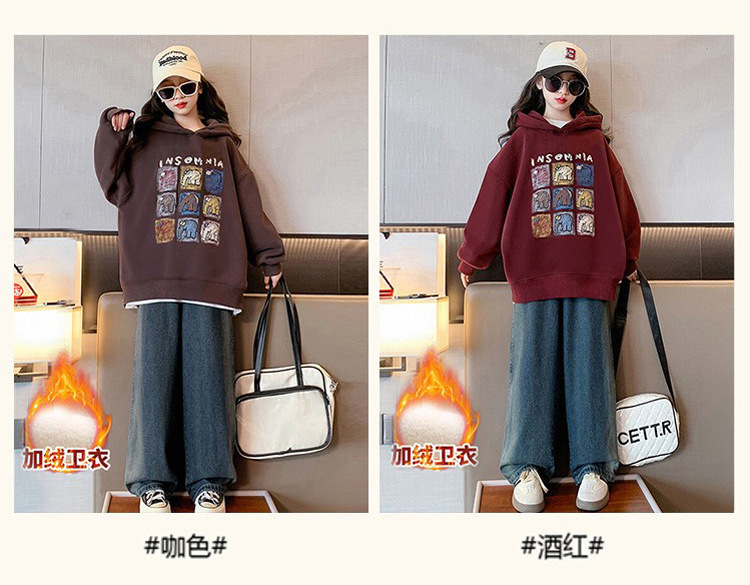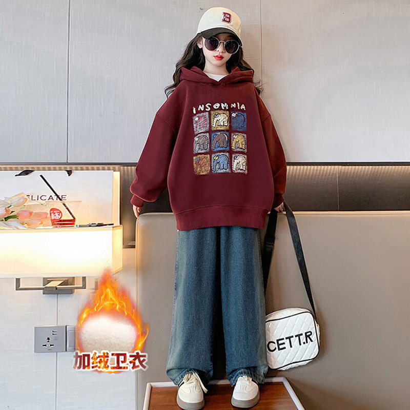 가을과 겨울 어린이 기모 두꺼운 미디 느슨한 캐주얼 후드 스웨트 큰 소녀 따뜻한 긴 소매 탑