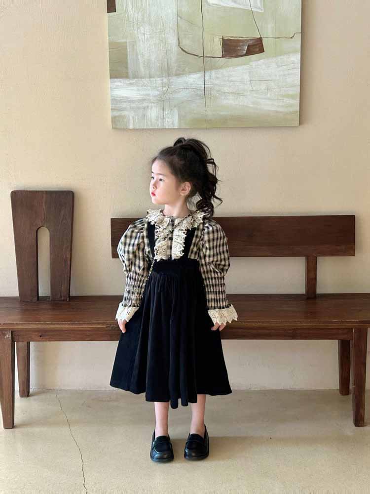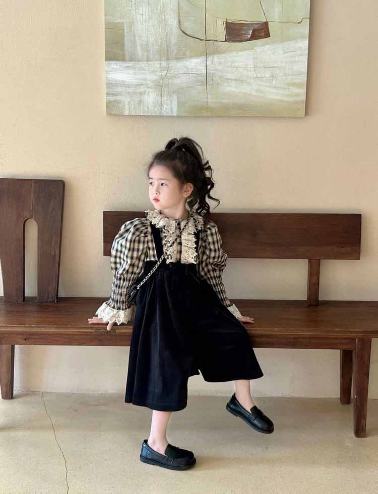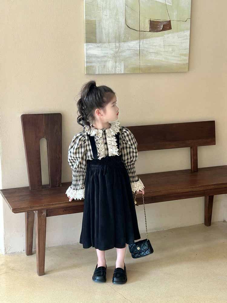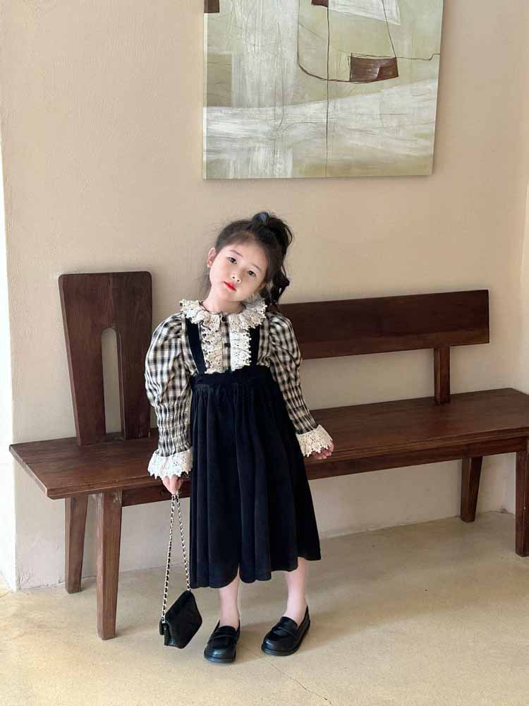 소녀 세트 가을 새로운 궁전 스타일 체크 무늬 셔츠 벨벳 멜빵 2 조각 어린이 머리 세트스토어 가기